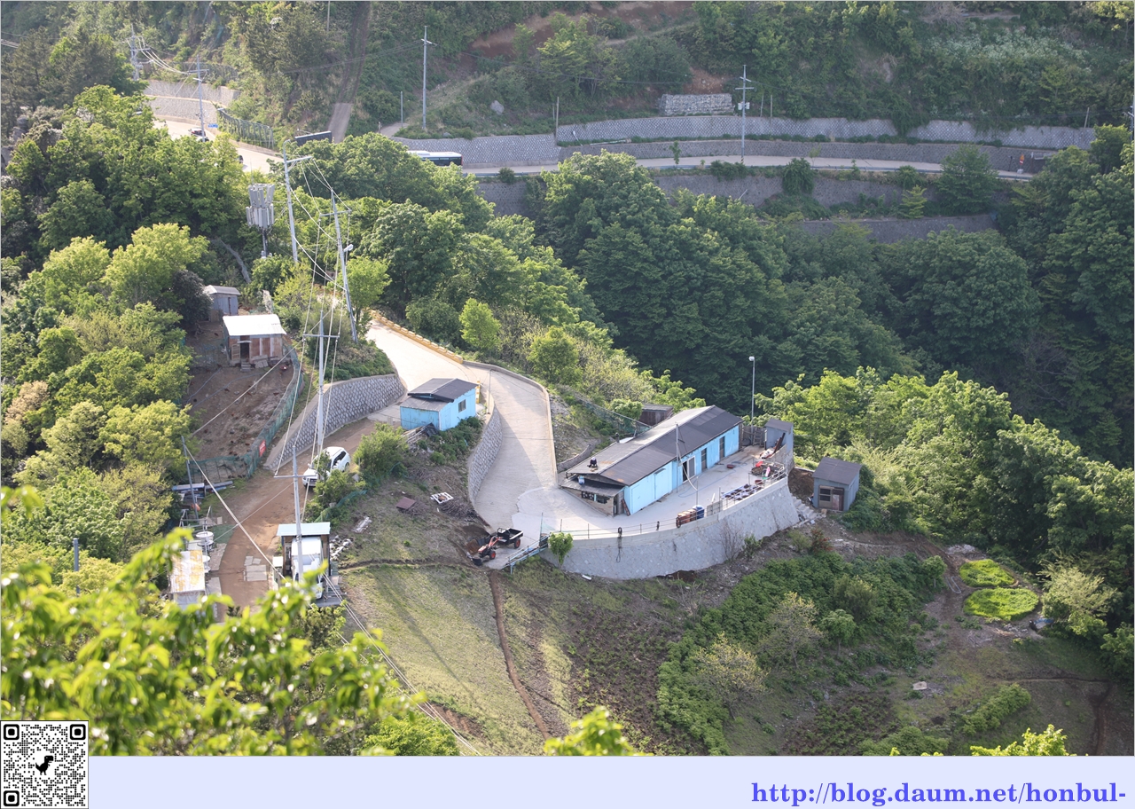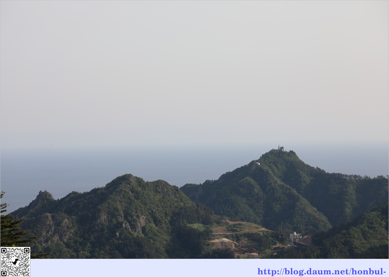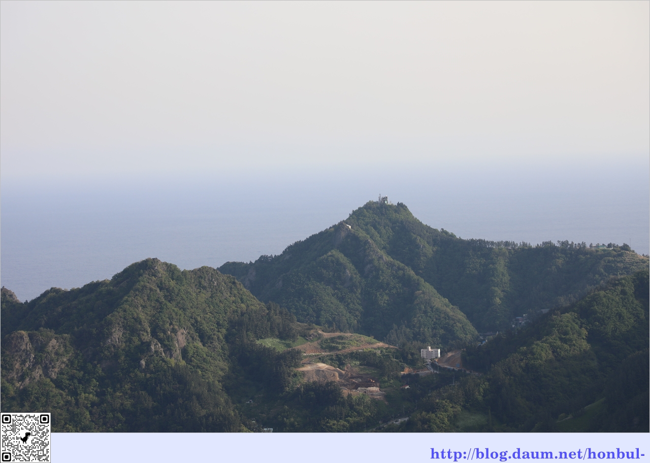 그 앞으로 능선에 하얗게 보이는 물체는 독도케이블카 전망대 건물이다.