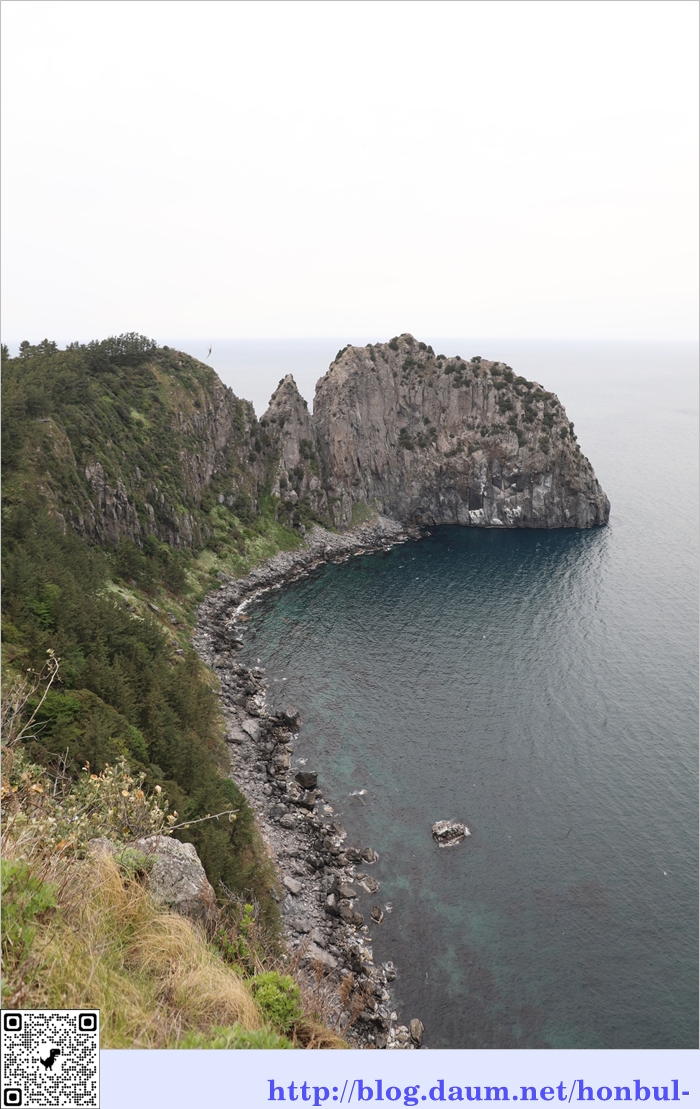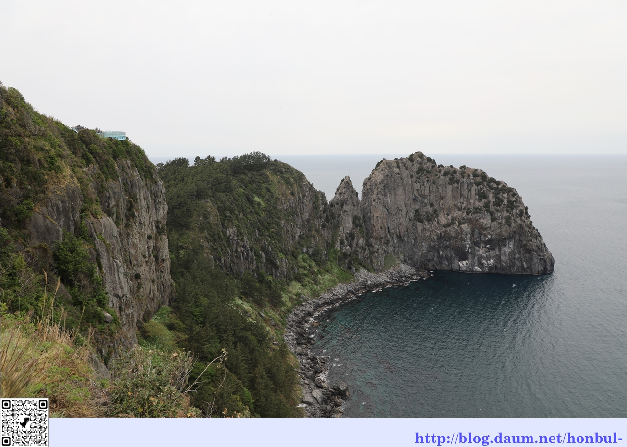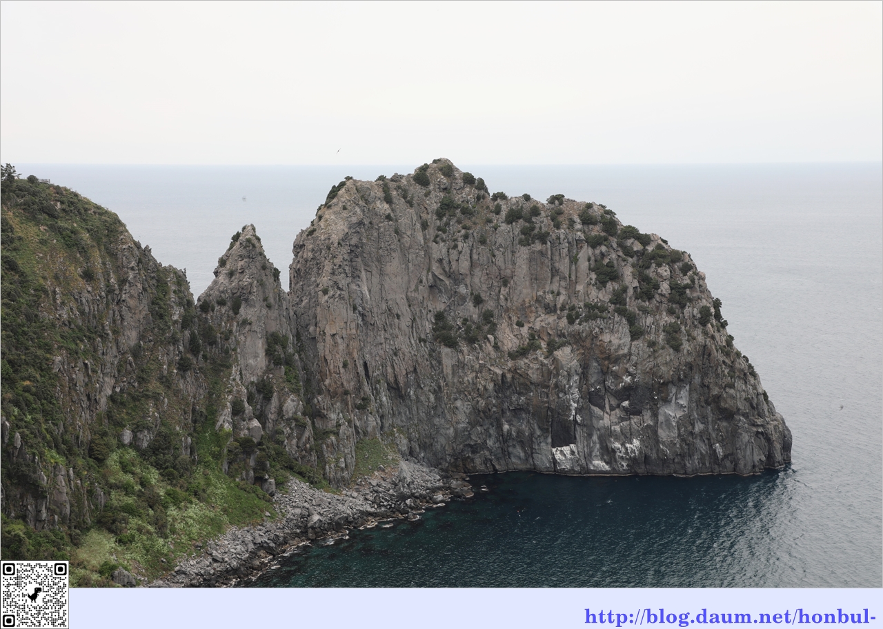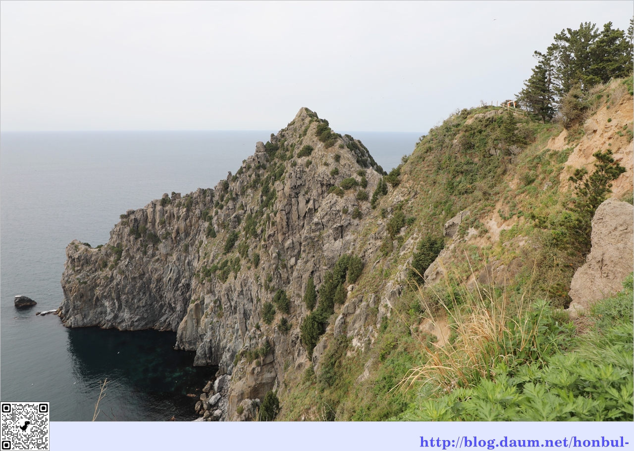 해안으로 흐른 절벽은 급격히 식으며 더러 주상절리 형태를 보인다.