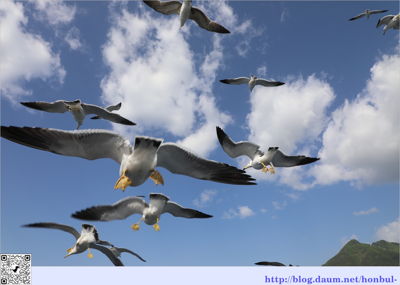 물에 떨어진 새우깡을 먹으로 바다에 뛰어드는 갈매기도 보인다.