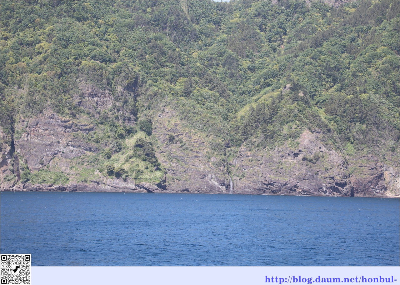 가운데 희미하게 2단으로 떨어지는 폭포는 육지에서 바로 바다로 떨어지는 국내 유일한 폭포다.