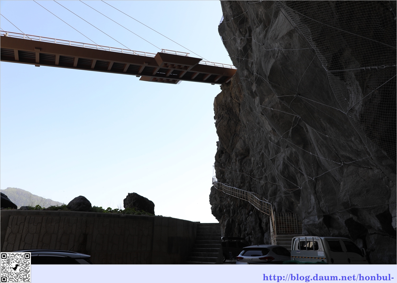 다리 밑으로 절벽을 따라 오르는 옛날 길은 위험하여 막아 놓았다.