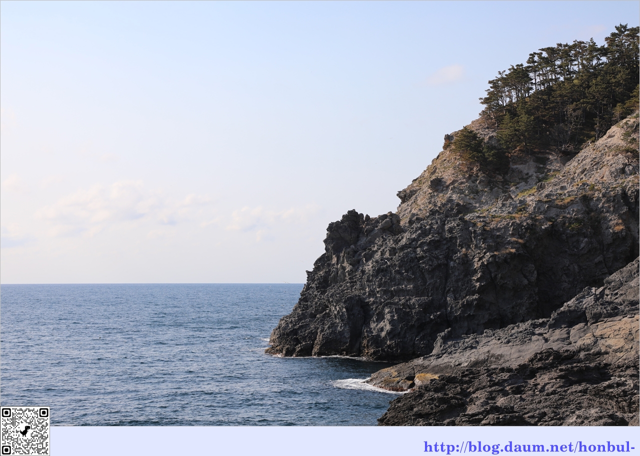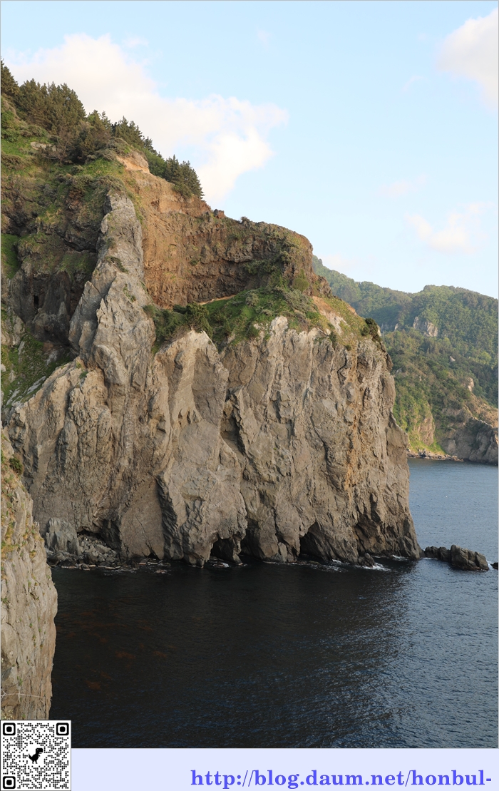 절벽 아래 바닷물이 닿는 덴 해식 동굴이 다섯 개나 보인다.