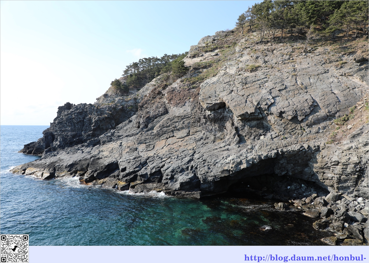 절벽 아래 바닷물이 닿는 덴 해식 동굴이 다섯 개나 보인다.