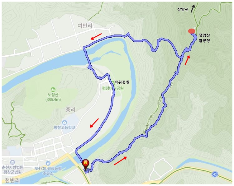 활공장에서 우측으로 하산해 평창강가로 내려왔다.