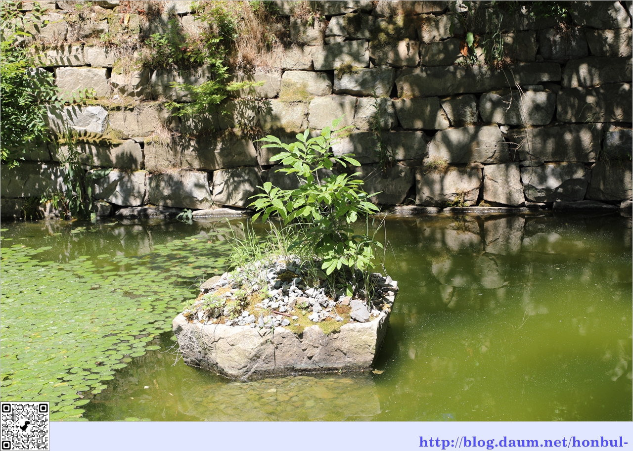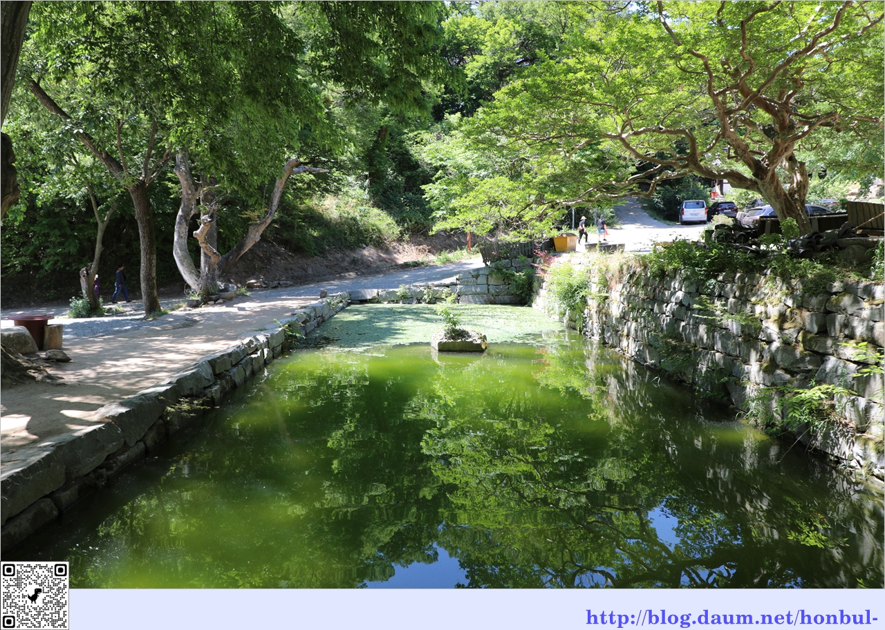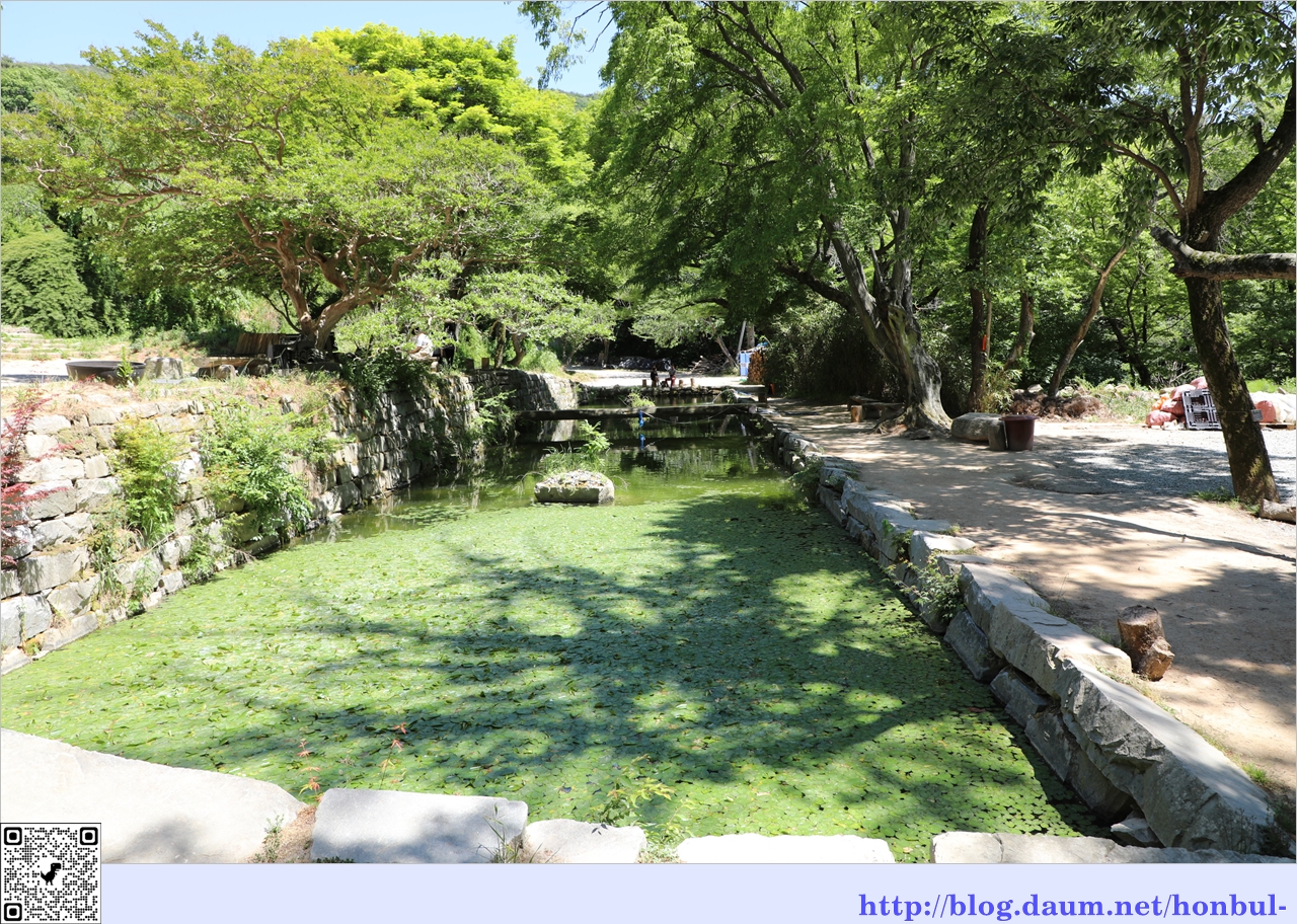 오른쪽에 있는 배롱나무에 붉은 꽃이 피면 녹색 연못과 잘 어울리겠다.