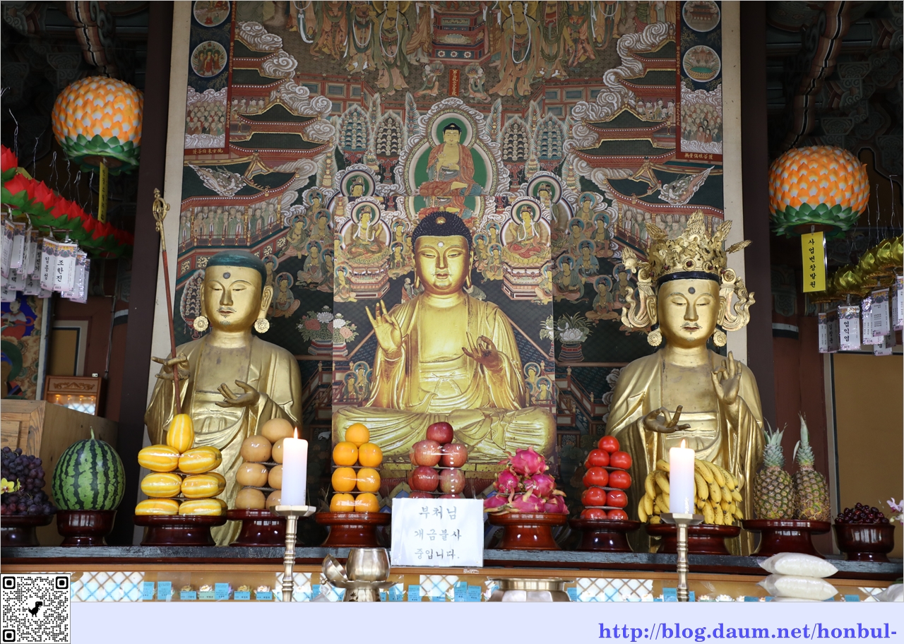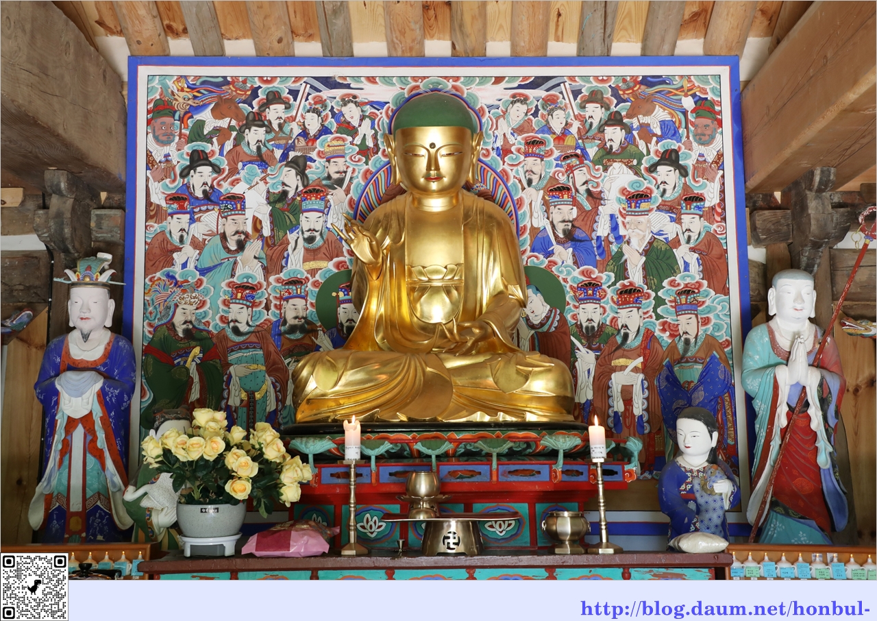 가운데 목조 아미타여래좌상은 새로 개금불사 중이라 사진으로 대체했다.