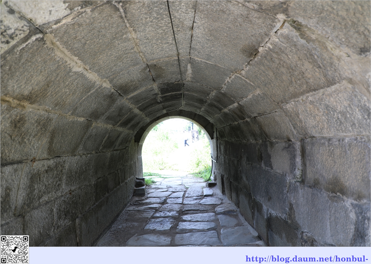 홍예 사이에는 돌계단을 설치하여 들어가는 곳은 높고 나오는 곳은 낮게 만들었는데, 지세가 그러하기 때문이다.