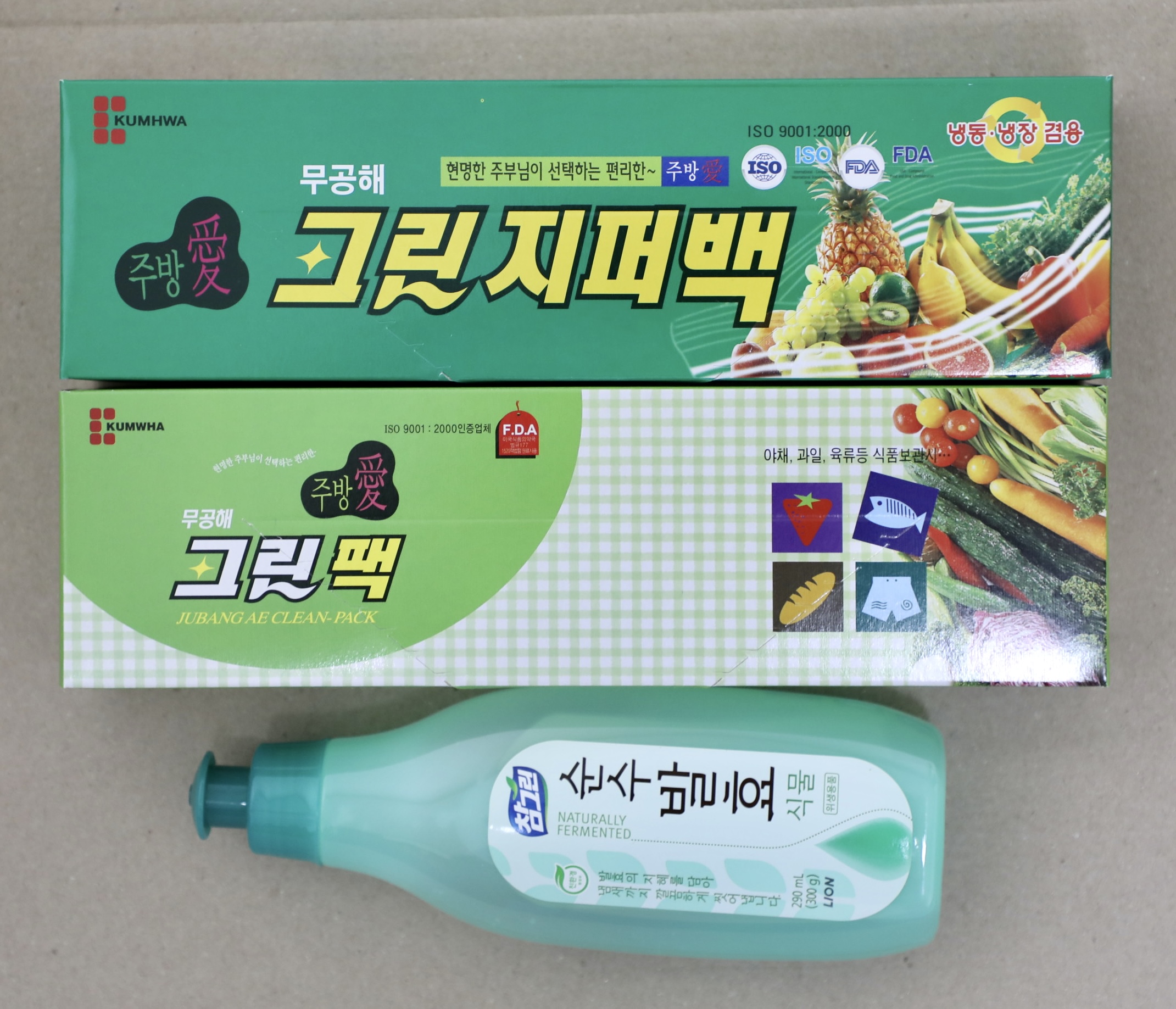 그린 지퍼백과 식물성 주방세재, 아이폰과 구글폰 모두 사용할 수 있는 충전기다.