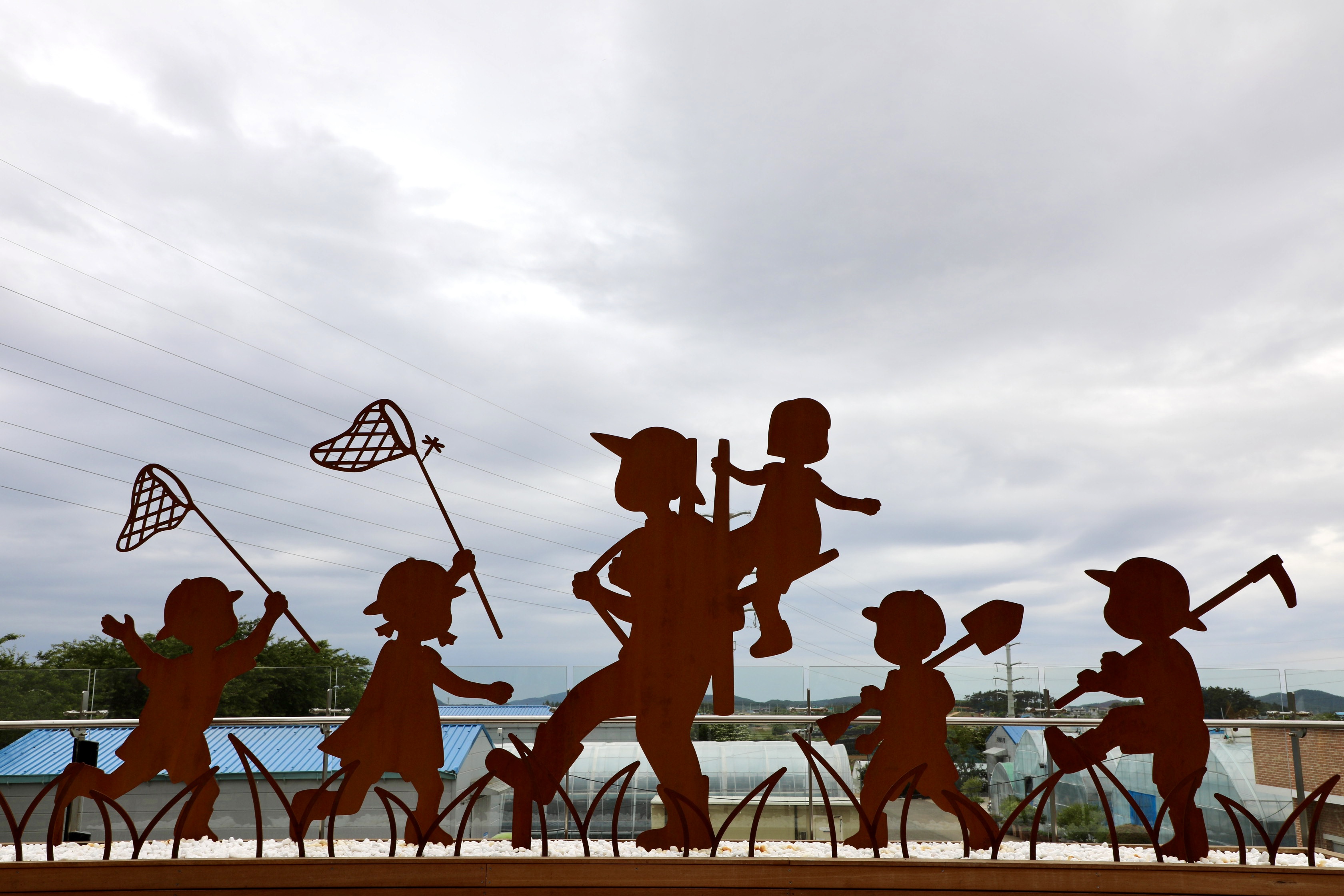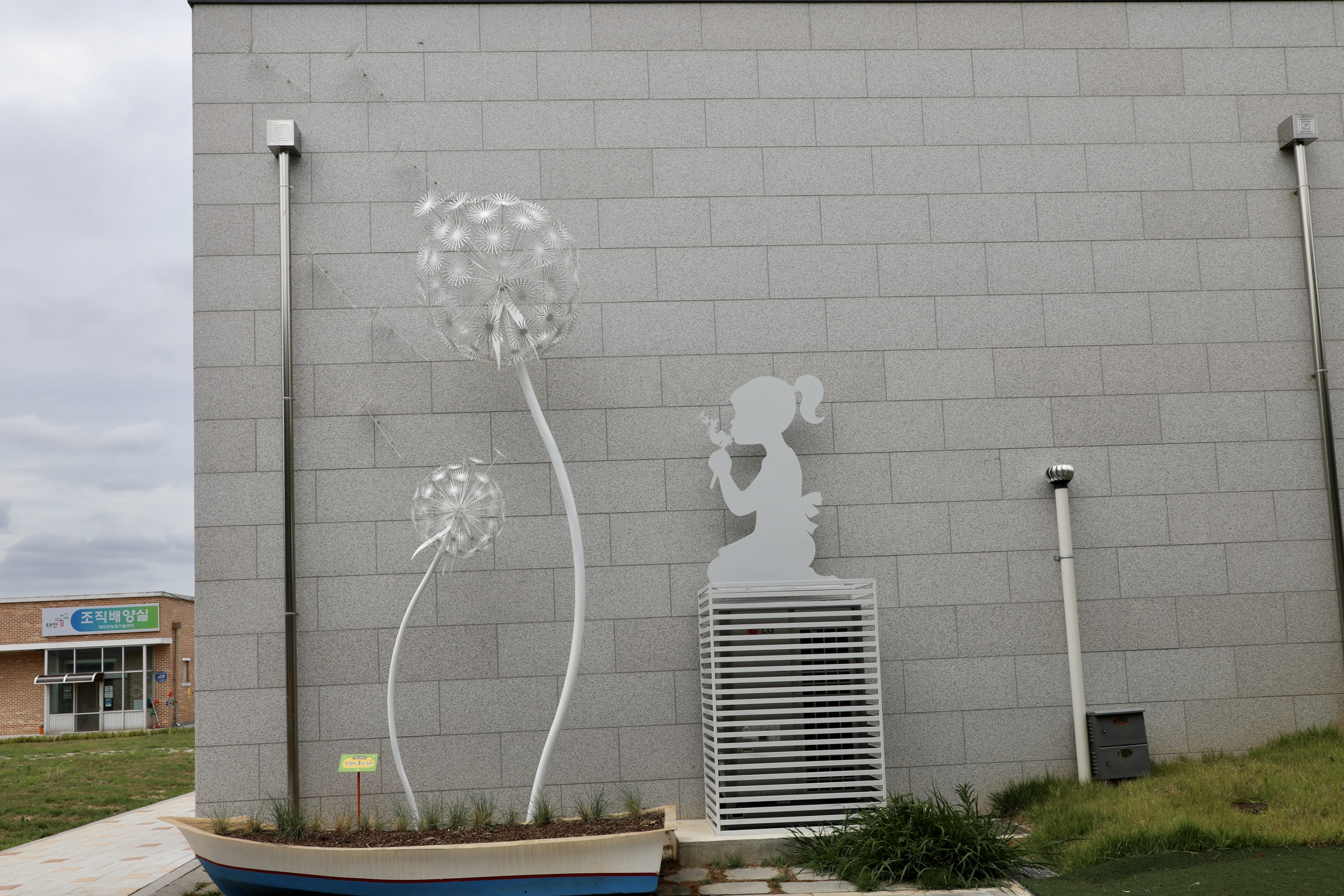 건물 벽에 감수성이 풍부한 소녀와 민들레꽃 조형물을 설치해 활기를 불어넣는다.