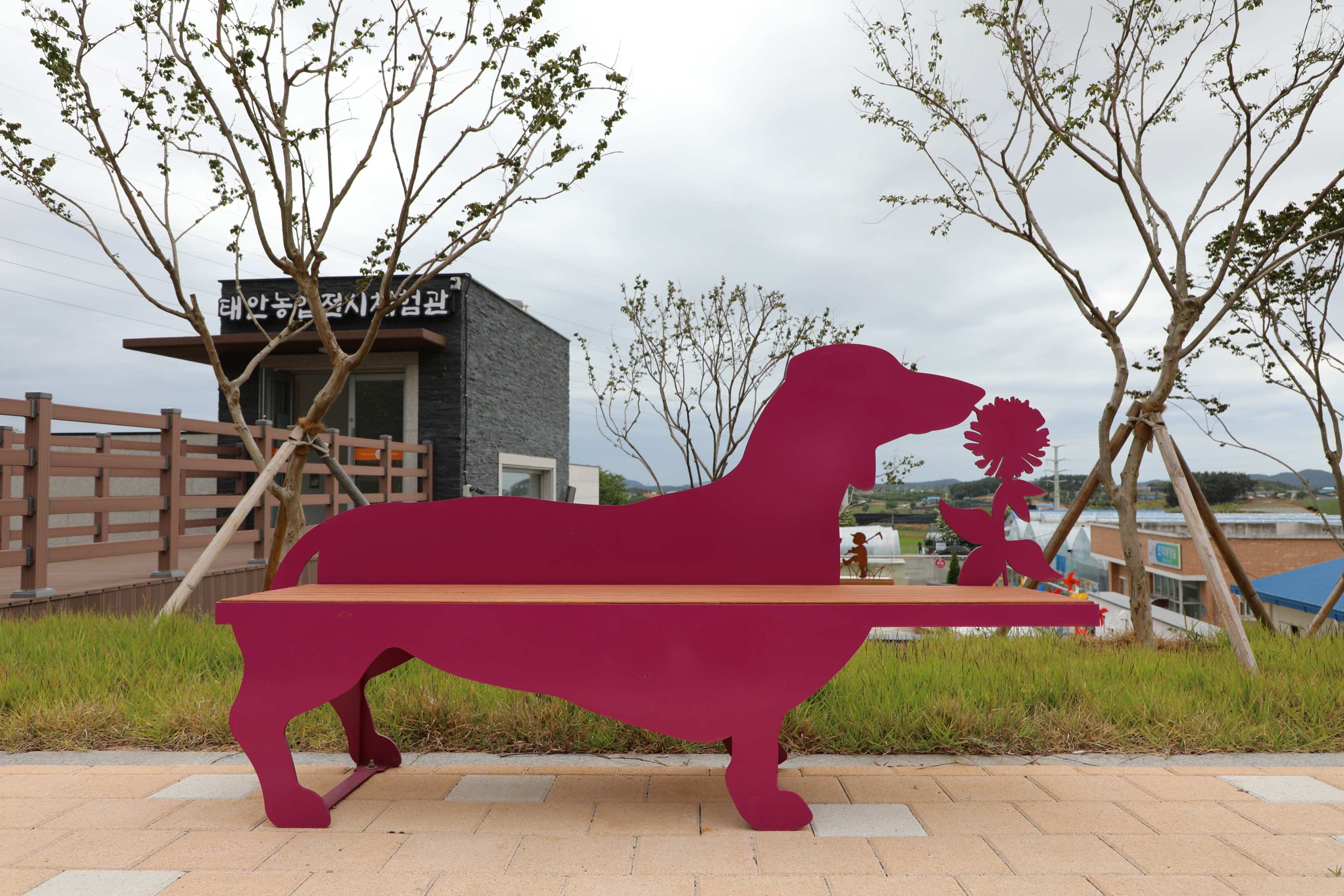 의자를 반려견과 꽃으로 장식한 게 제법 흥미롭다.