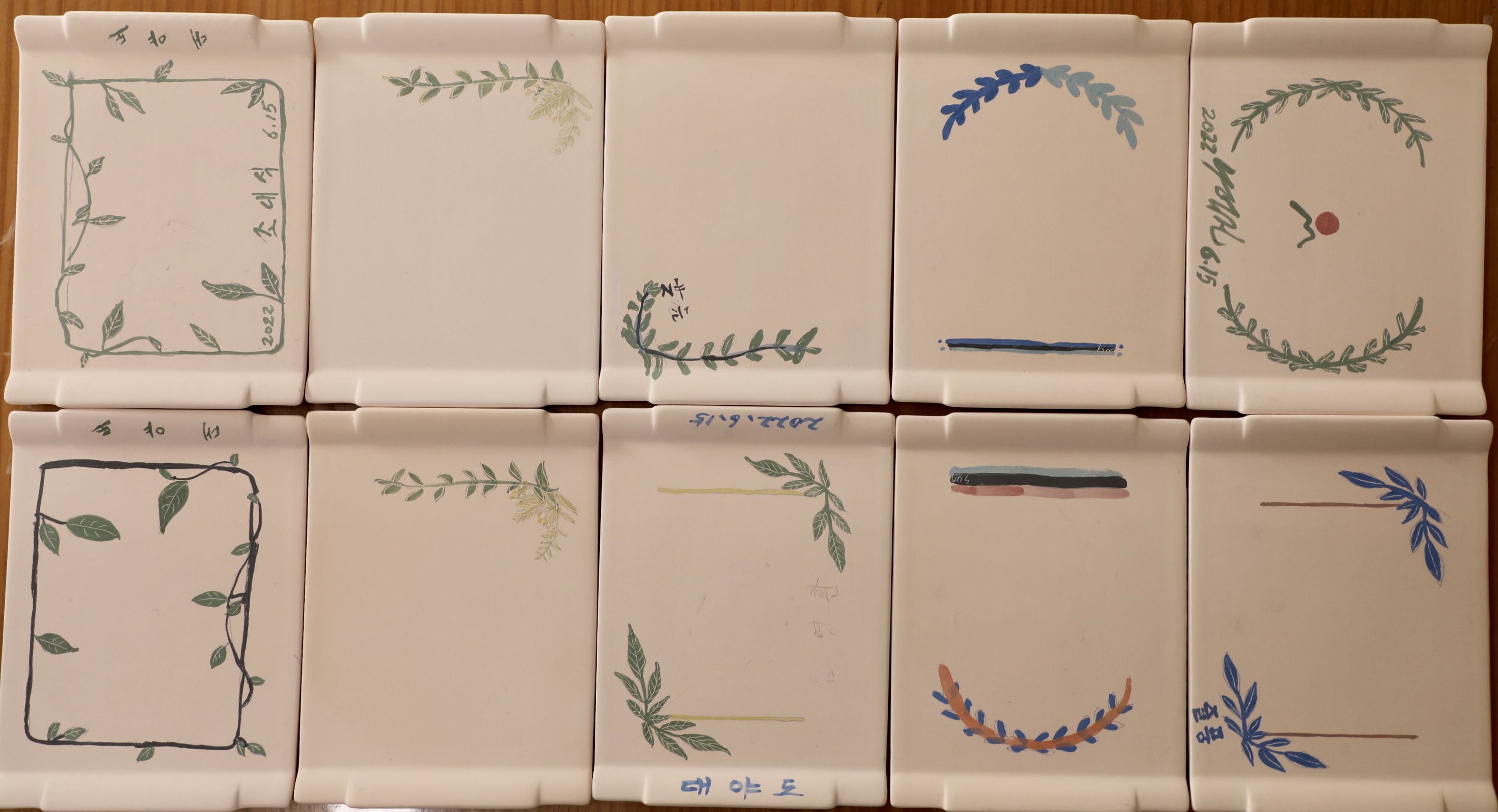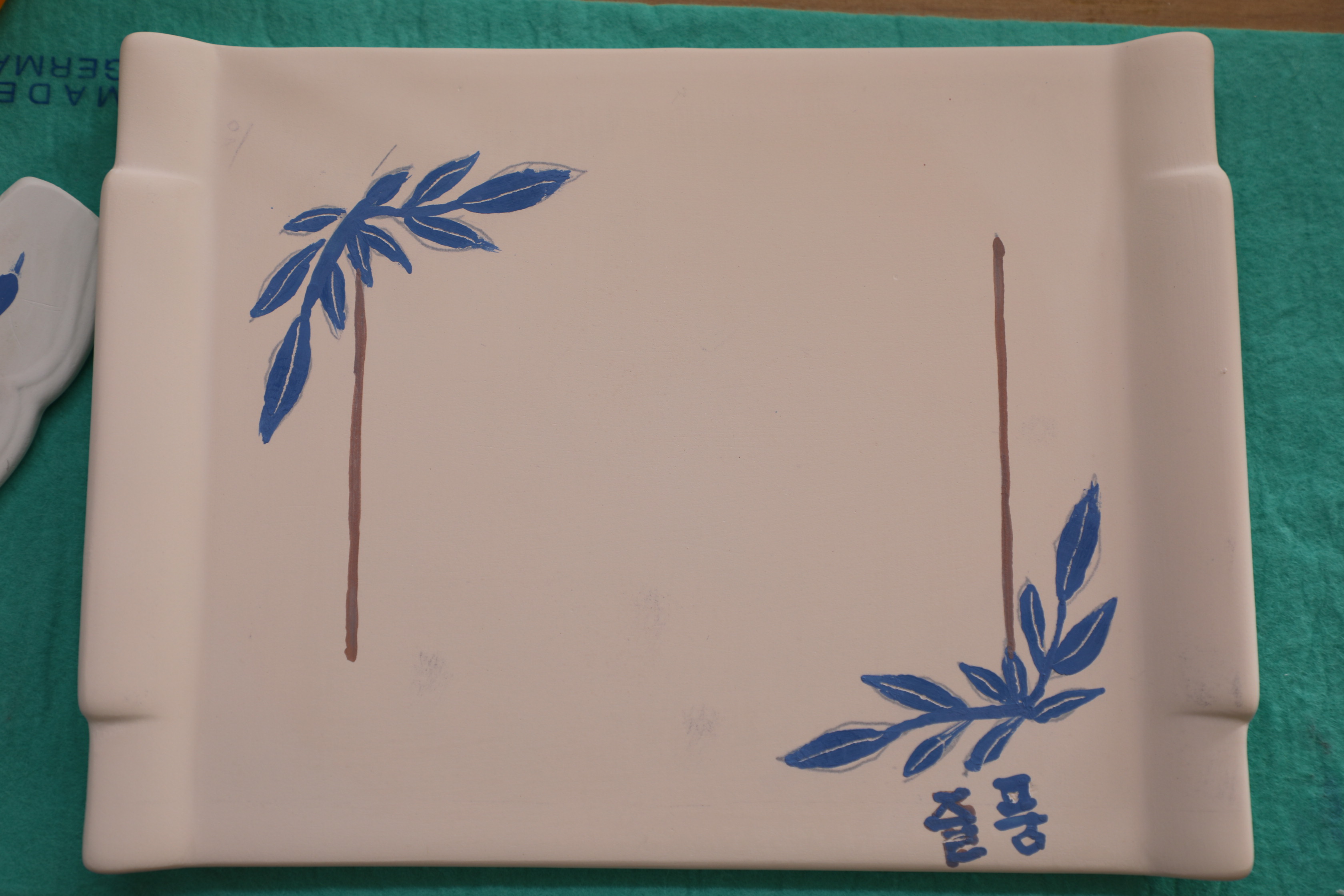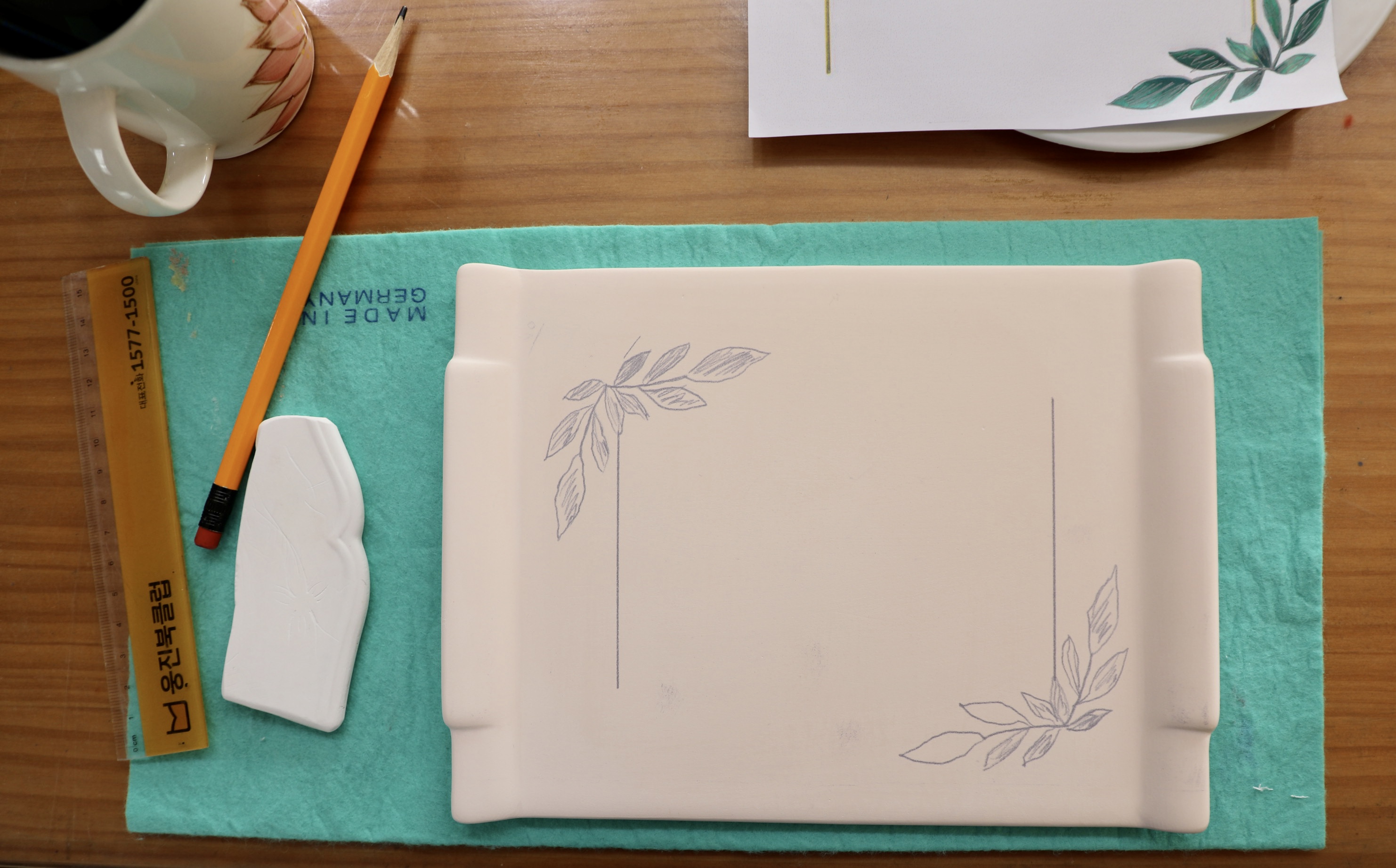 1차로 구운 평면적 생활 자기에 원하는 도안을 받아 똑같은 그림을 그린다.