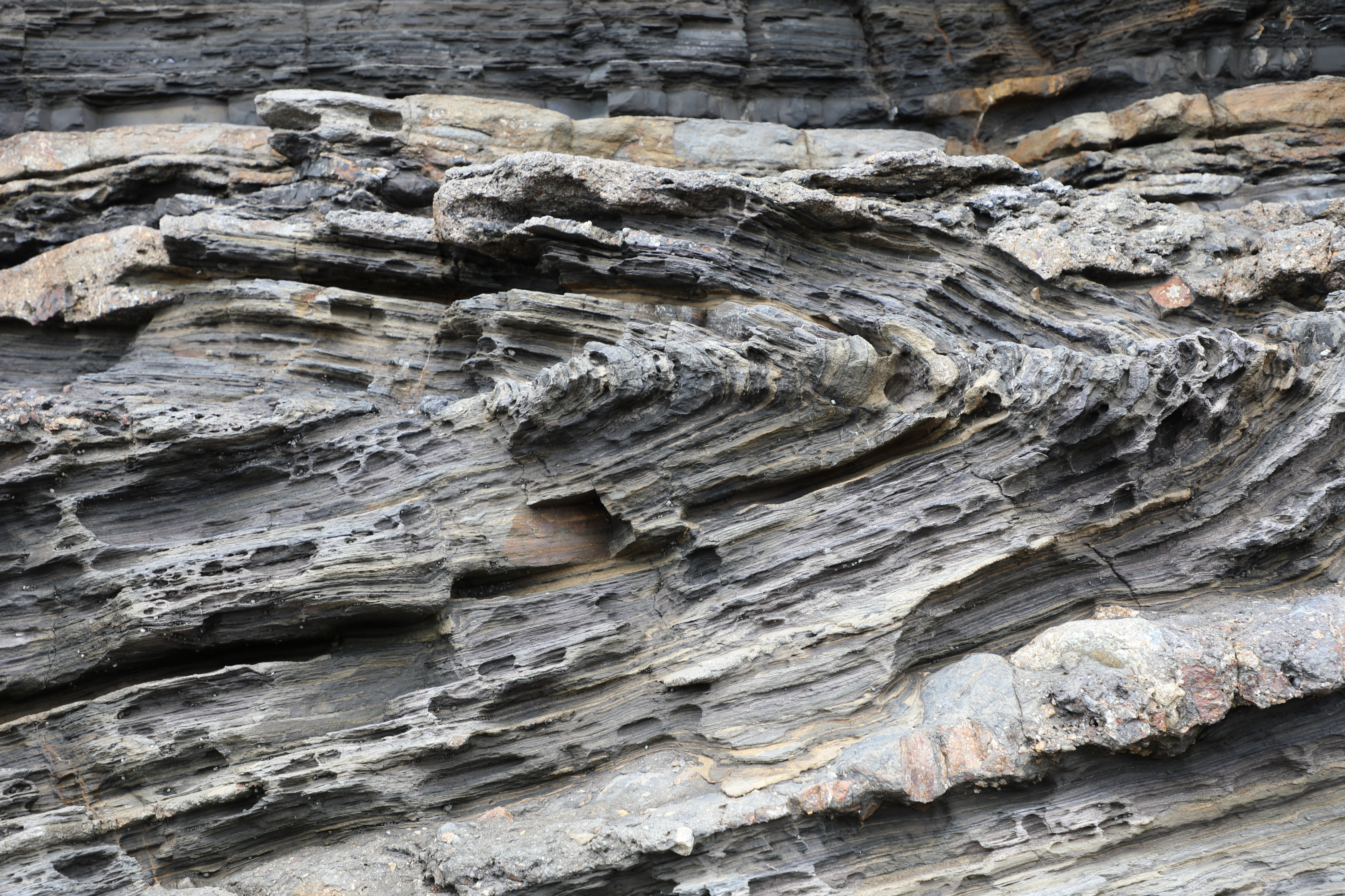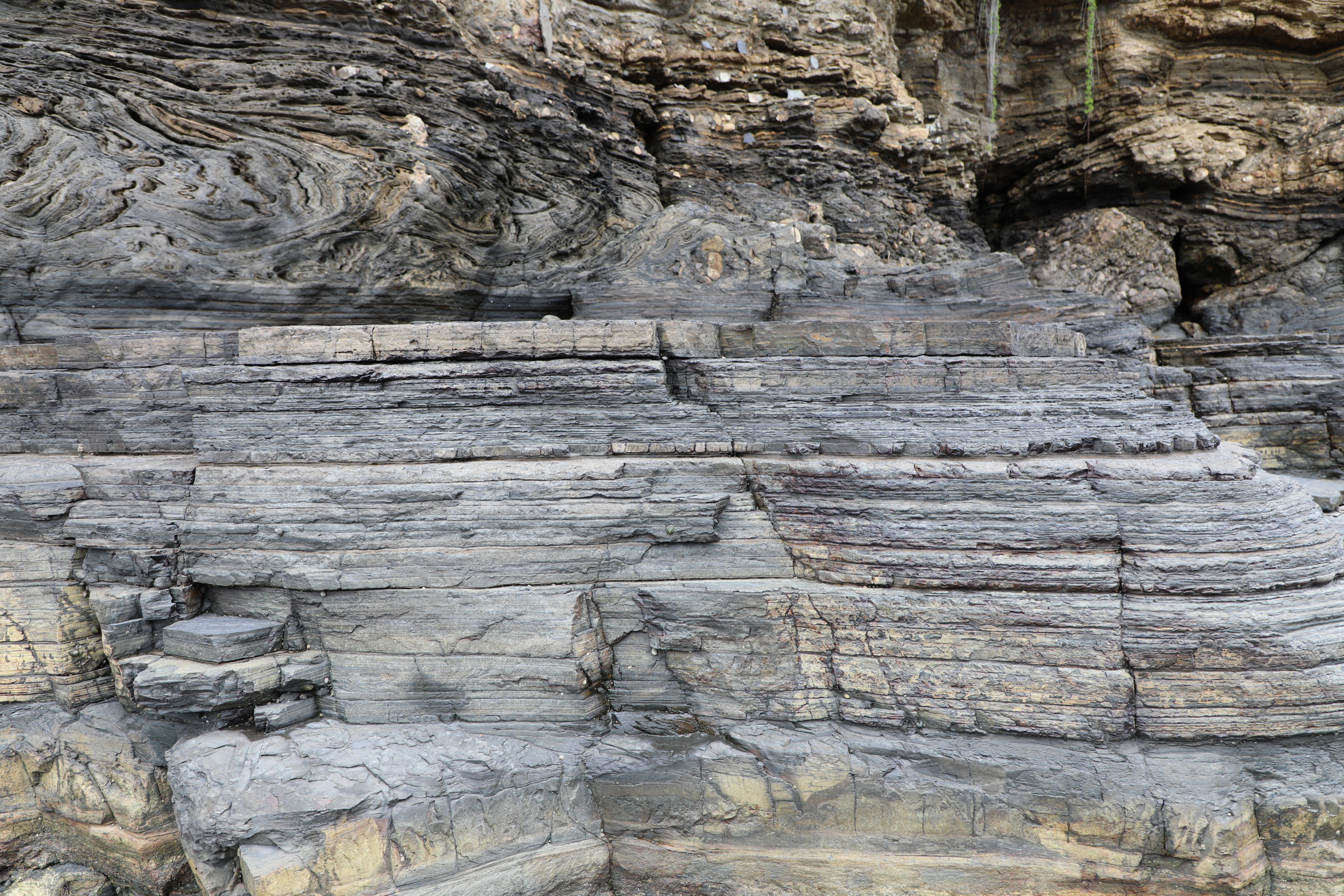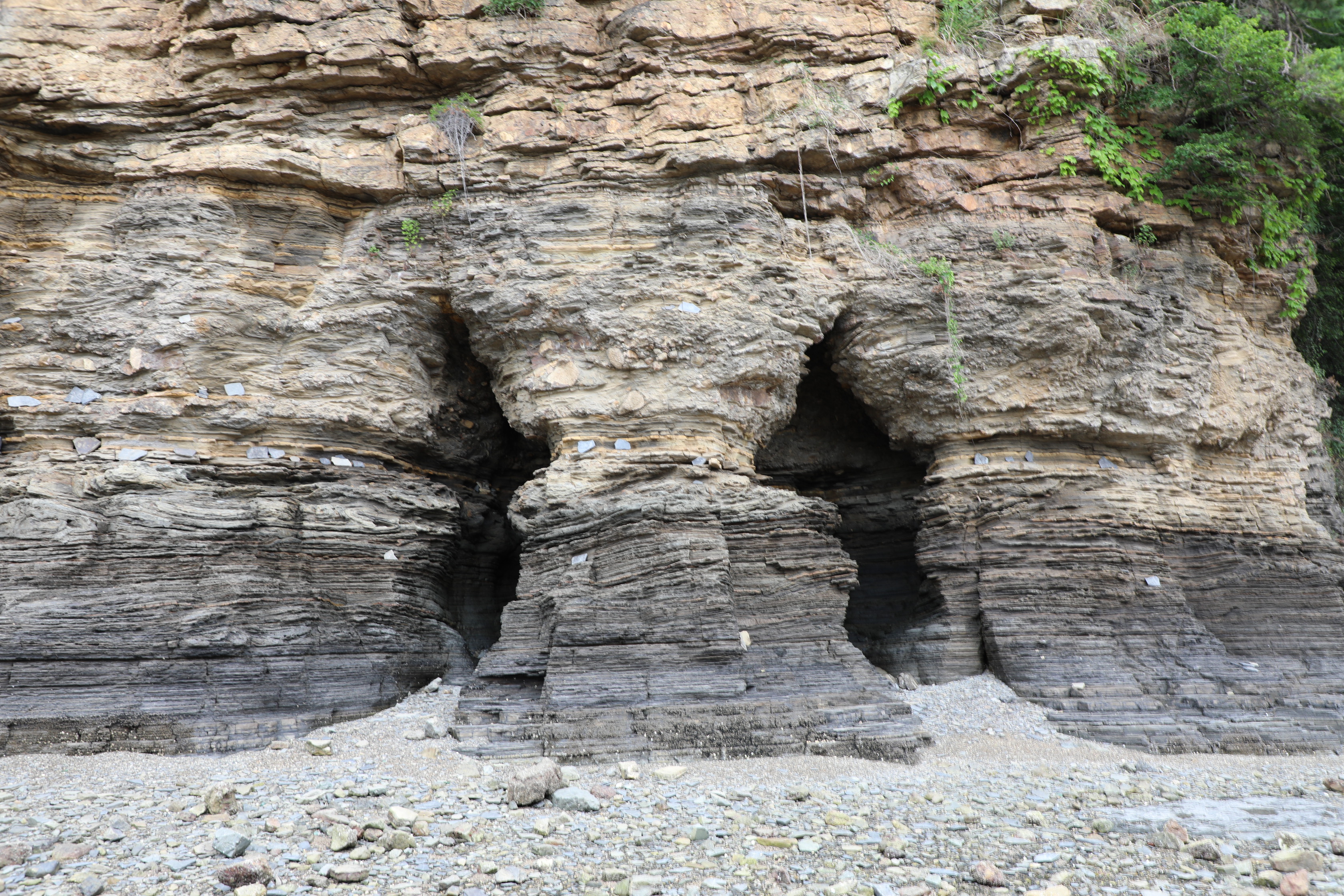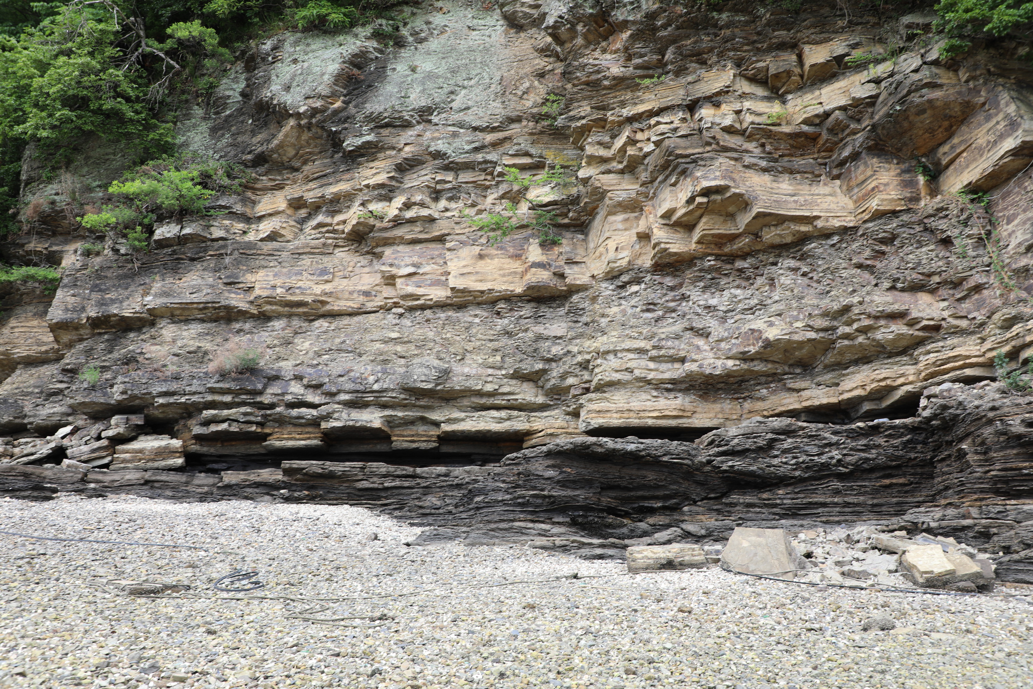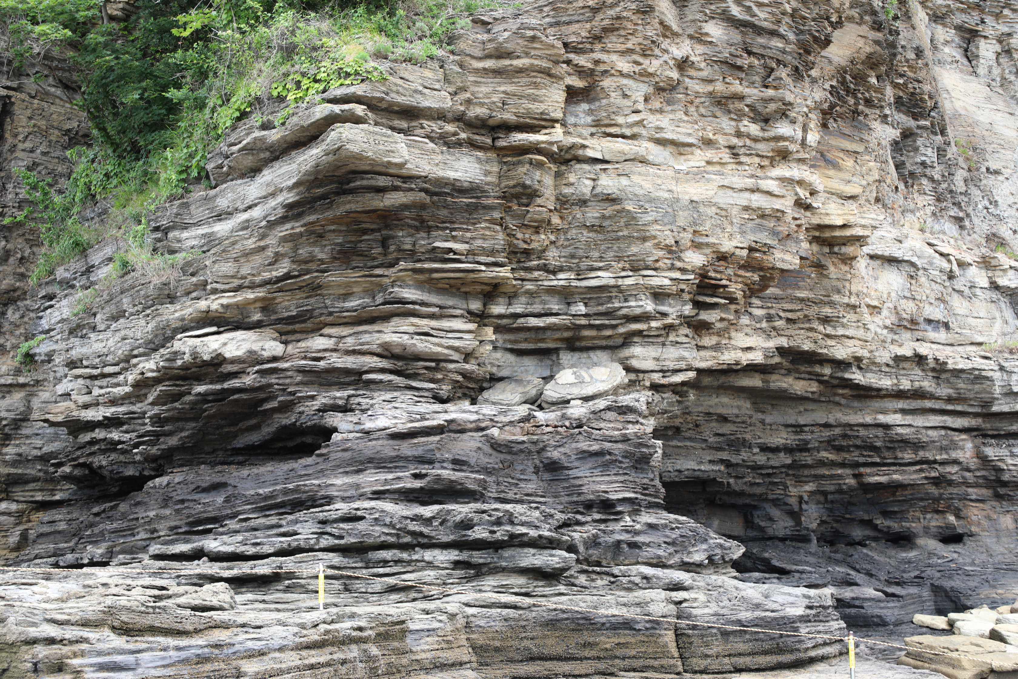 사암과 이암의 교대층[호층, 互層], 셰일, 화산회로 이루어진 이암의 층서를 나타낸다.