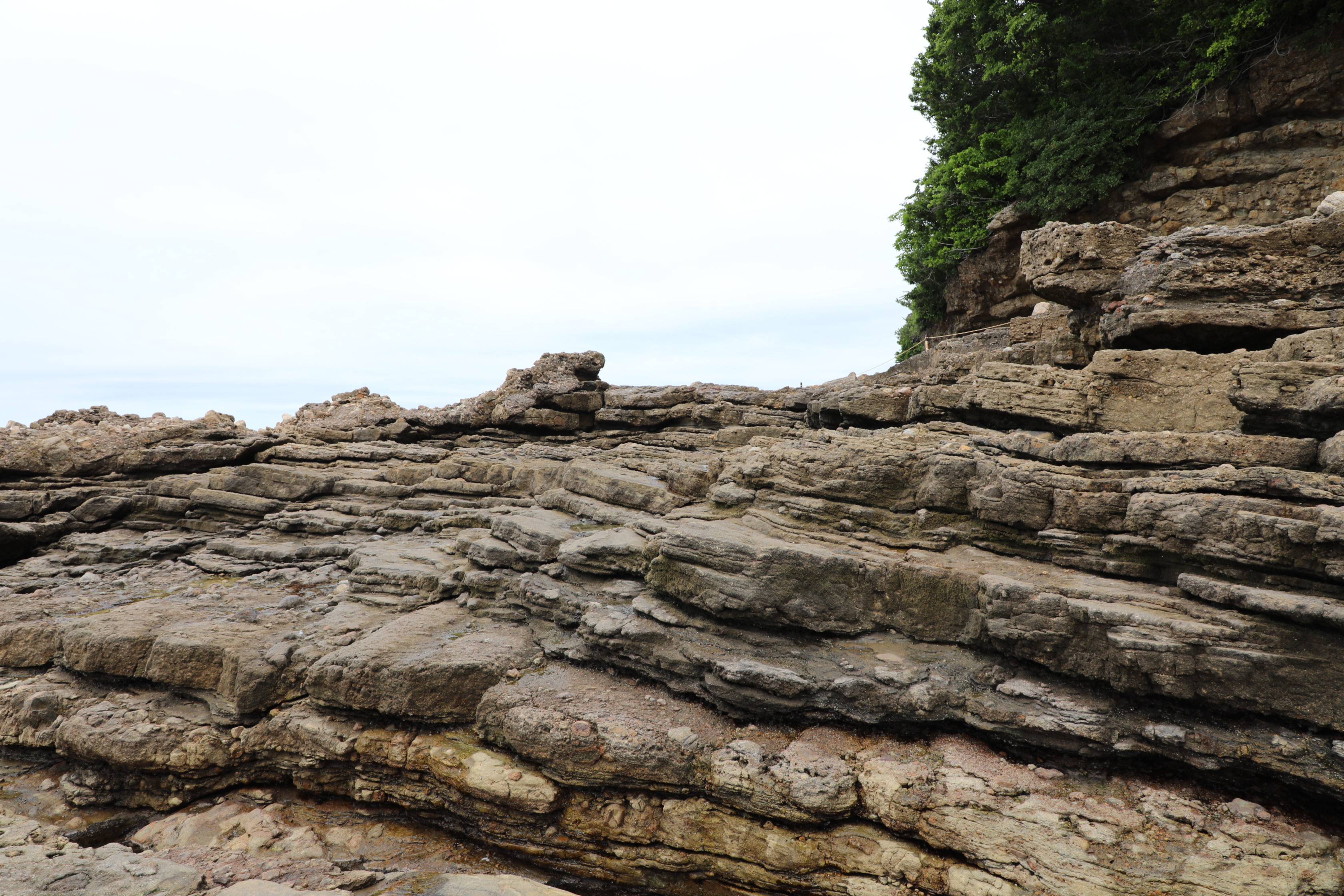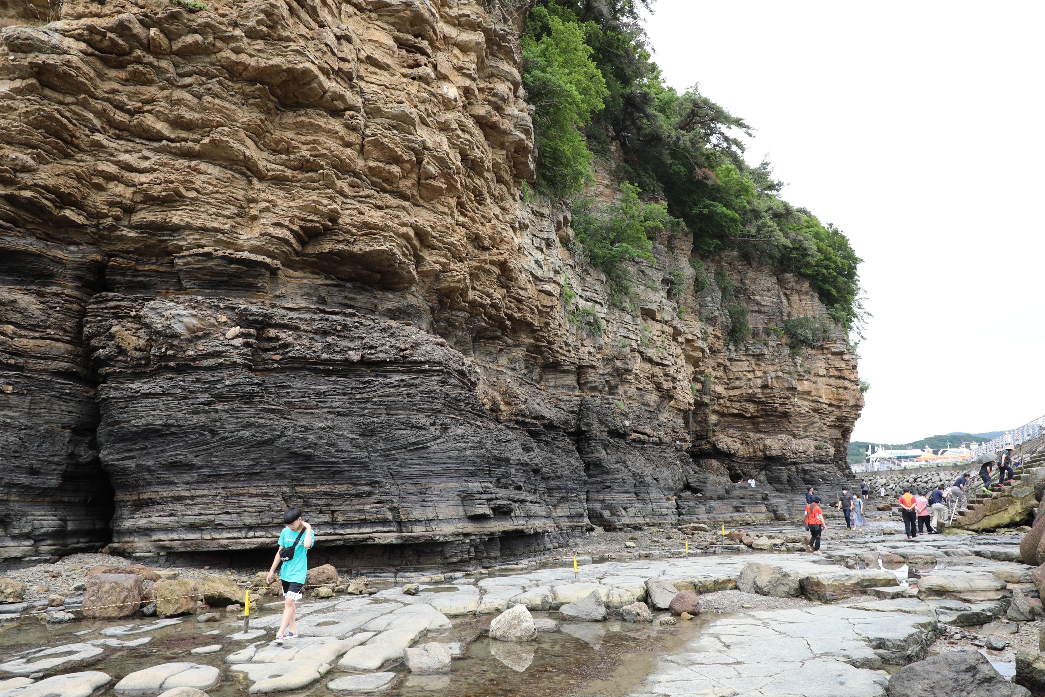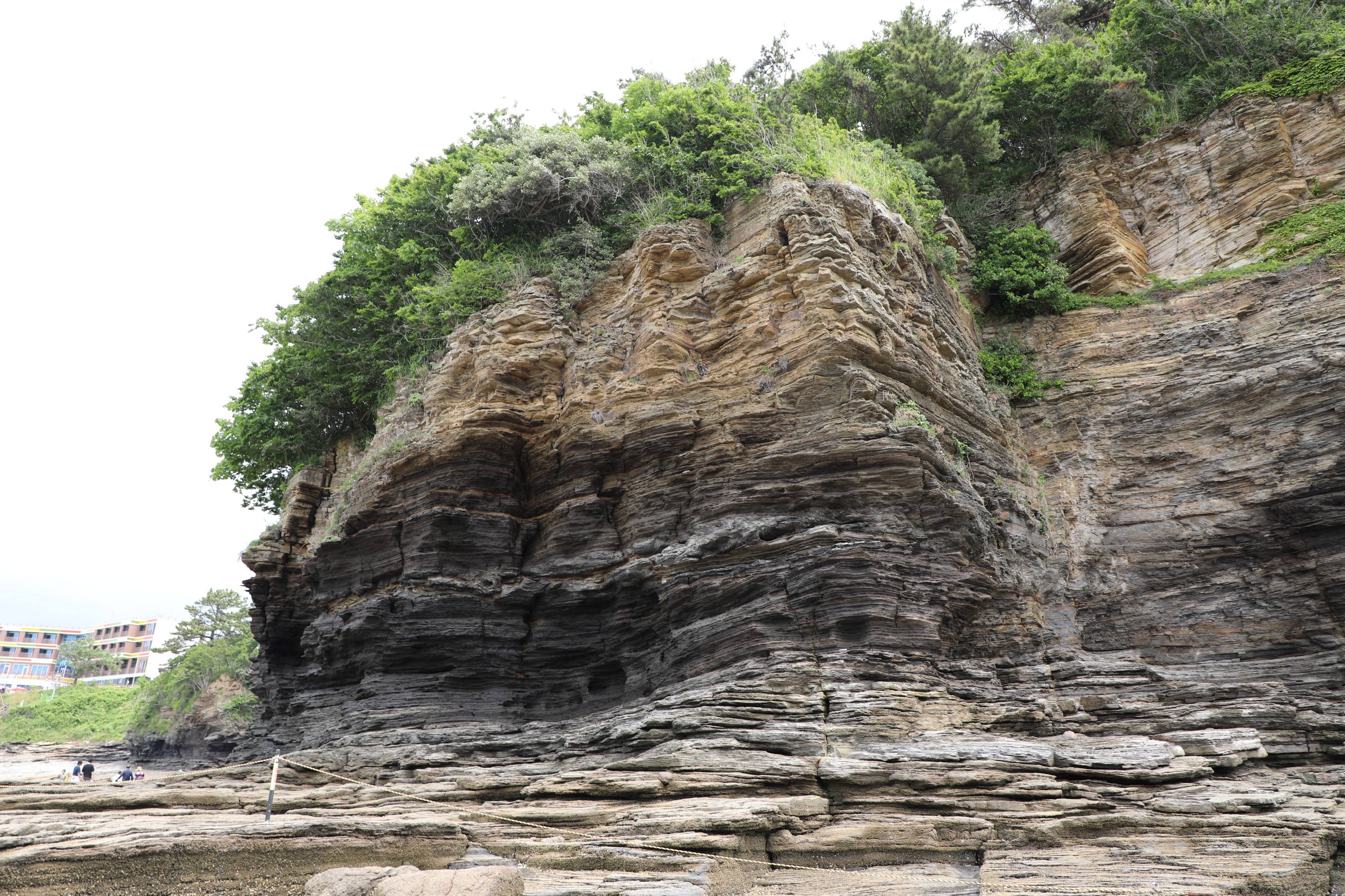 바닷물의 침식을 받은 화산성 퇴적암층은 격포리층으로 역암 위에 역암과 사암,