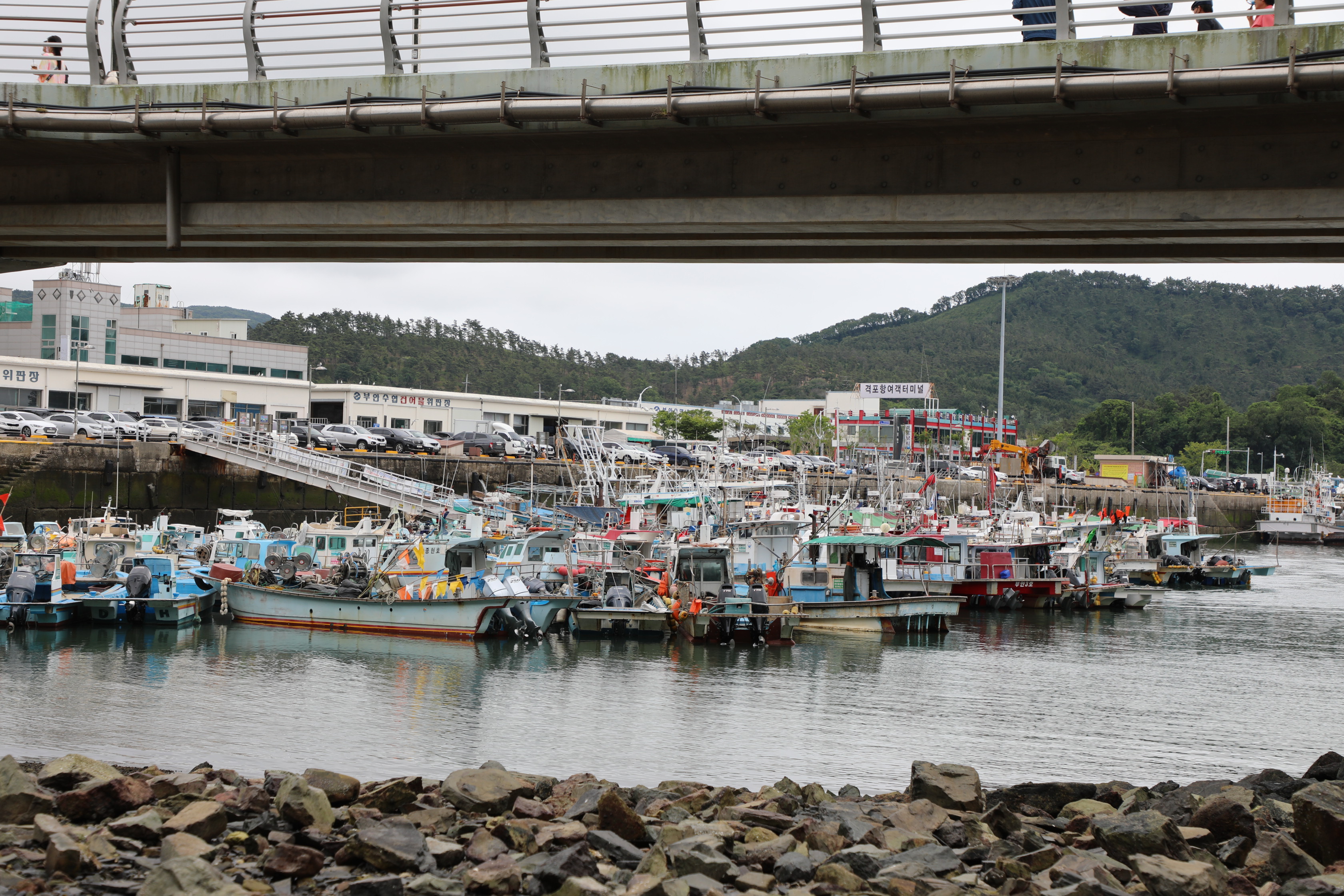 방파제와 연결된 다리 밑으로 격포항에 정박한 선박이 보인다.
