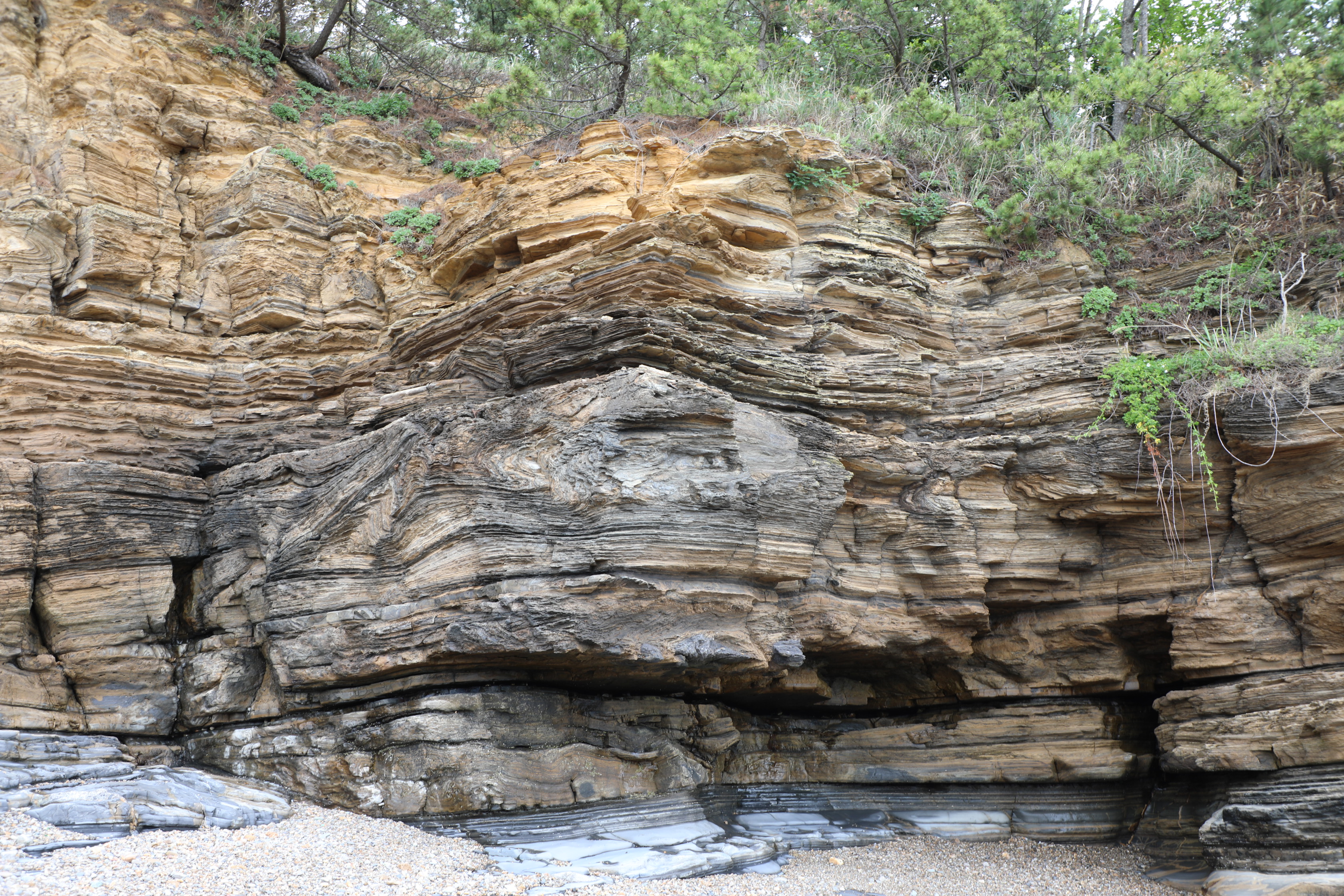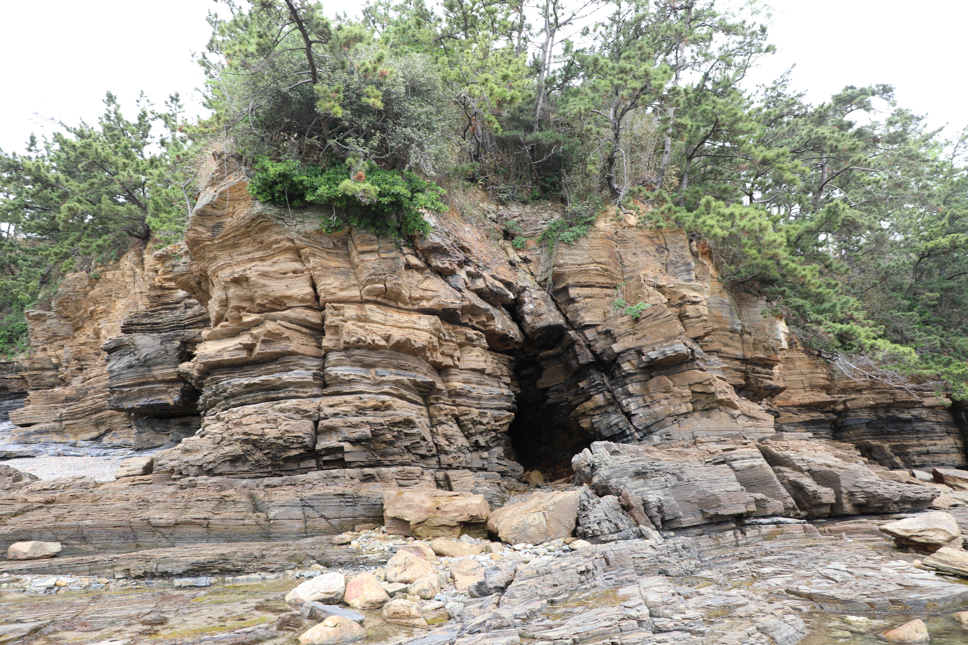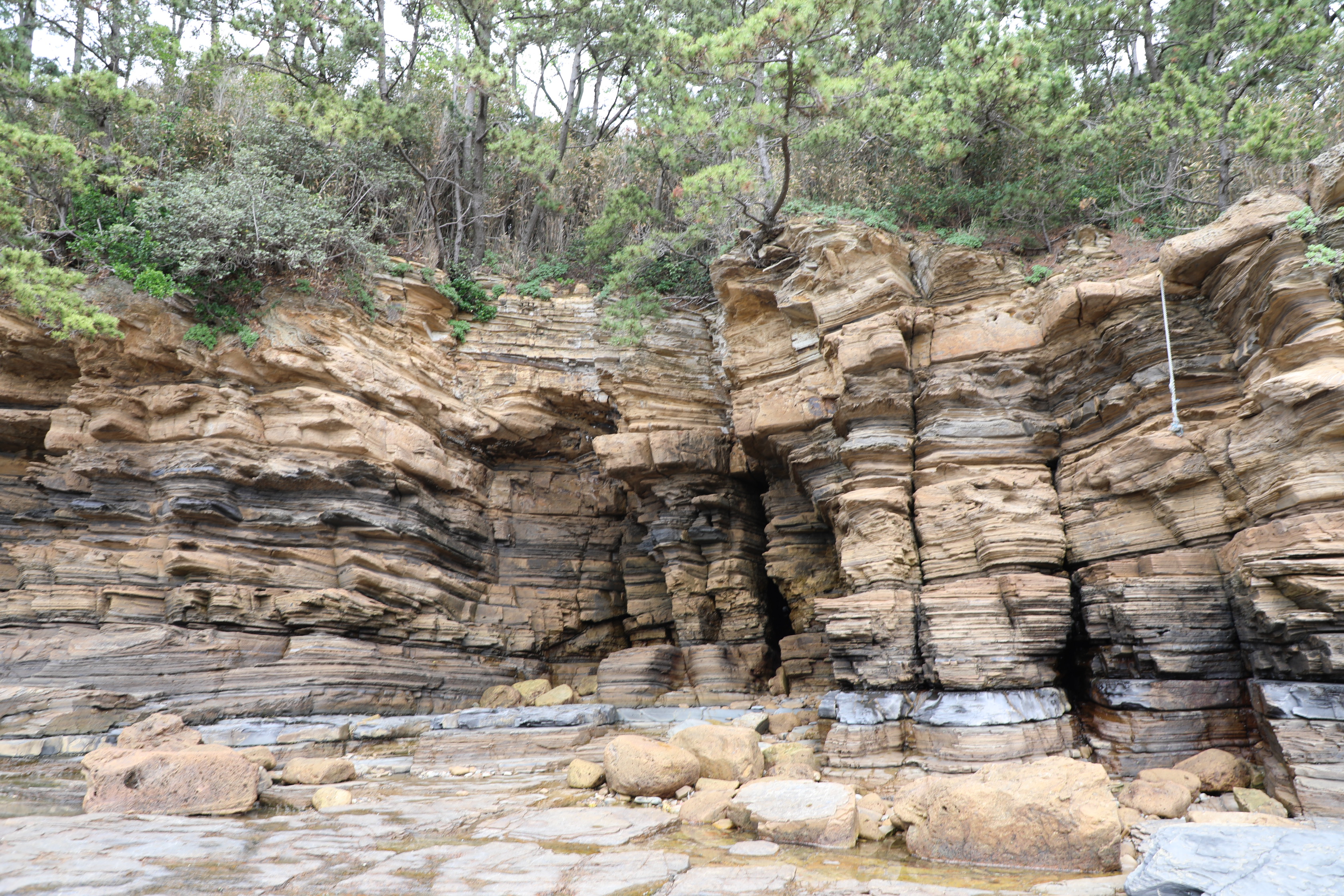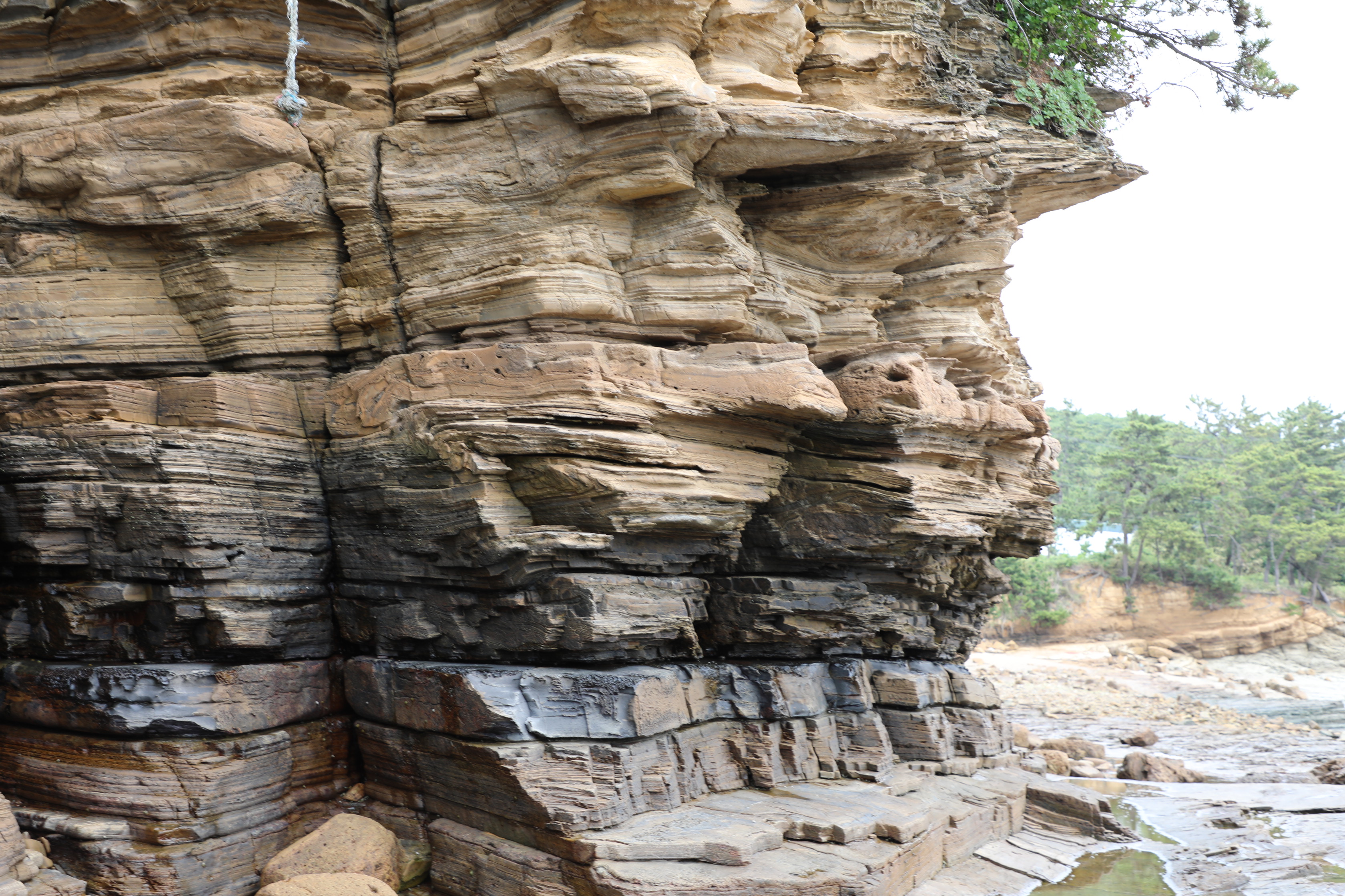 특히 닭이봉 한 자락이 오랜 세월 동안 파도에 깎이면서 형성된 퇴적암층이 절경이다.