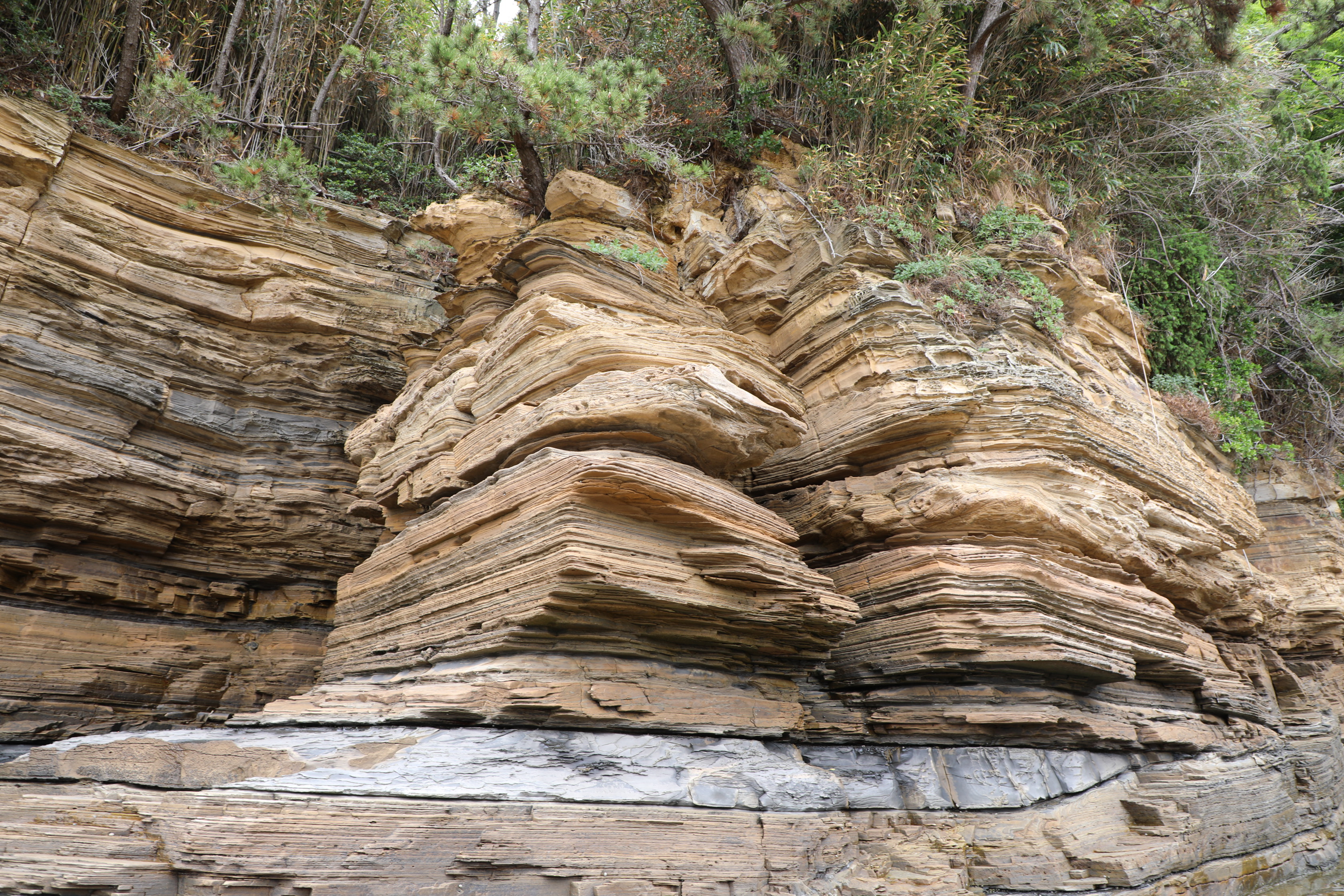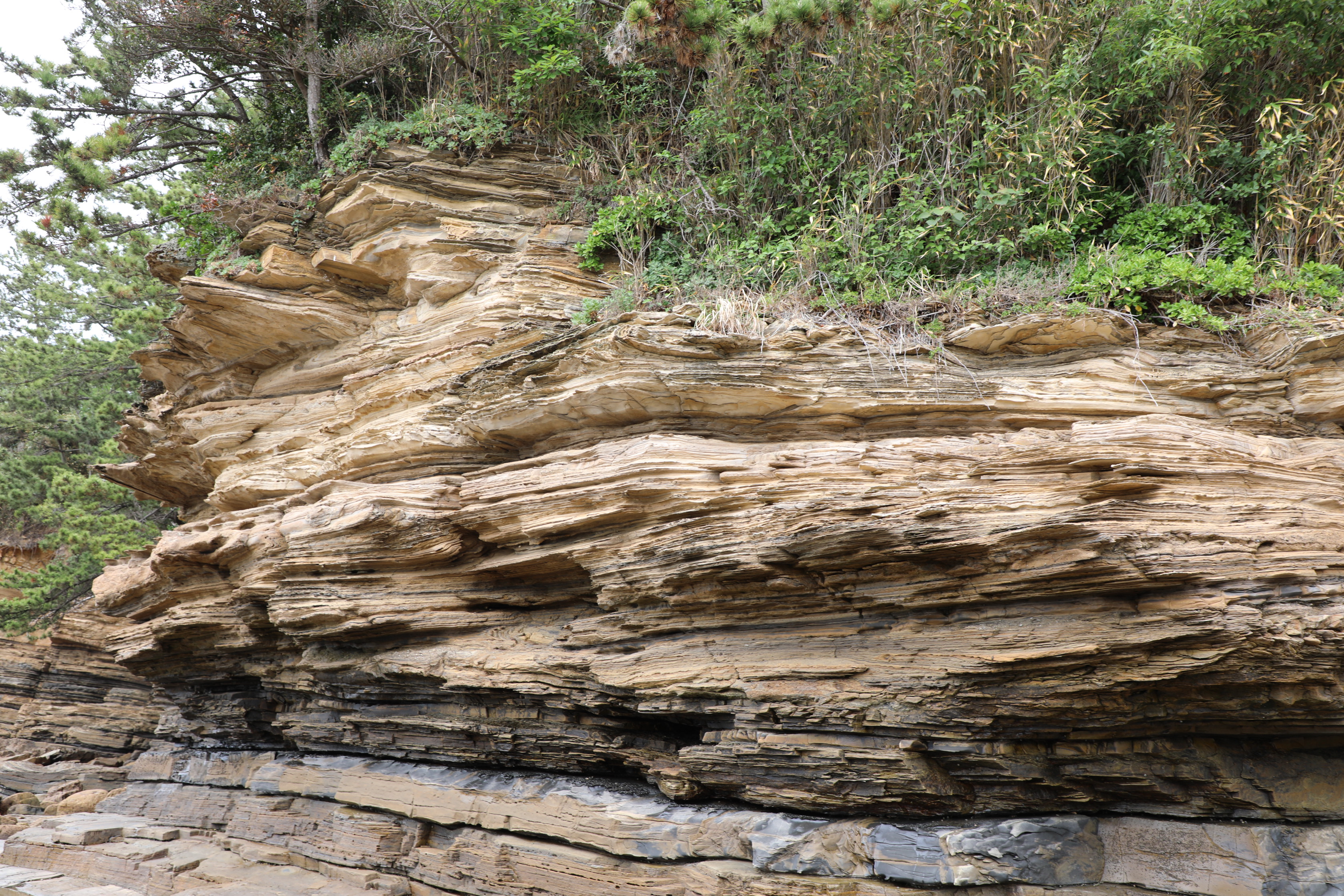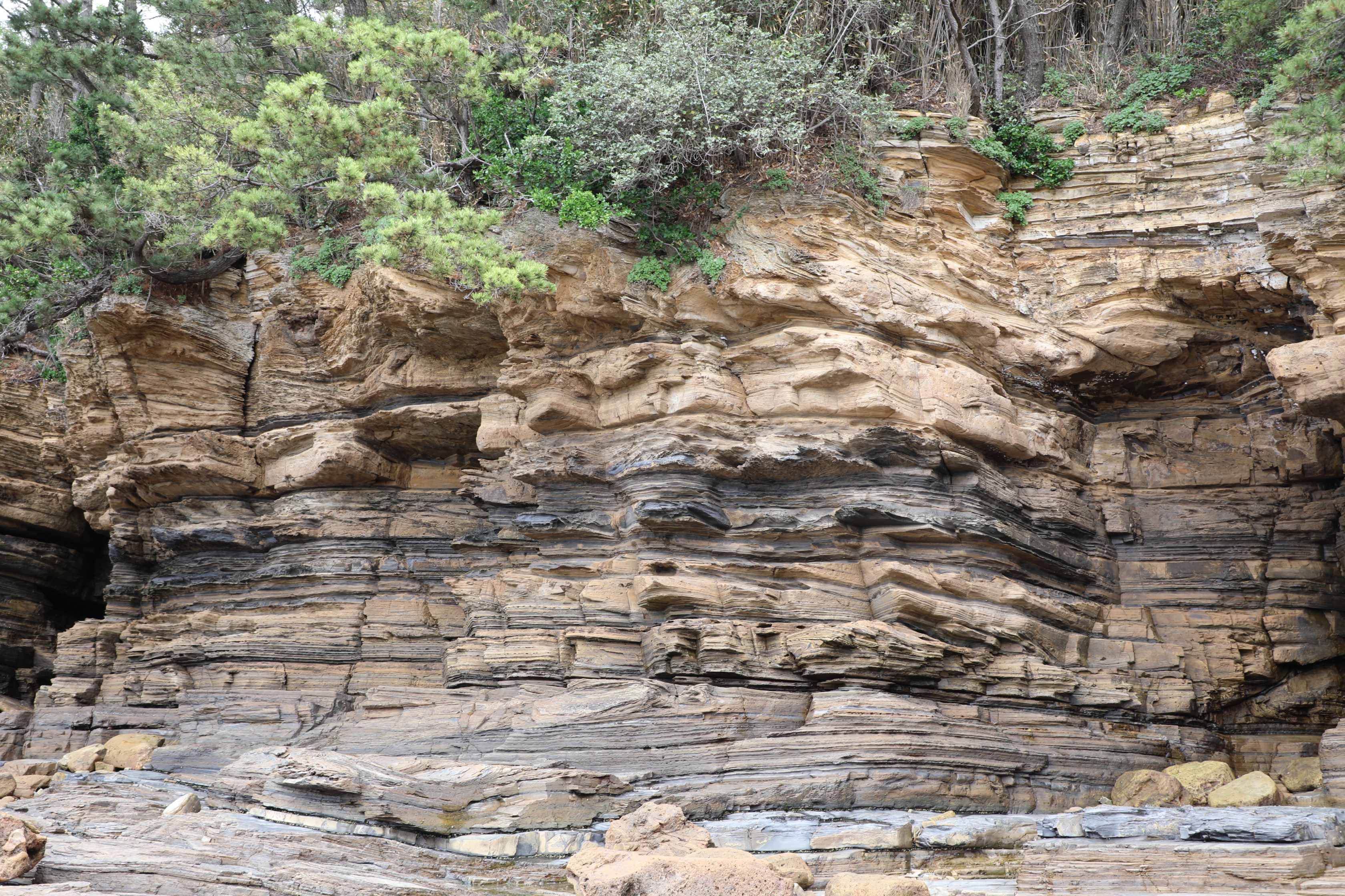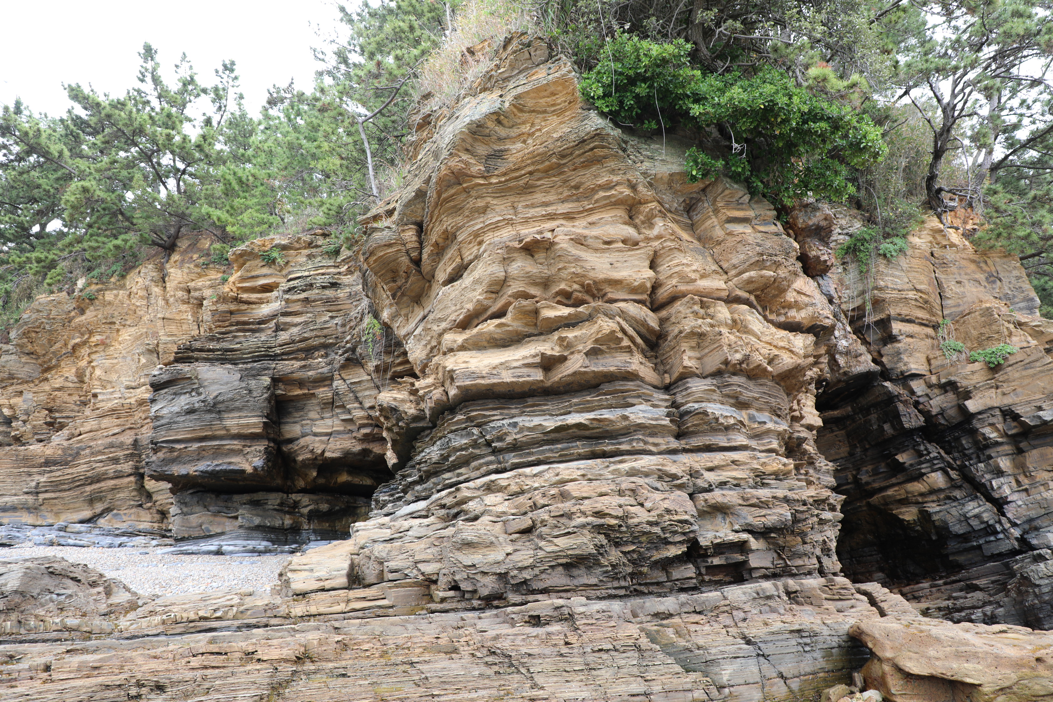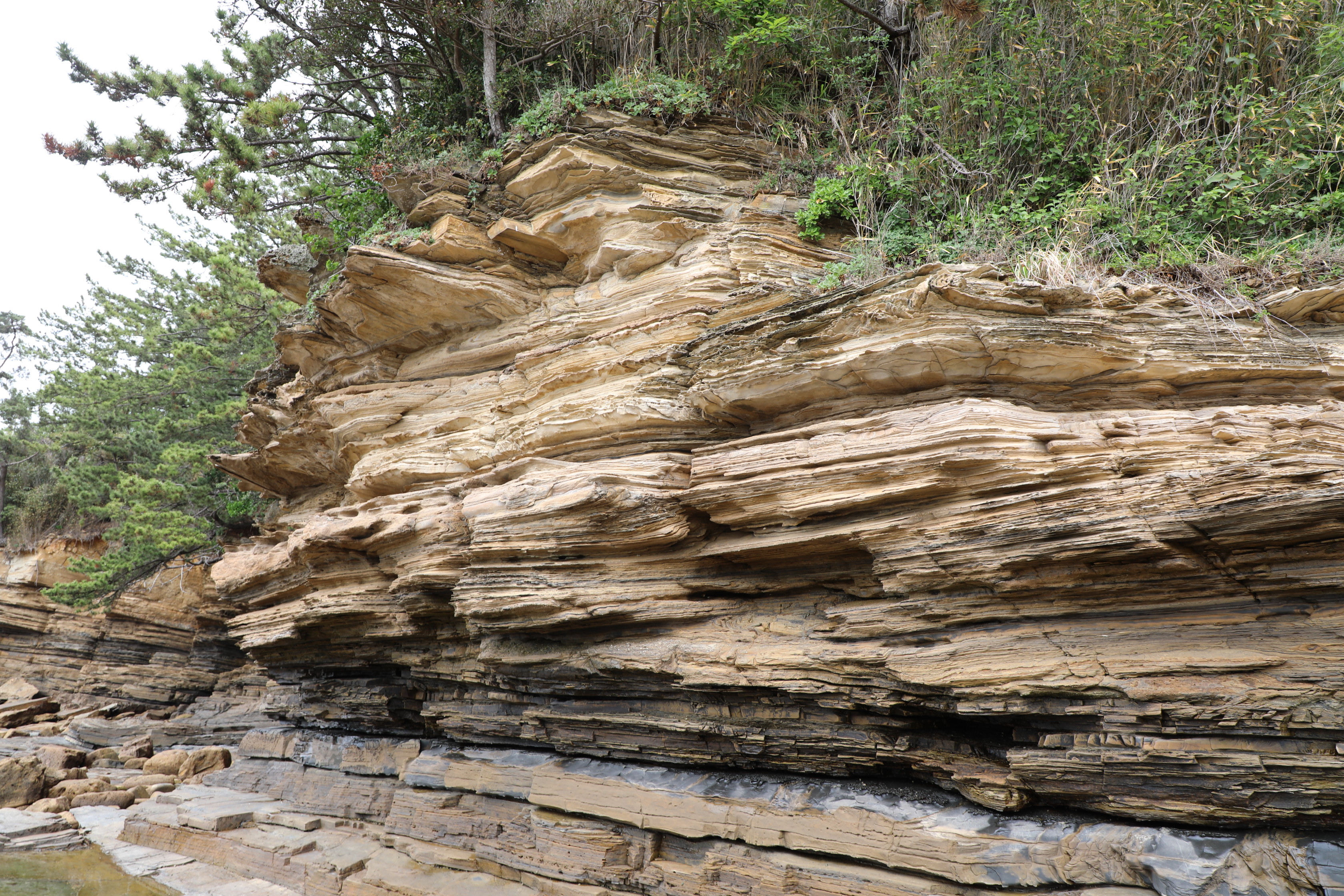 특히 닭이봉 한 자락이 오랜 세월 동안 파도에 깎이면서 형성된 퇴적암층이 절경이다.