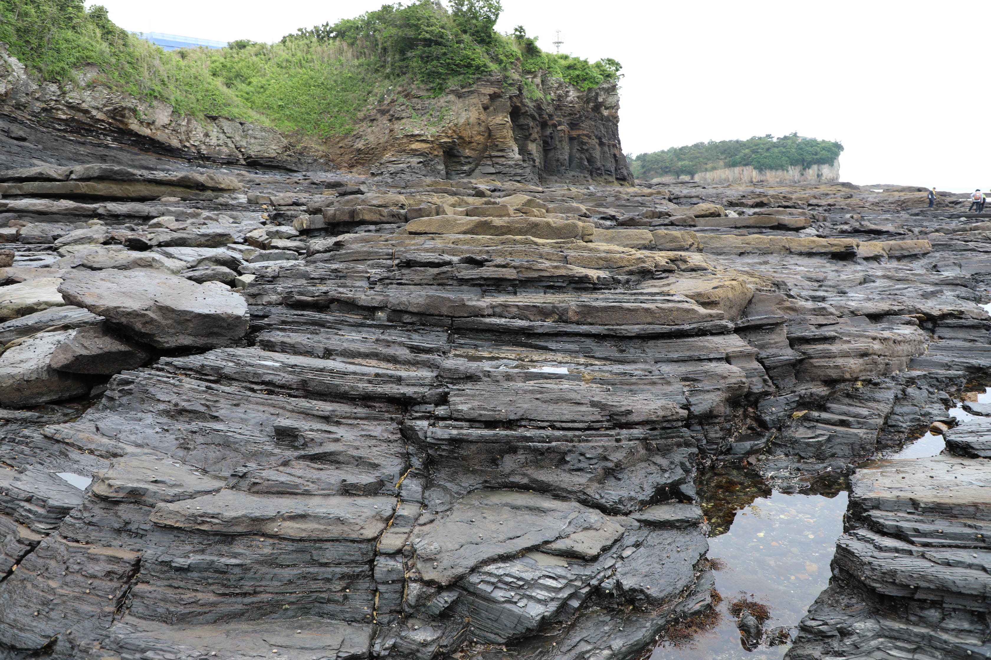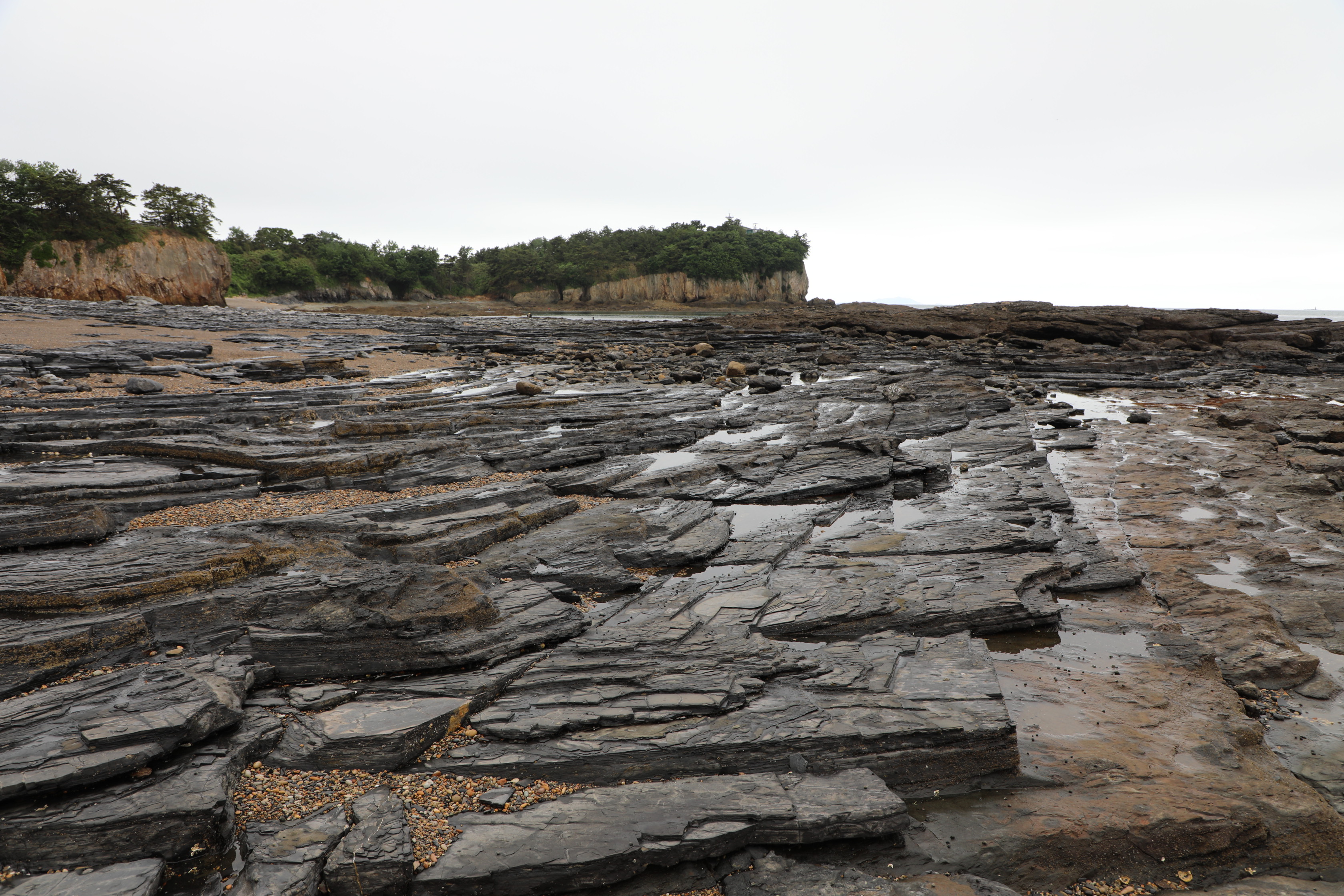적벽강이 황갈색 일색의 바위로 주상절리가 잘 발달한 반면 이곳은 온통 검은색 단층으로 채석강과 닮았다.