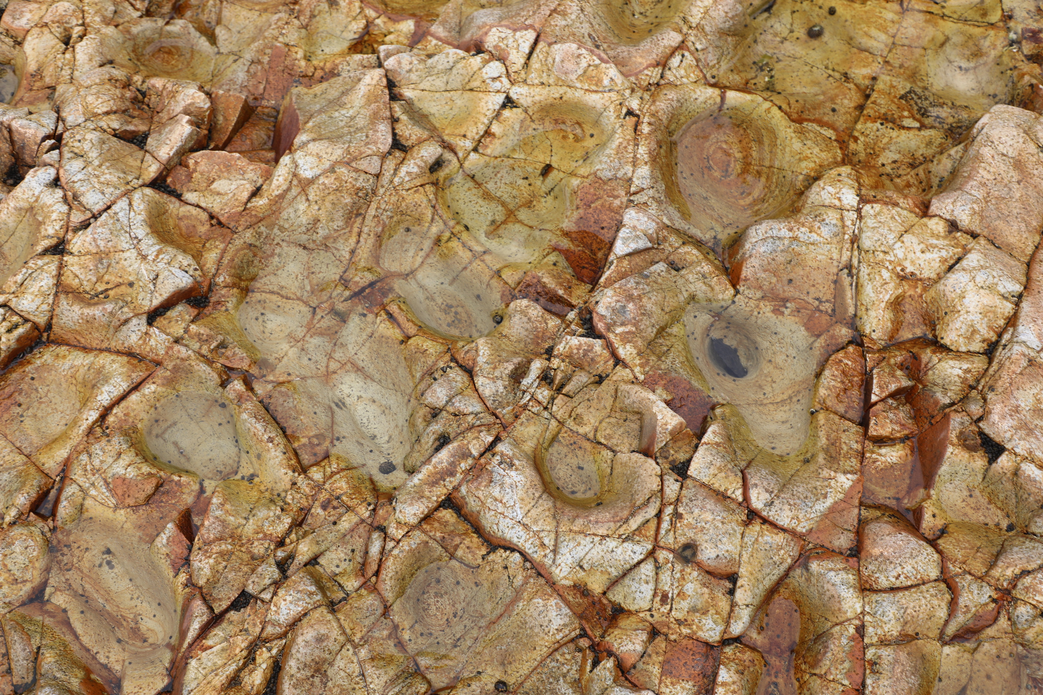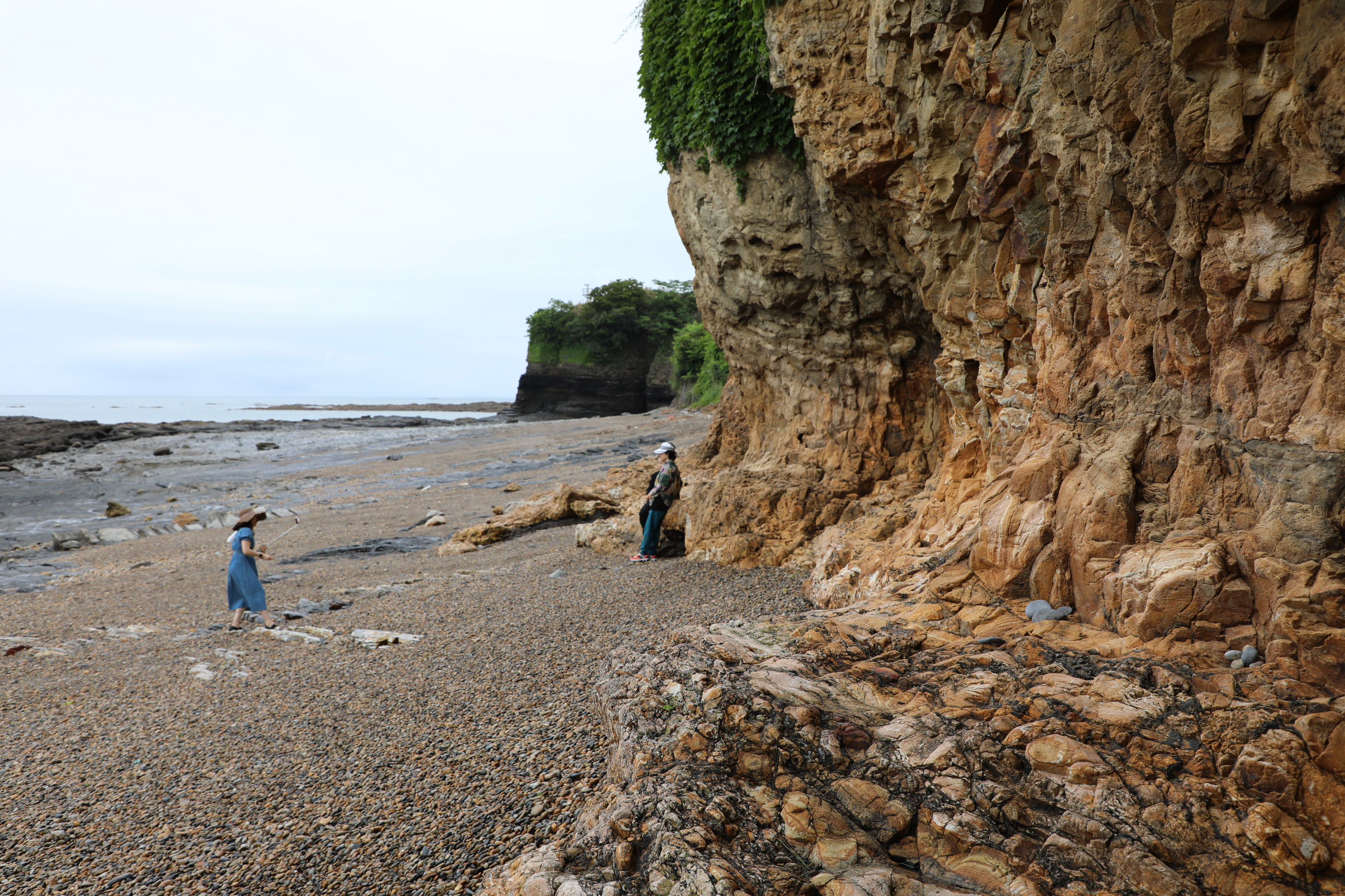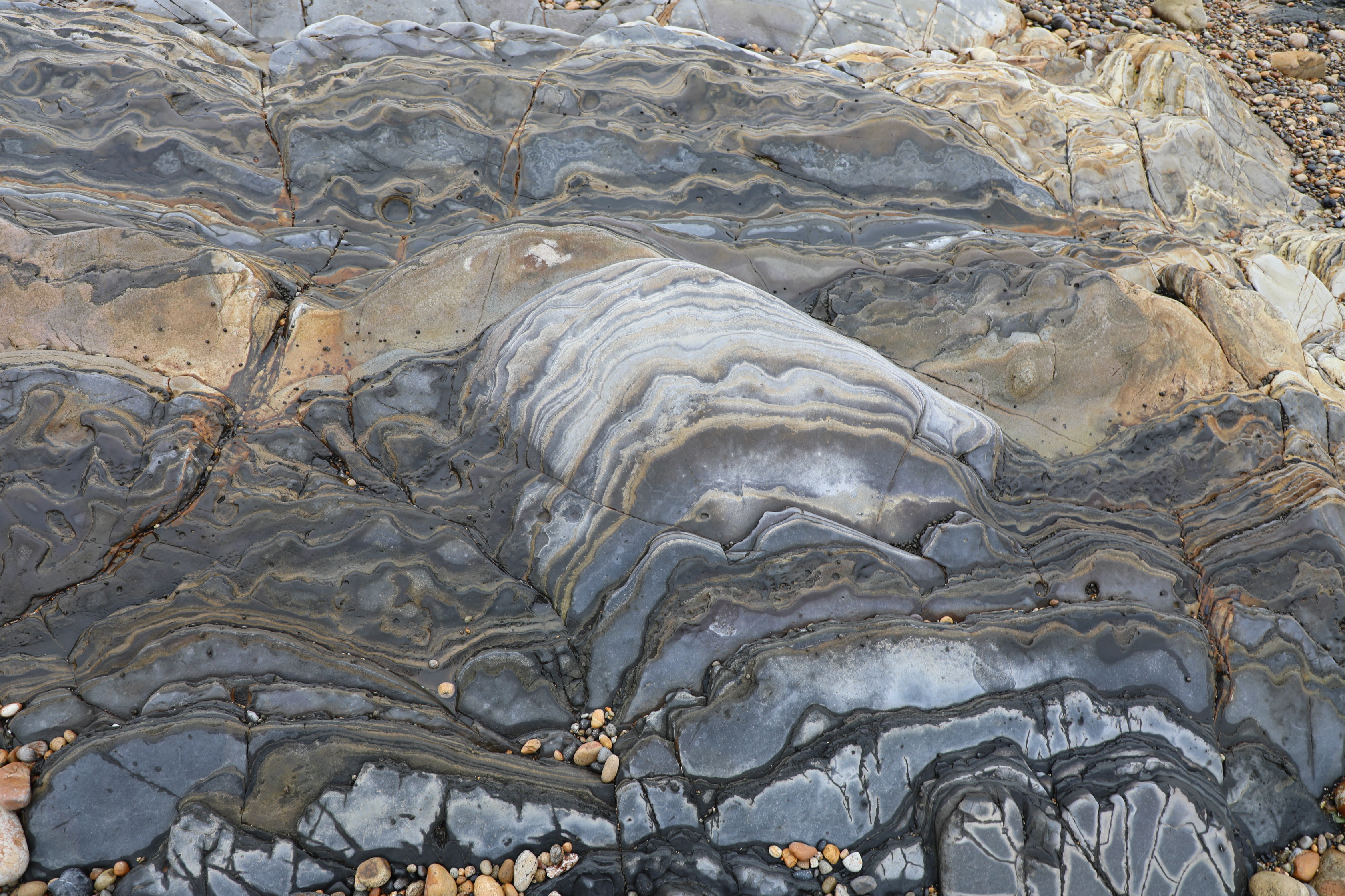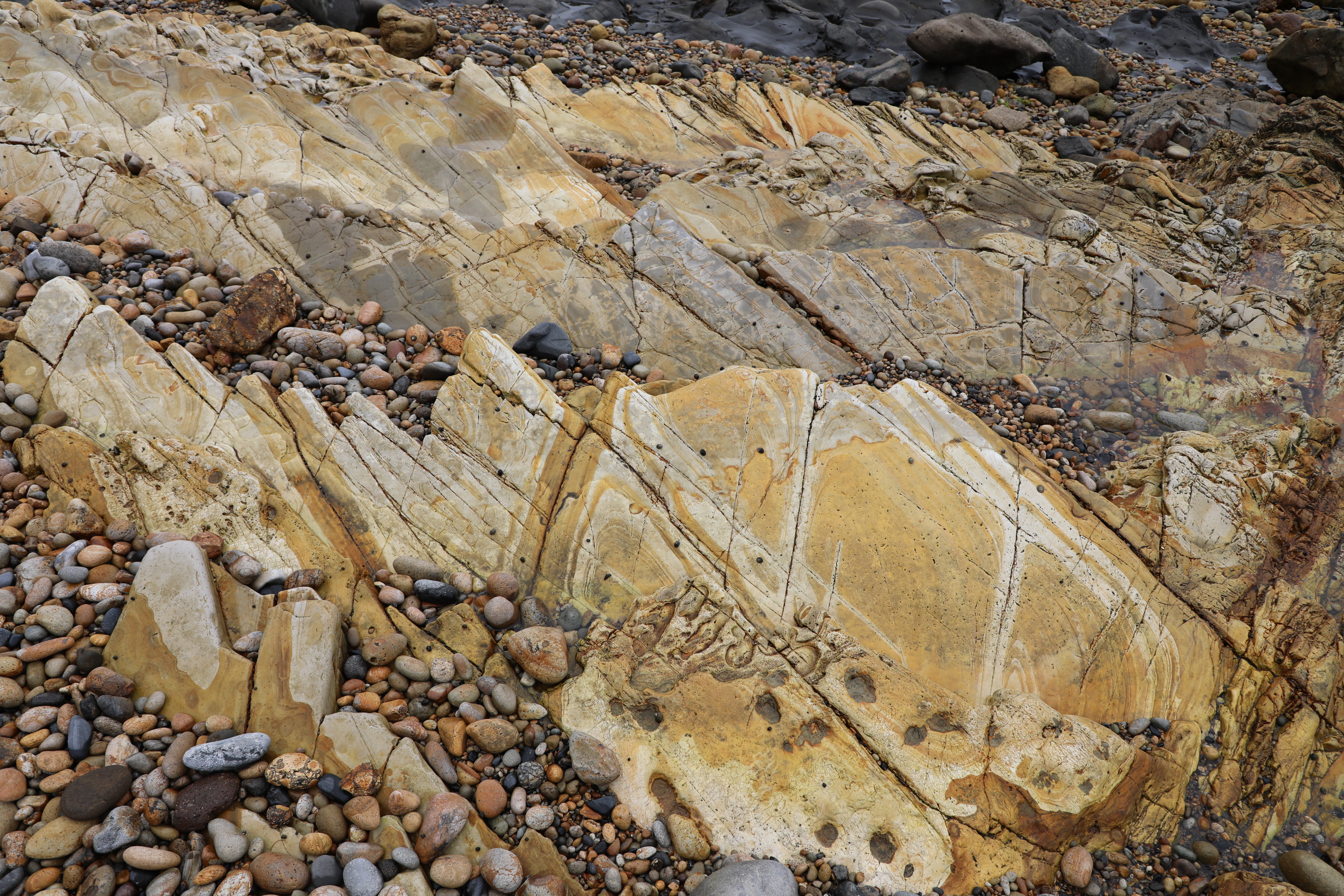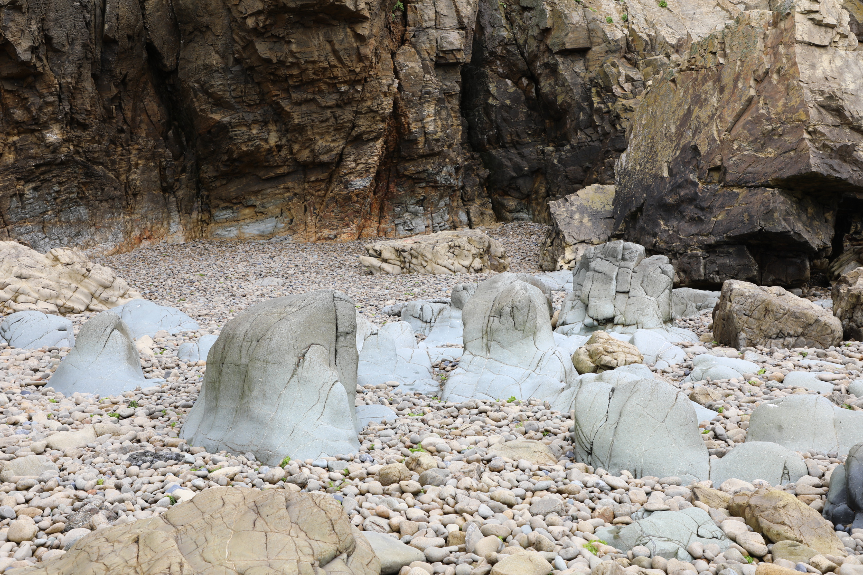 검은색과 적갈색 암반이 떨어져 나가며 이리저리 굴러다니며 닳고 닳아 몽돌이 된다.
