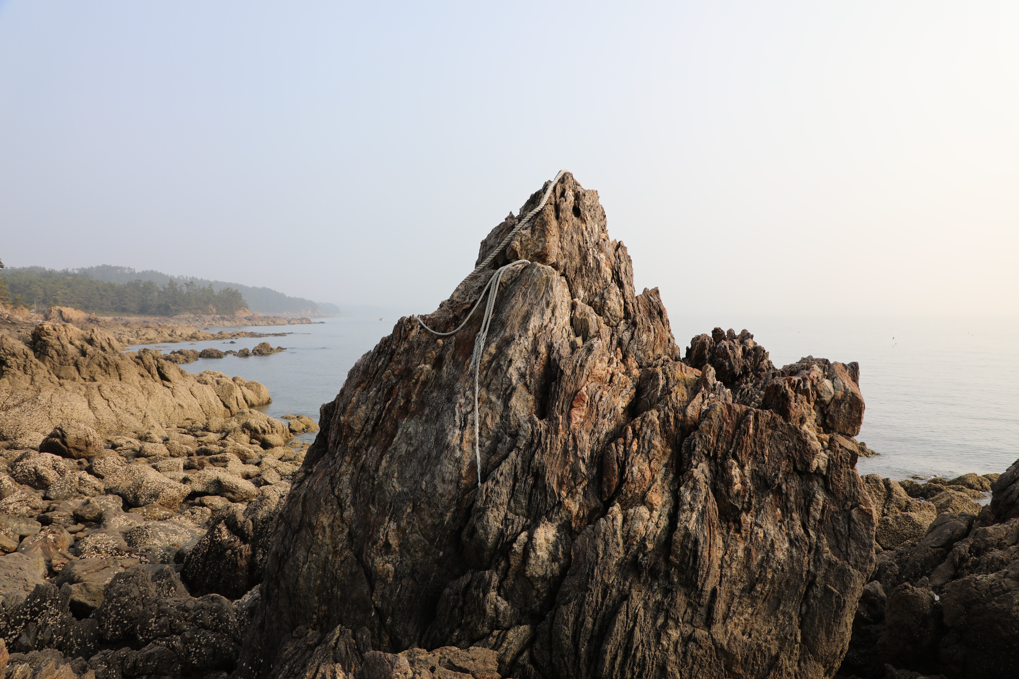 바위에 떠다니던 밧줄이 태풍에 밀렸으나 바위를 넘지 못한 것일까.