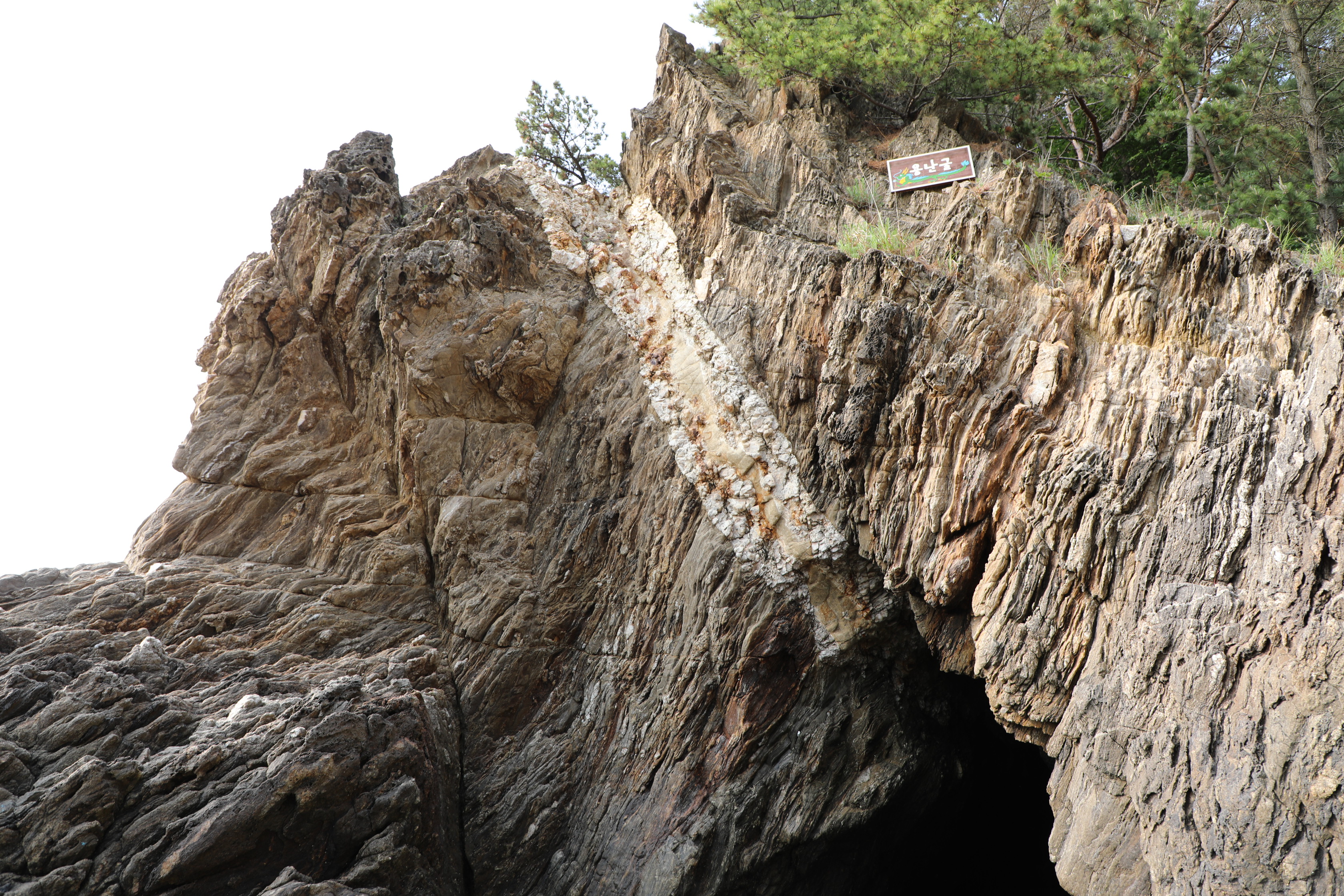 굴 밖으로 흰 암반이 길게 치고 올라가 용난굴을 더 특별하게 만든다.