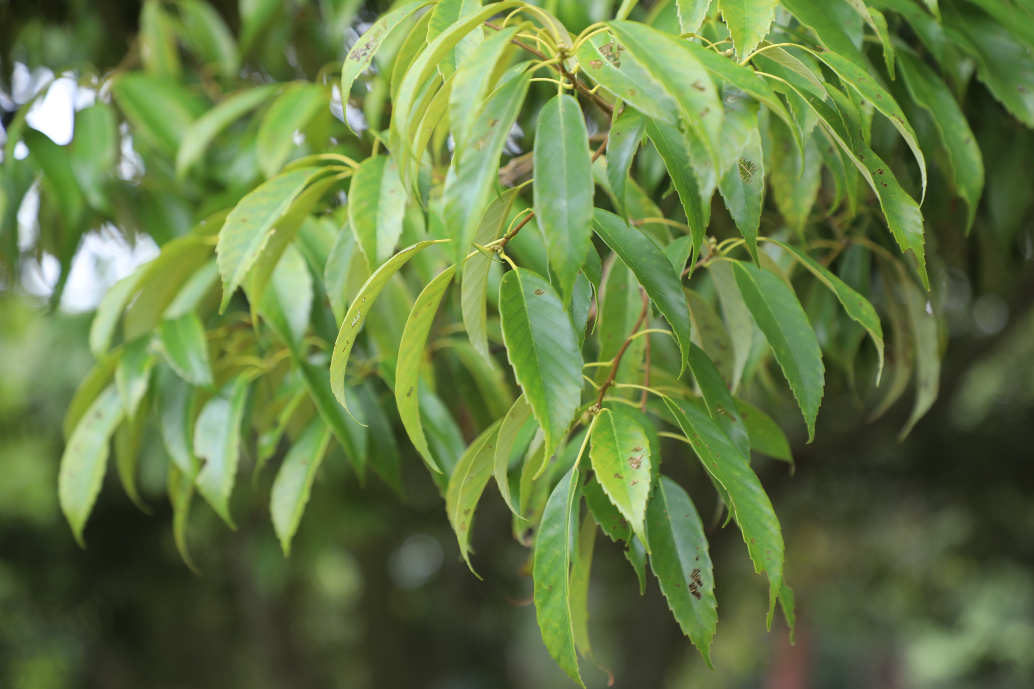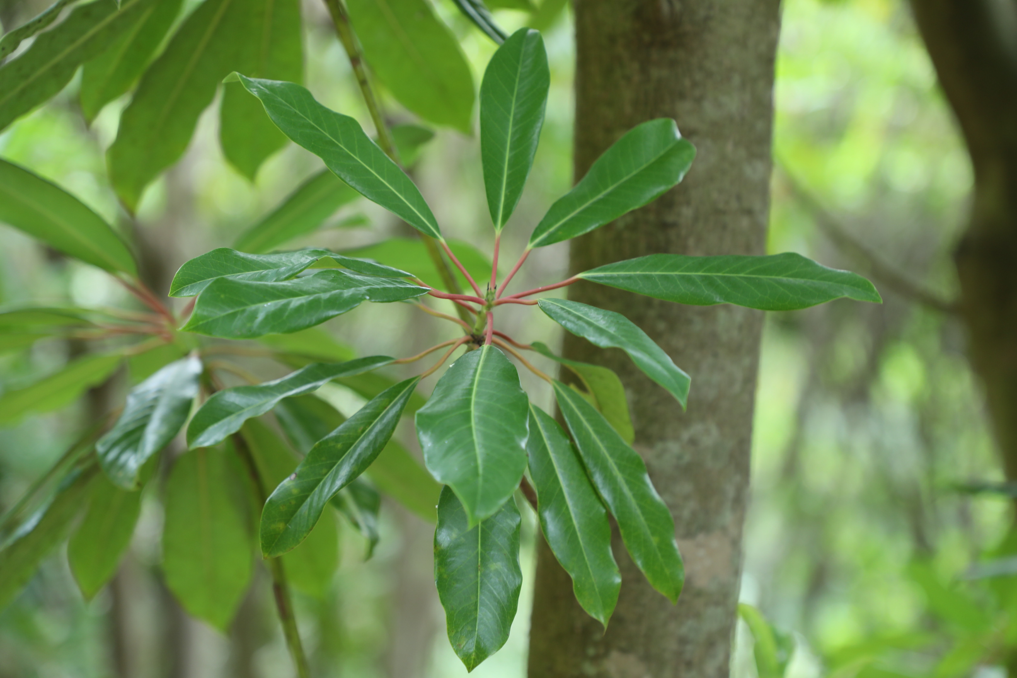 잎은 어긋나며, 도란형의 긴 타원형으로 길이 5-10cm이고 가장자리는 매끈하다.
