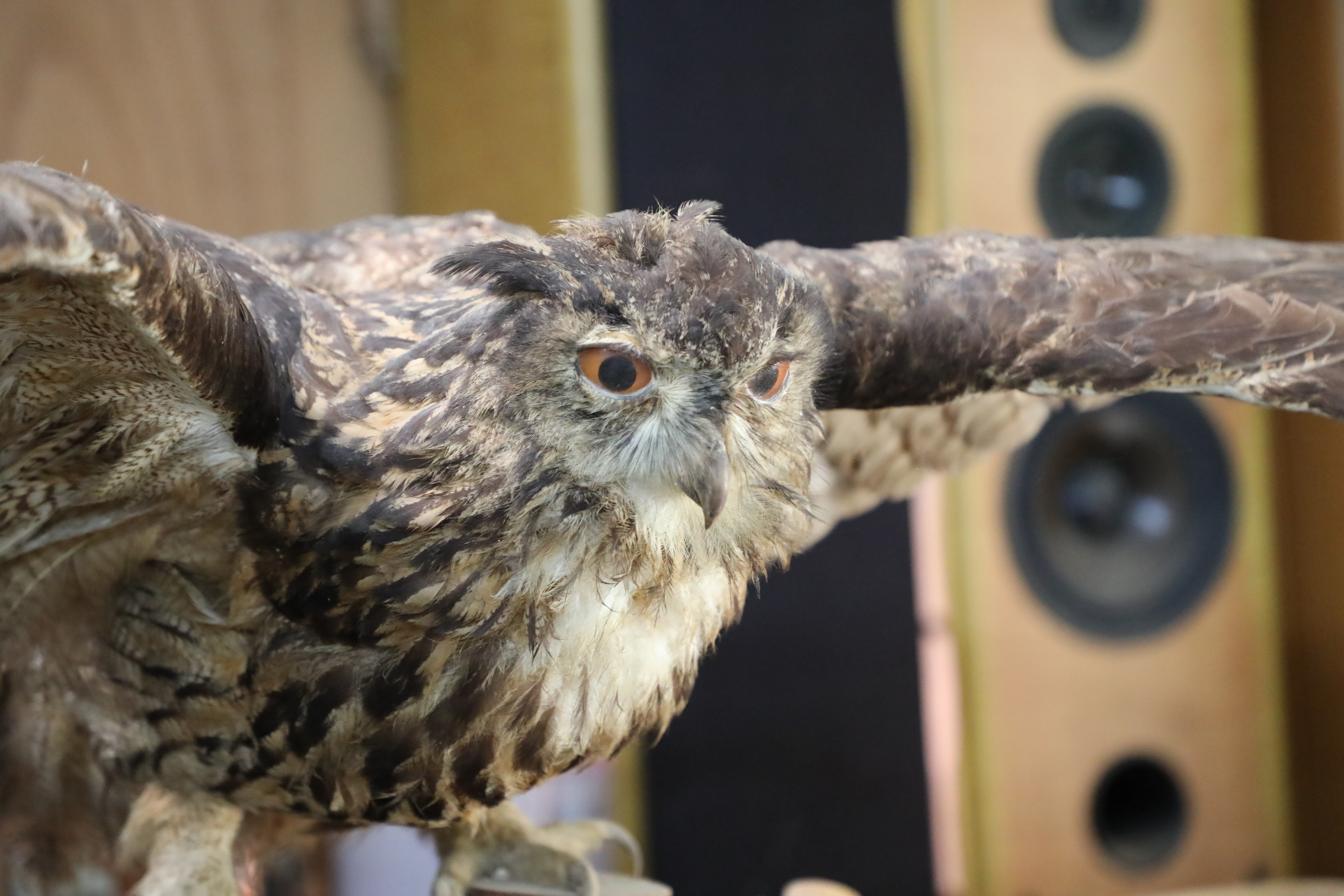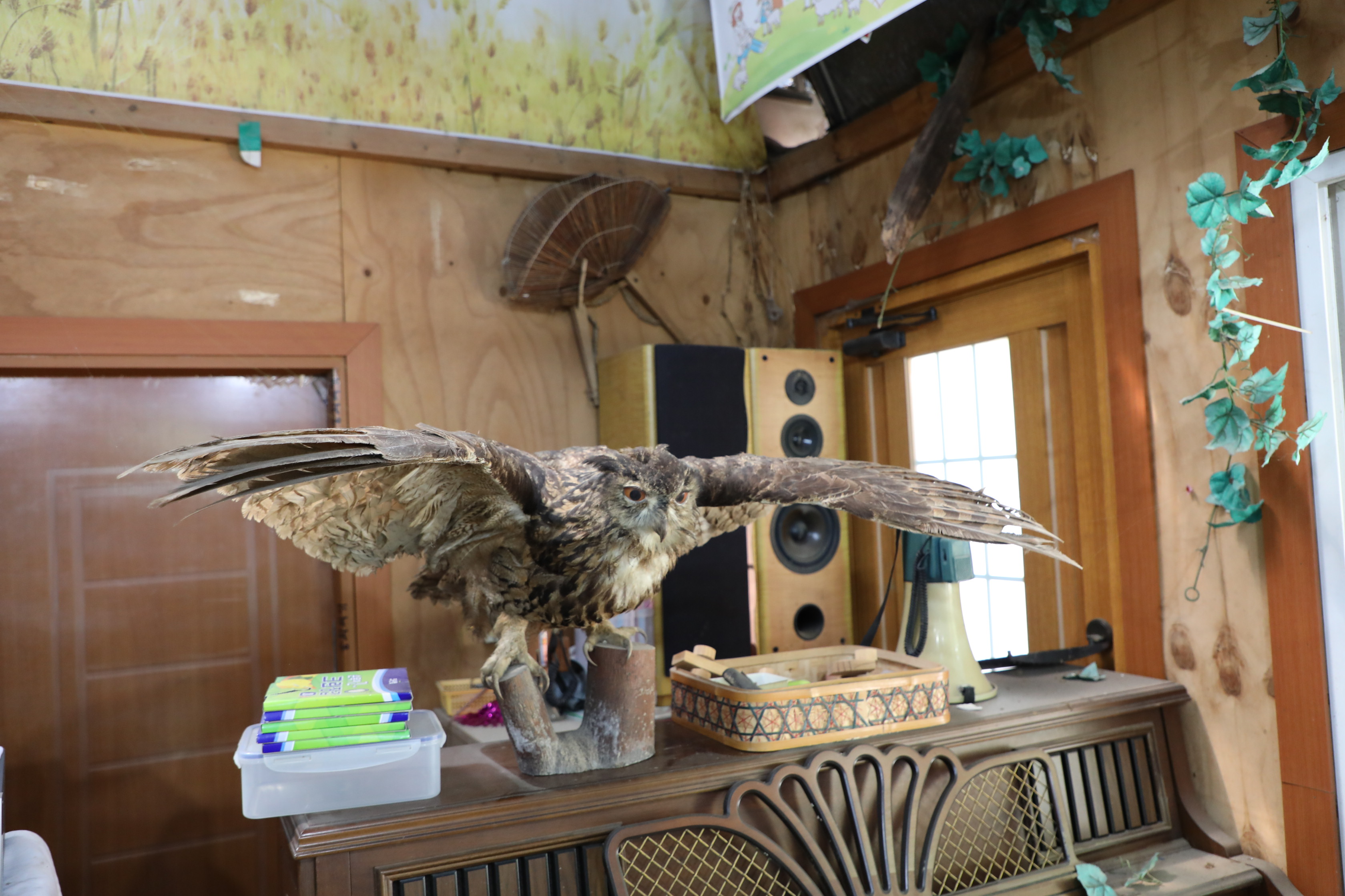 박재된 이놈은 귀처럼 보이는 깃털이 있는 것으로 보아 부엉이라고 한다.