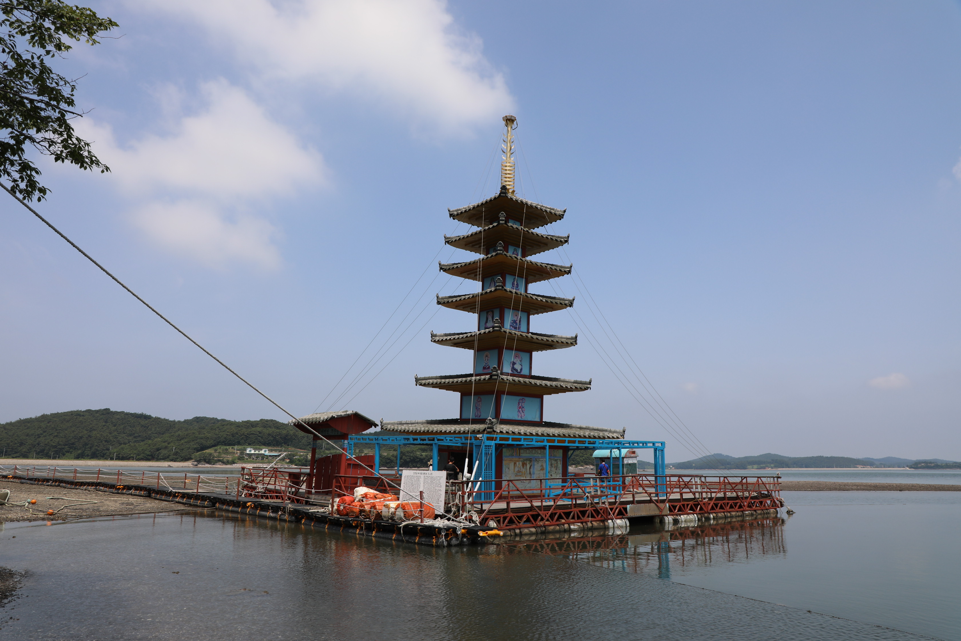 부상탑으로 들어가는 부교엔 한창 밀물이라 입구를 막아놓은 줄 알았다.