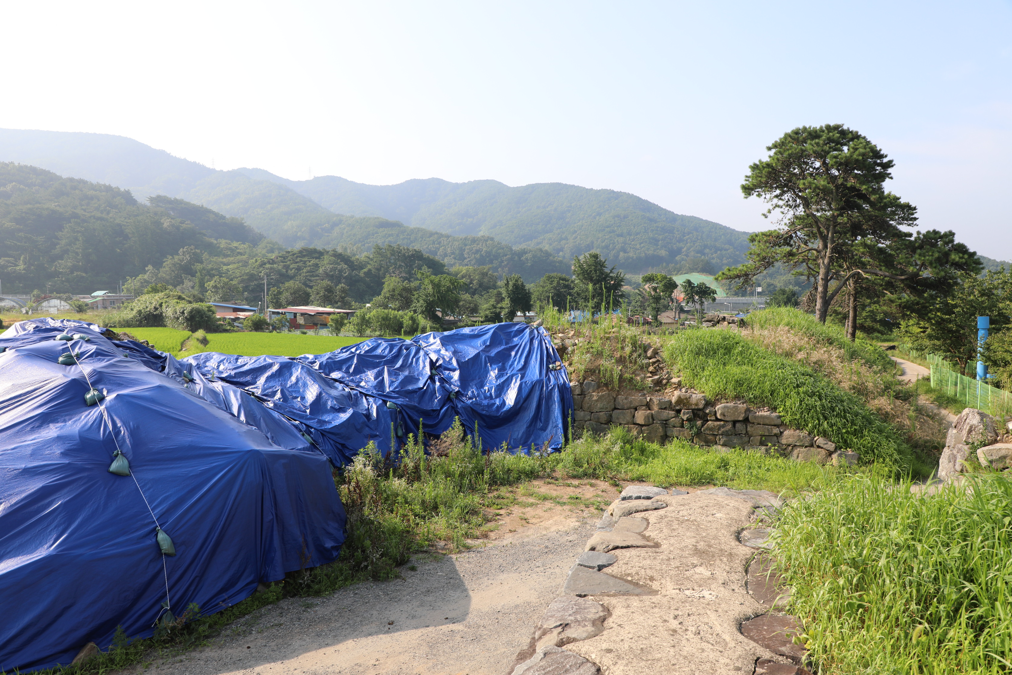 파란 천막은 옹성이 비에 더 이상 무너지지 않도록 뒤집어 씌웠다.