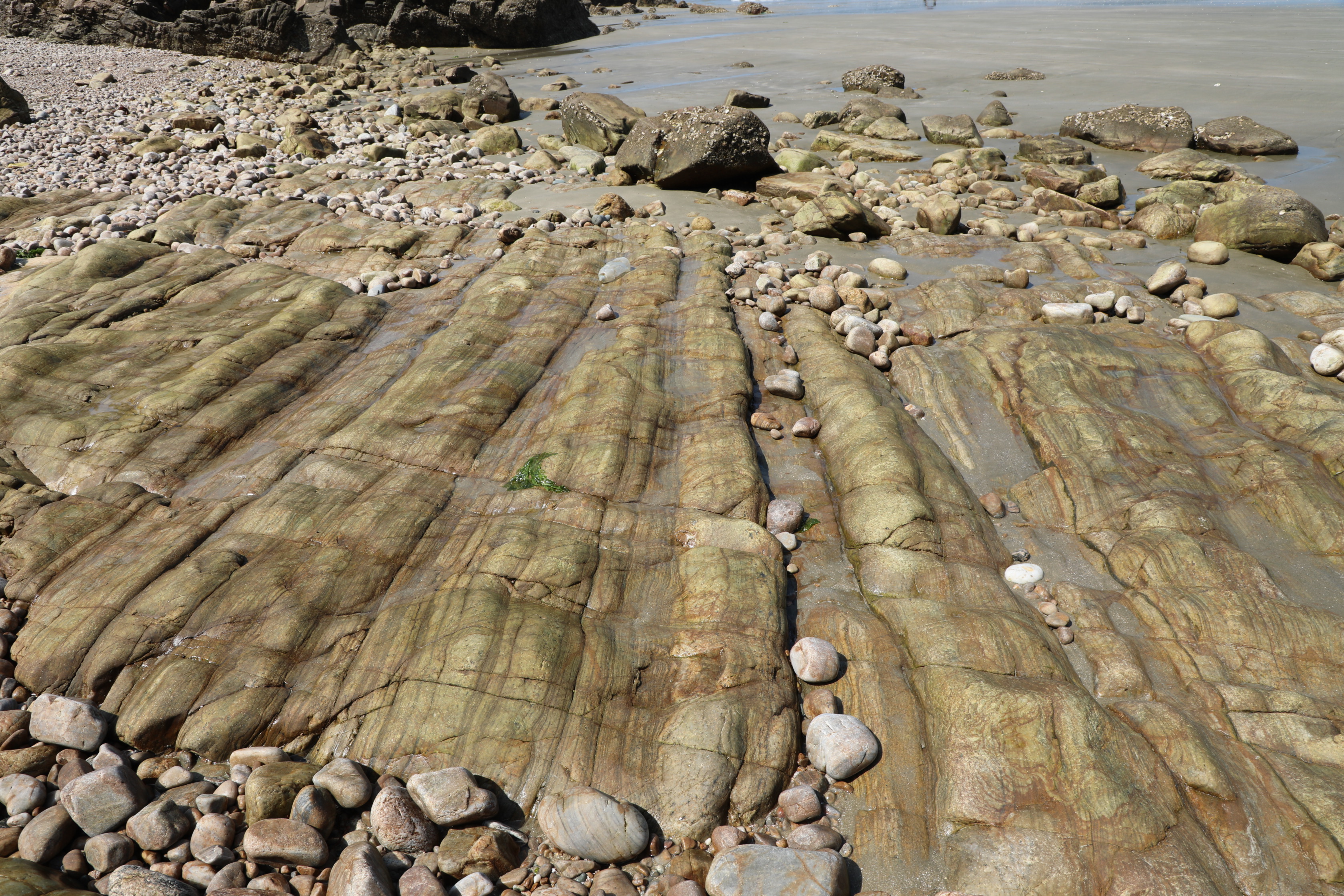 골판지 같은 이 바위를 따라 움직인 크고 작은 돌이 원형의 모습을 보여준다.