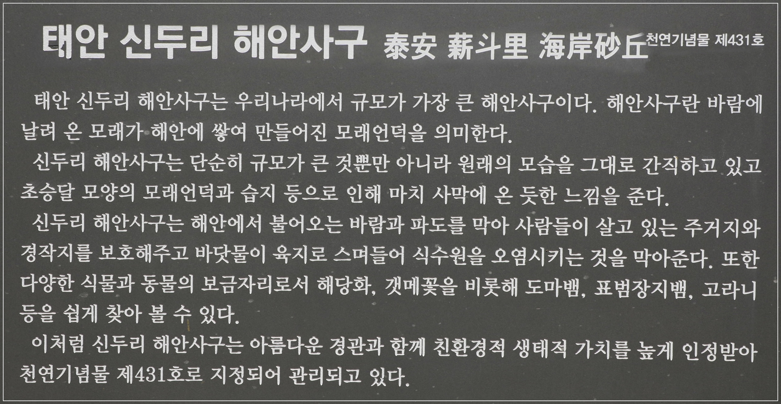 태안 신두리 해안사구는 우리나라 최고의 사구지대로 태안군 신두리 해수욕장에 위치하고 있으며