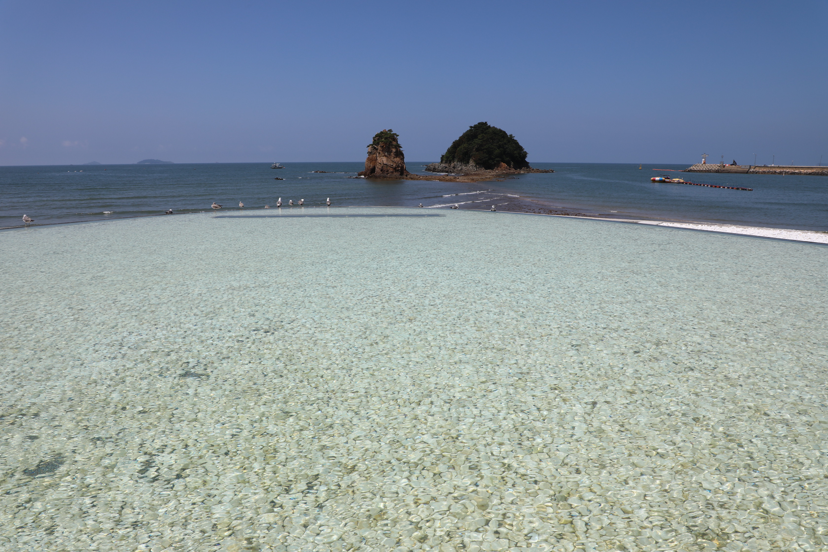 수영장을 배경을 할미 할아비 바위를 잡았다.