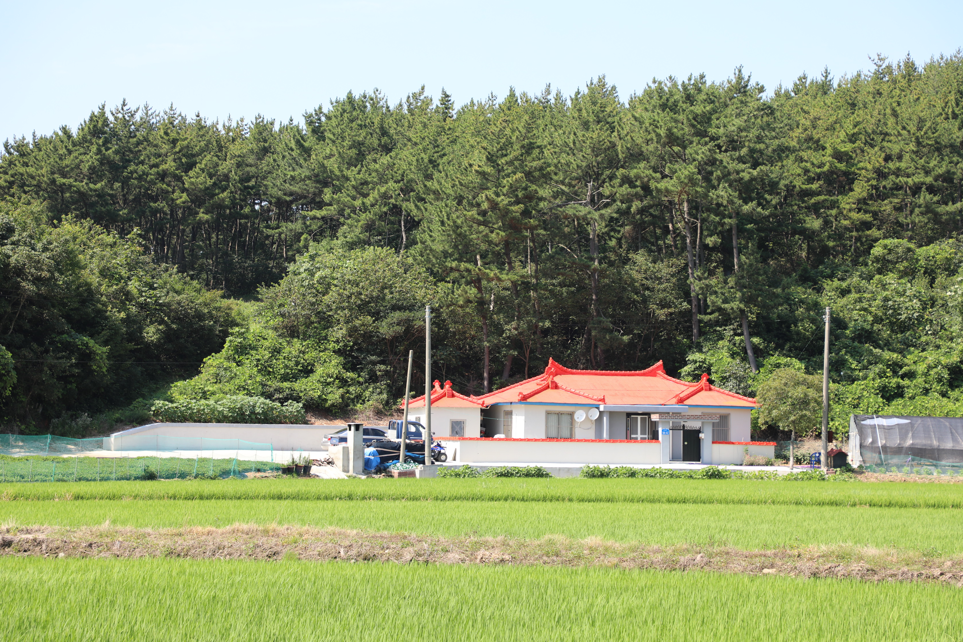온통 푸른 바탕에 붉은 지붕과 흰색 담장이 주택을 도드라지게 포인트를 준다.