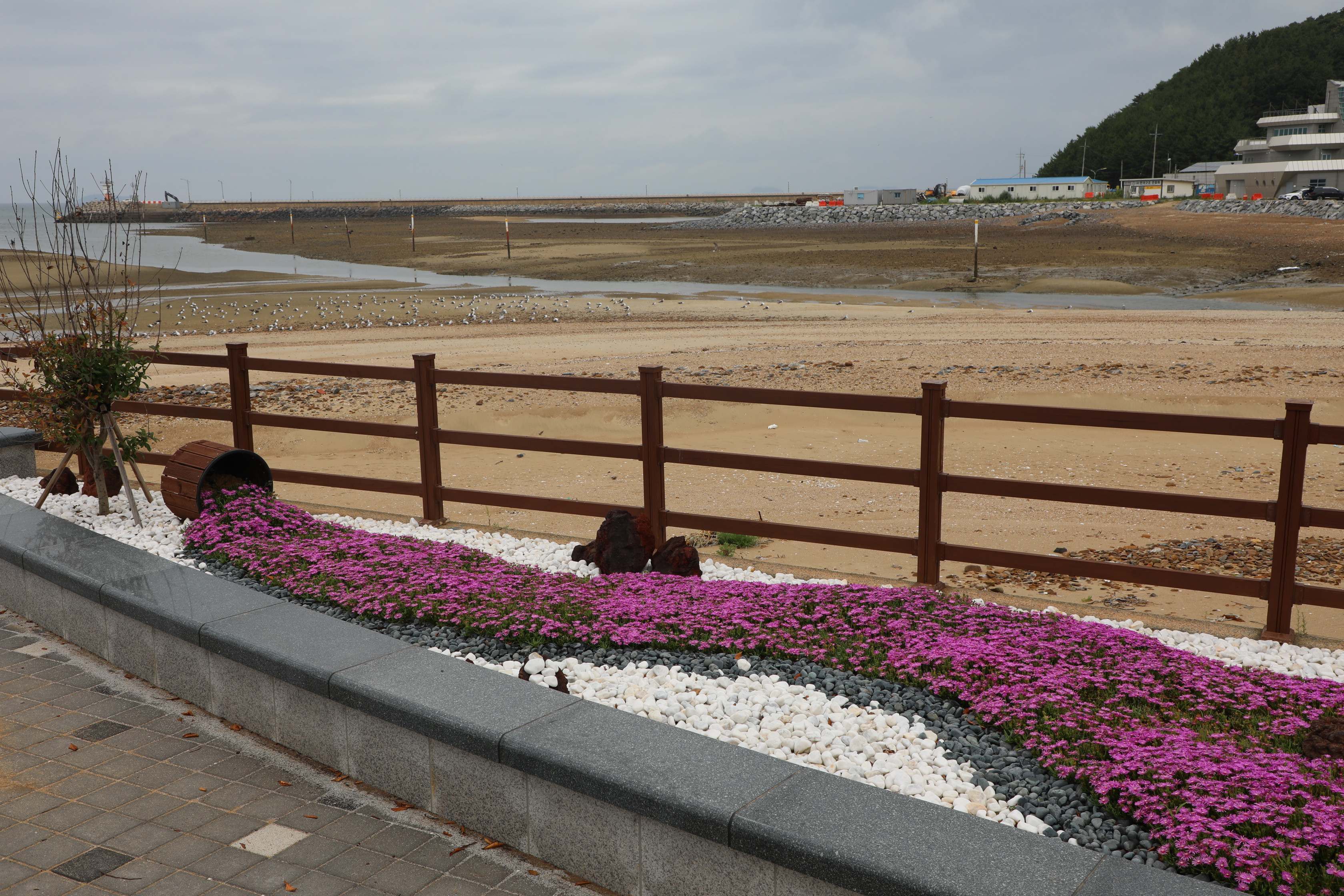 꽃지로 가는 길 화단엔 항아리에서 쏟아놓은 꽃이 흘러 화단을 메꾸고 있다.