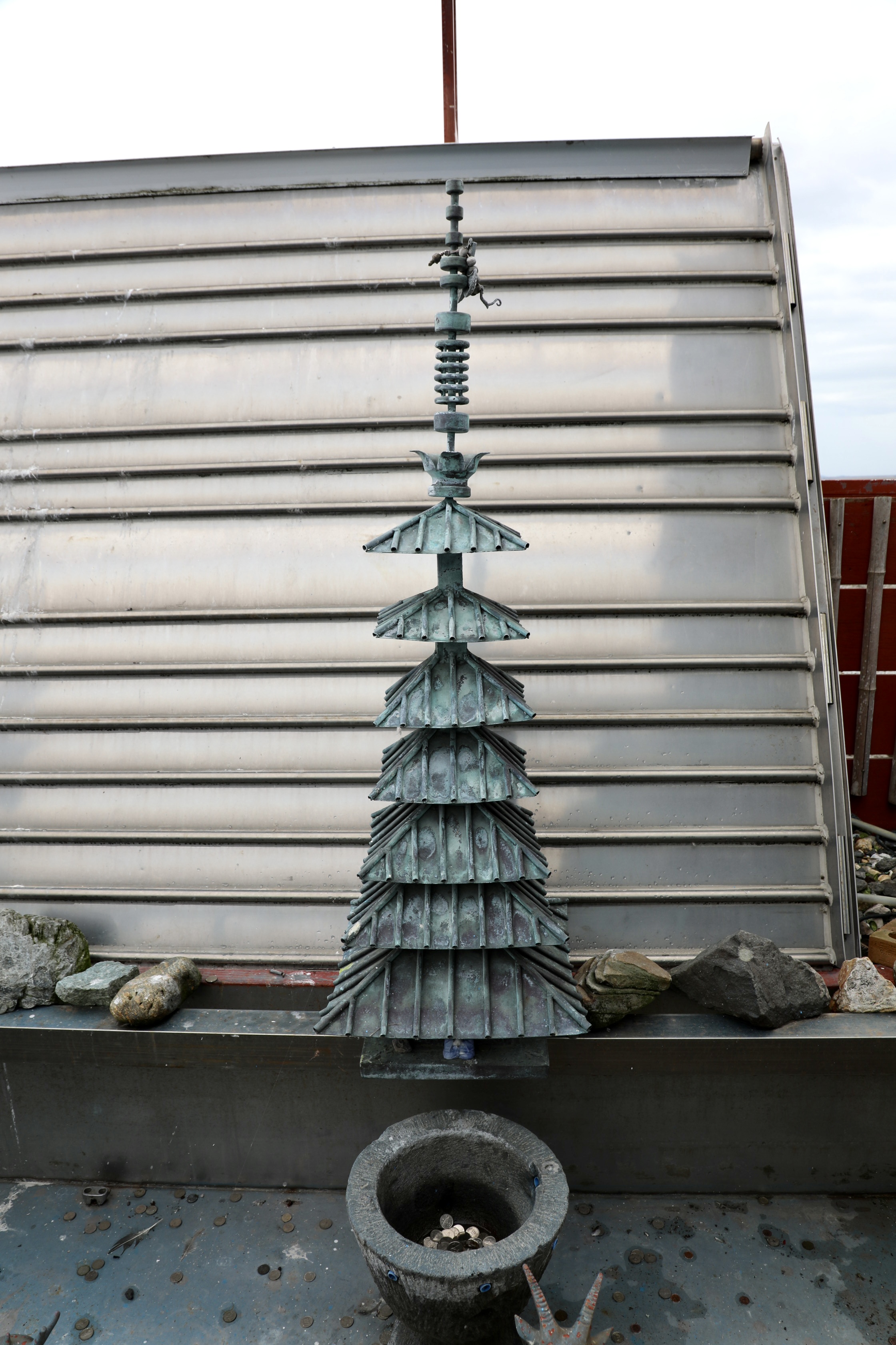 부상탑이 세워진 부교 한쪽에 놓인 소형 7층 청동 탑