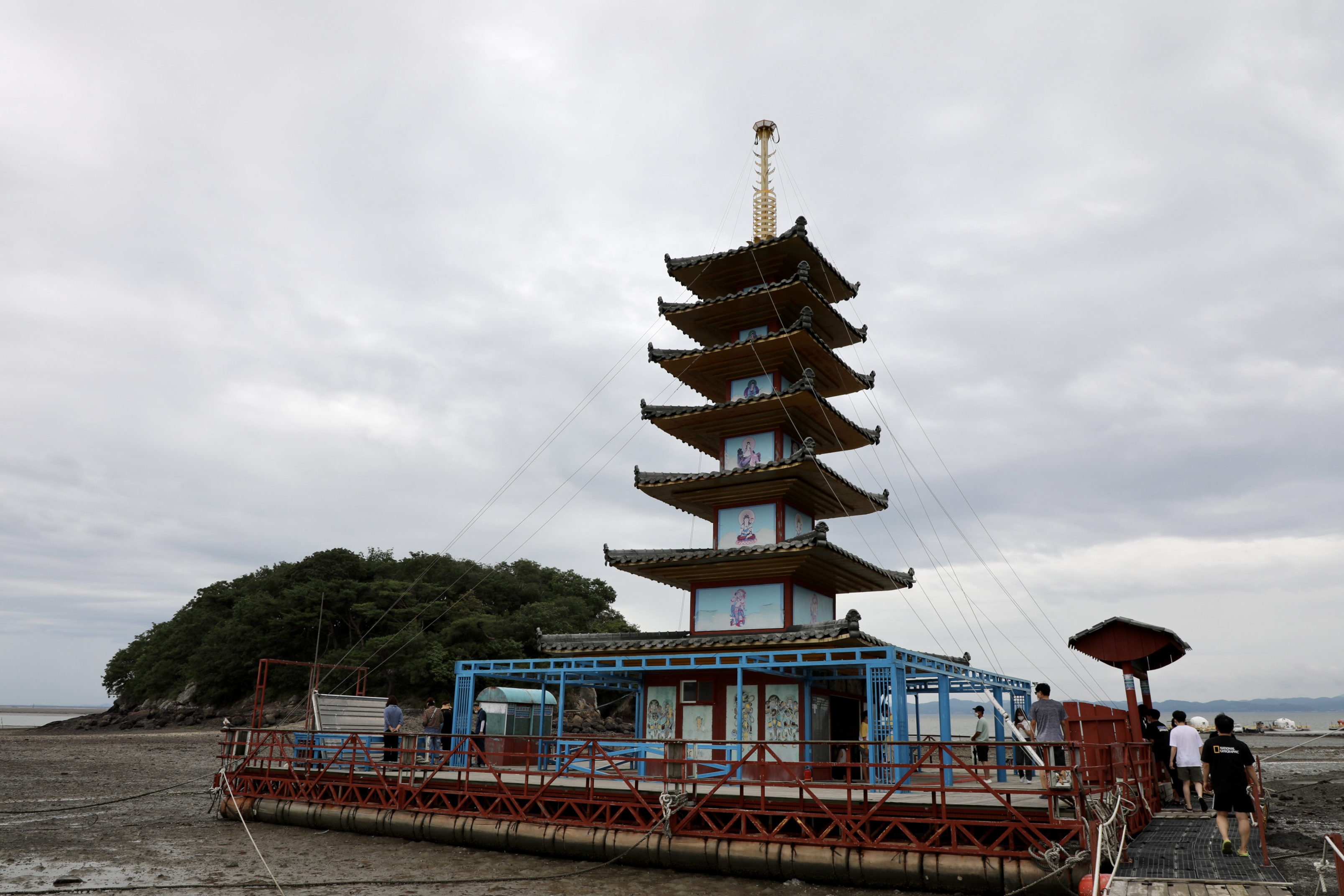 즐풍은 두 번째 안면암을 방문하기에 먼저 여우섬 앞에 있는 부상탑을 보여주기 위해 부교를 건넌다.
