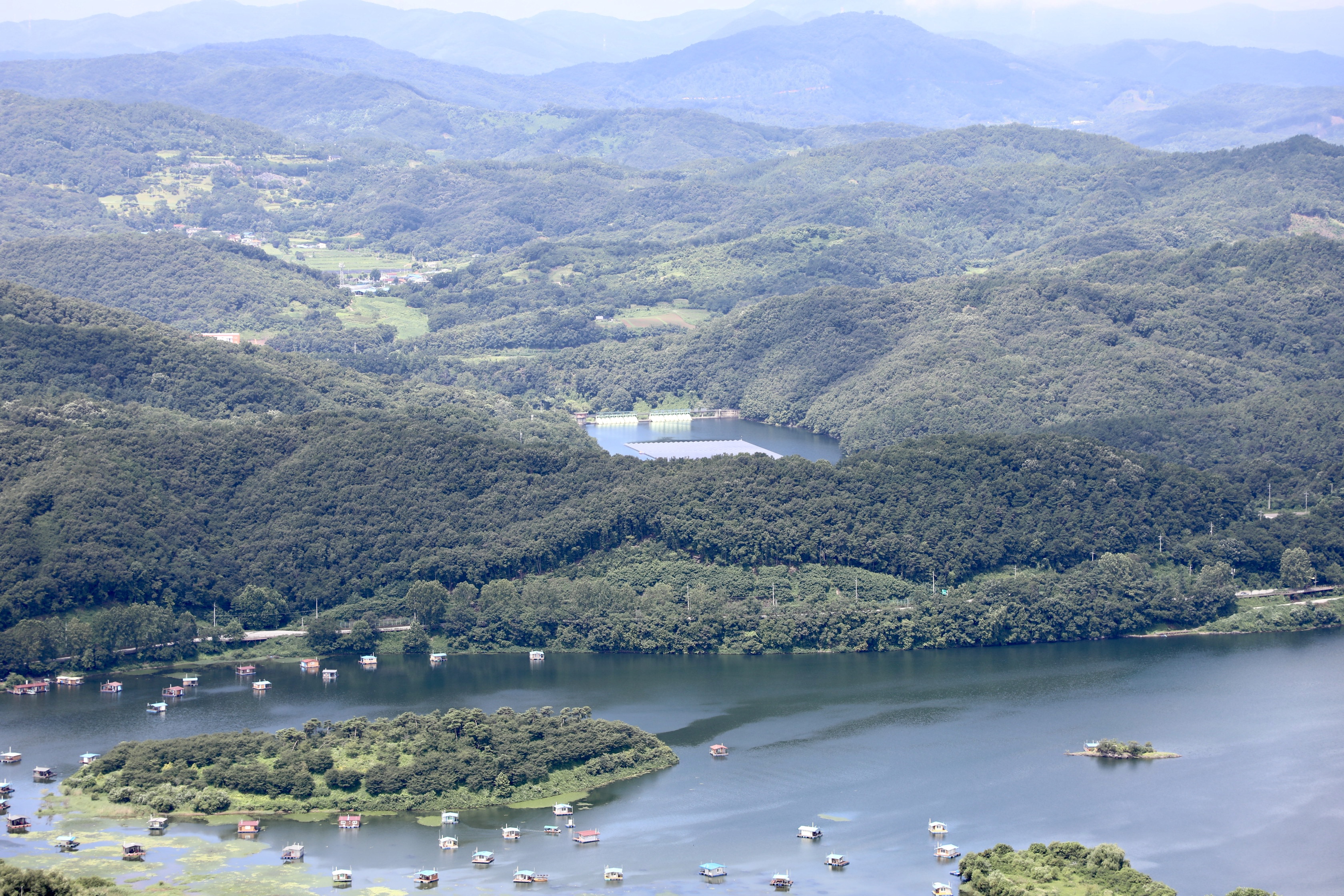 두타산(598m) 삼형제봉에서 초평호를 굽어보면 위로는 중국이,