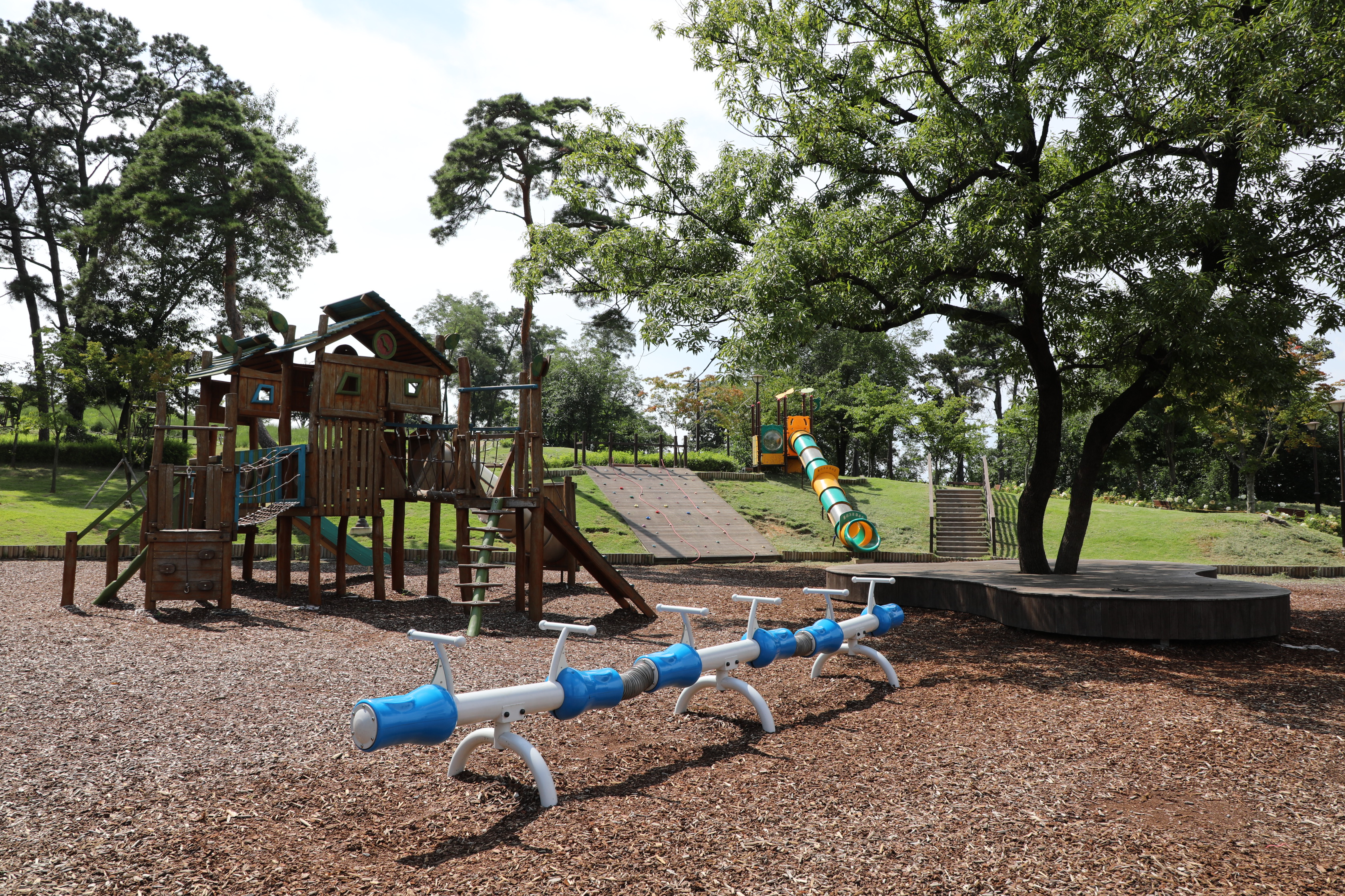 놀이터 바닥에 아이들이 넘어져도 다치치 않게 나무 부스러기를 깔았다.