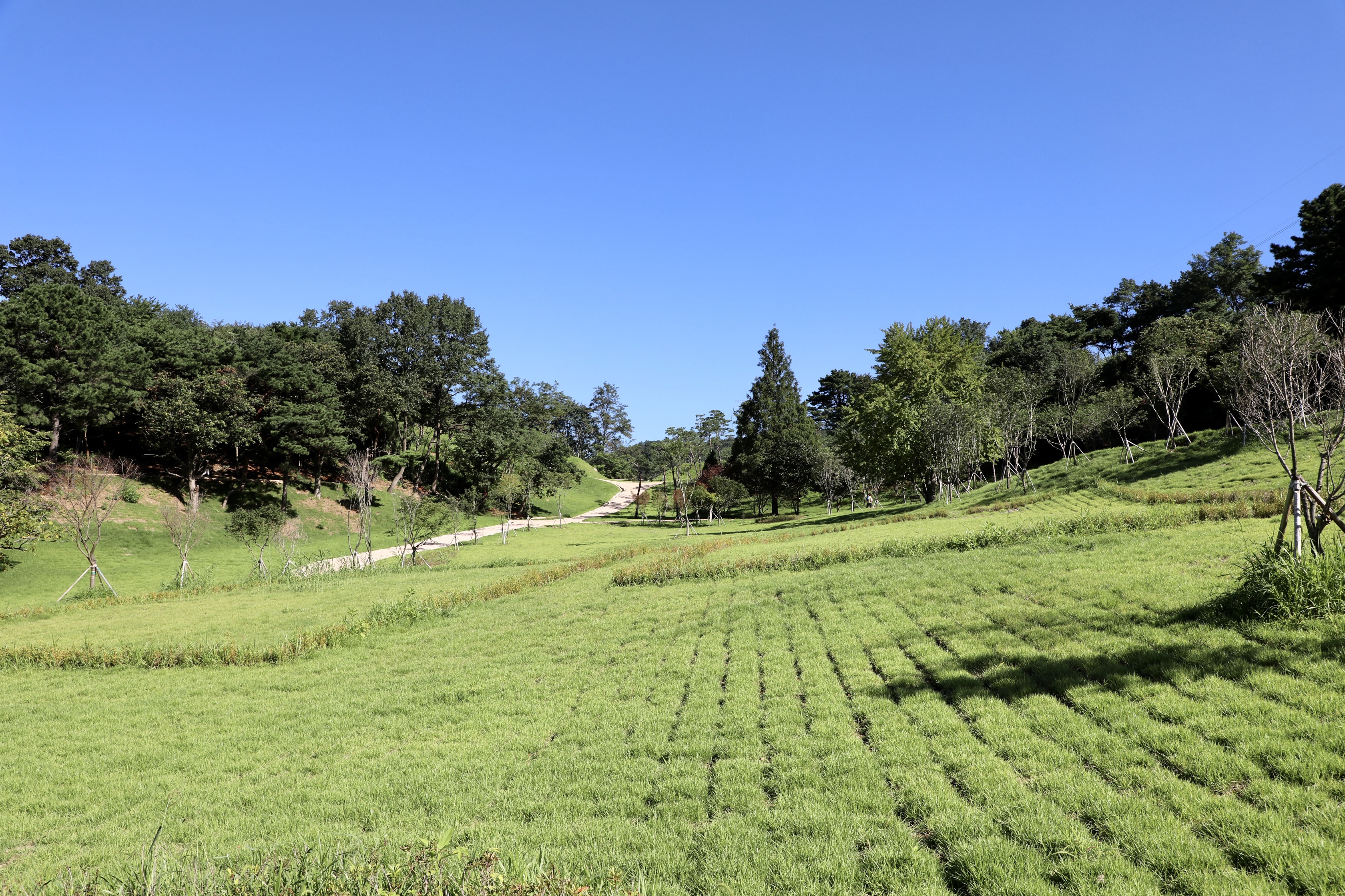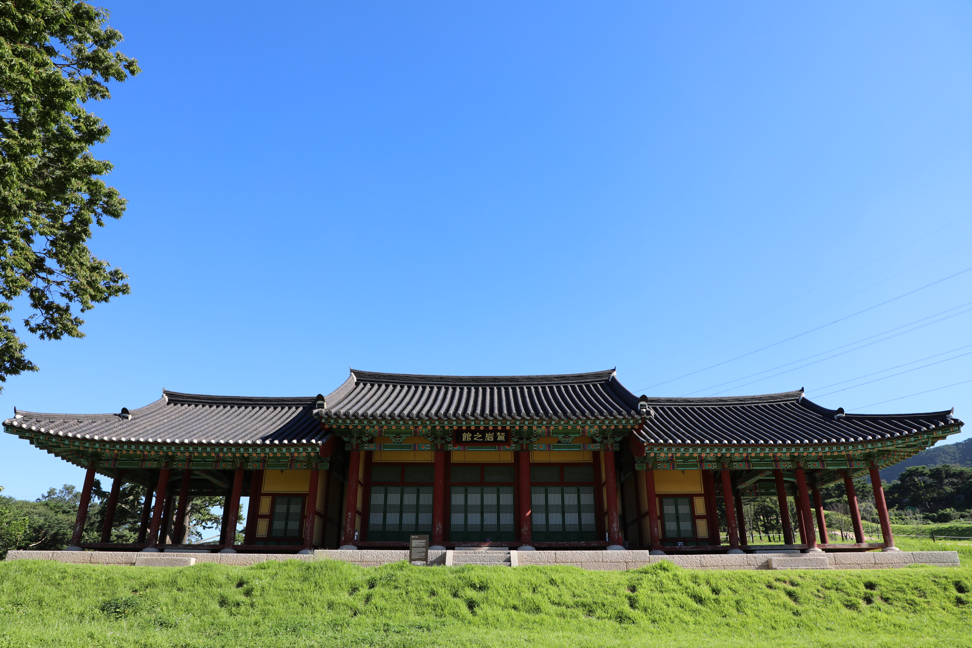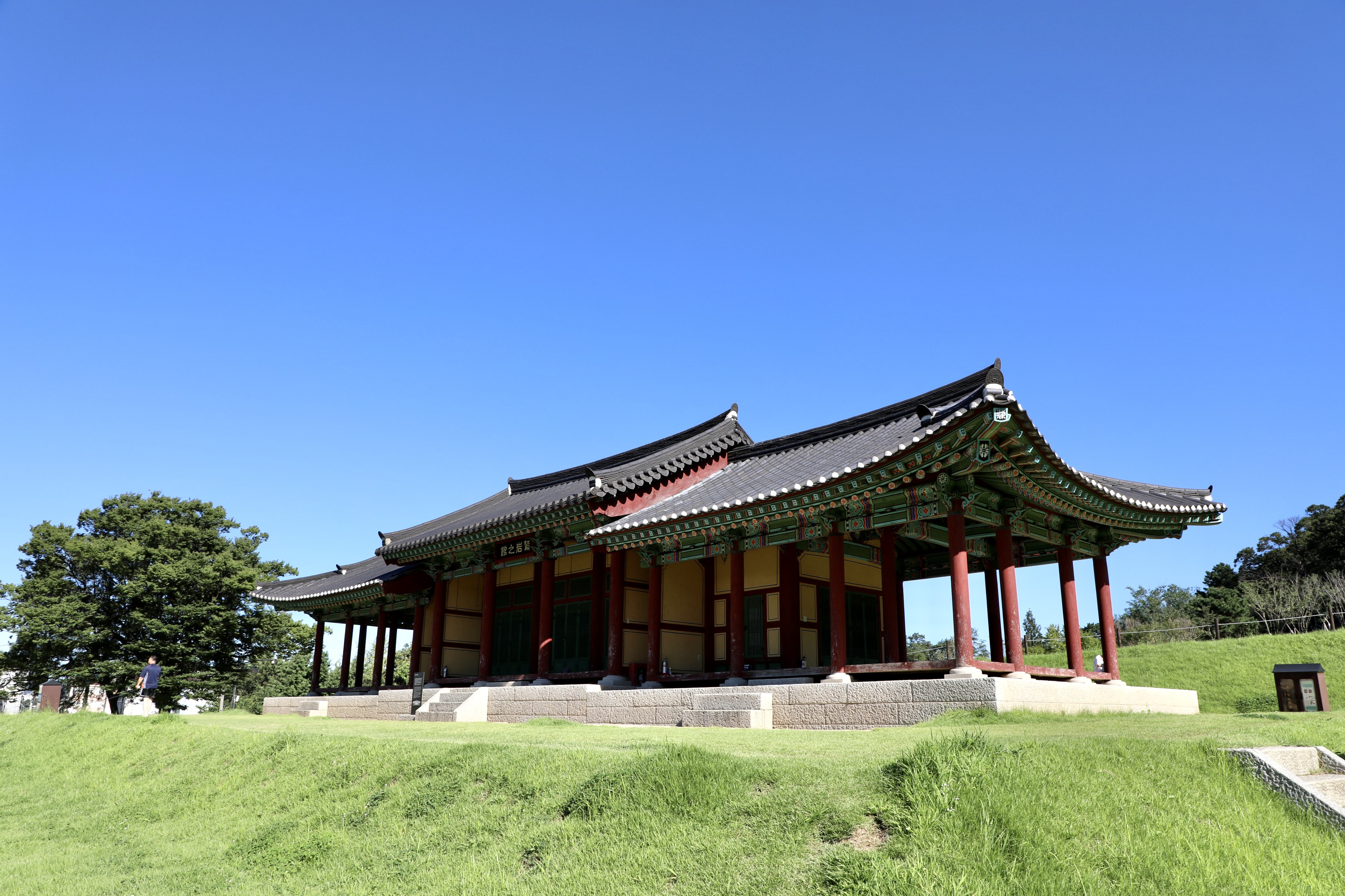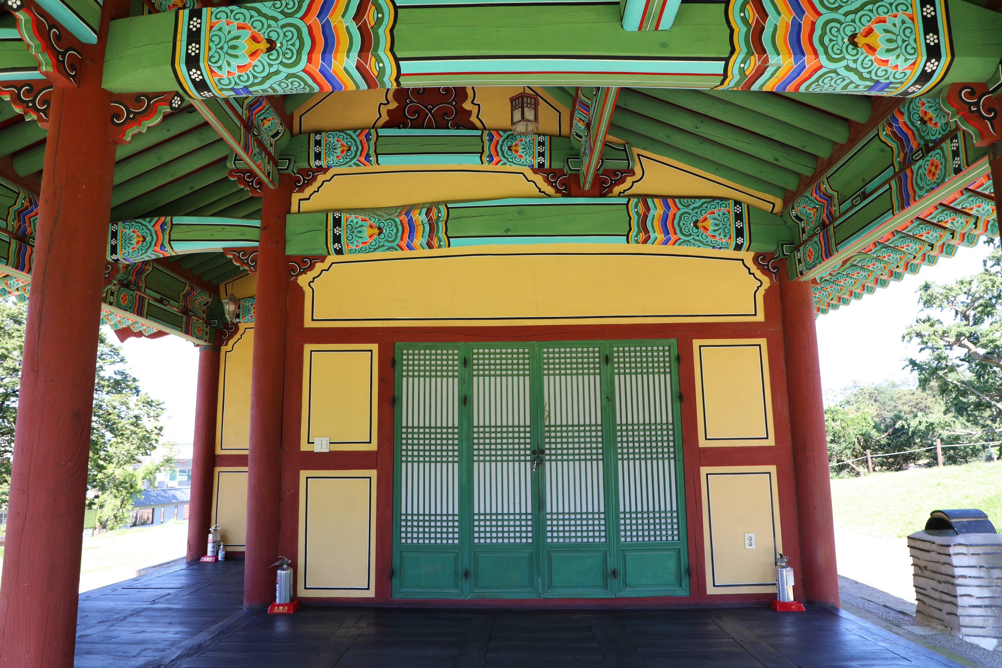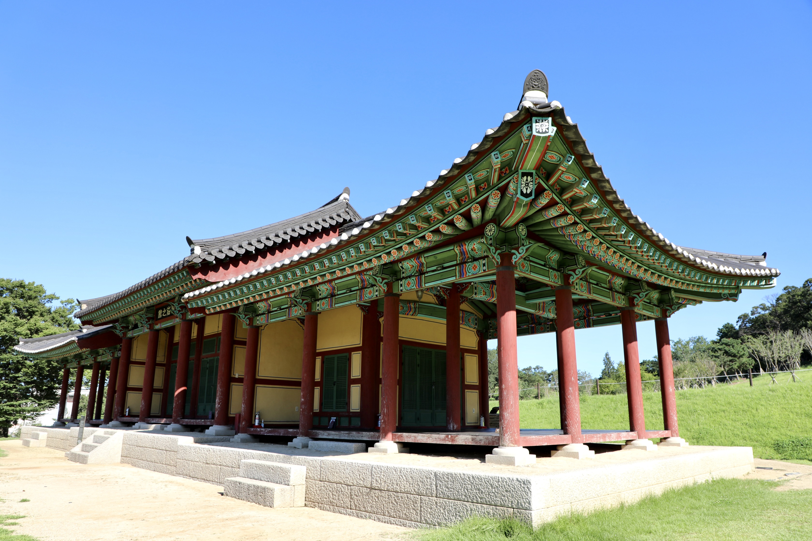 푸른 잔디 위의 누각에 붉은색을 칠한 기둥과 검은 지붕이 잘 어울린다.