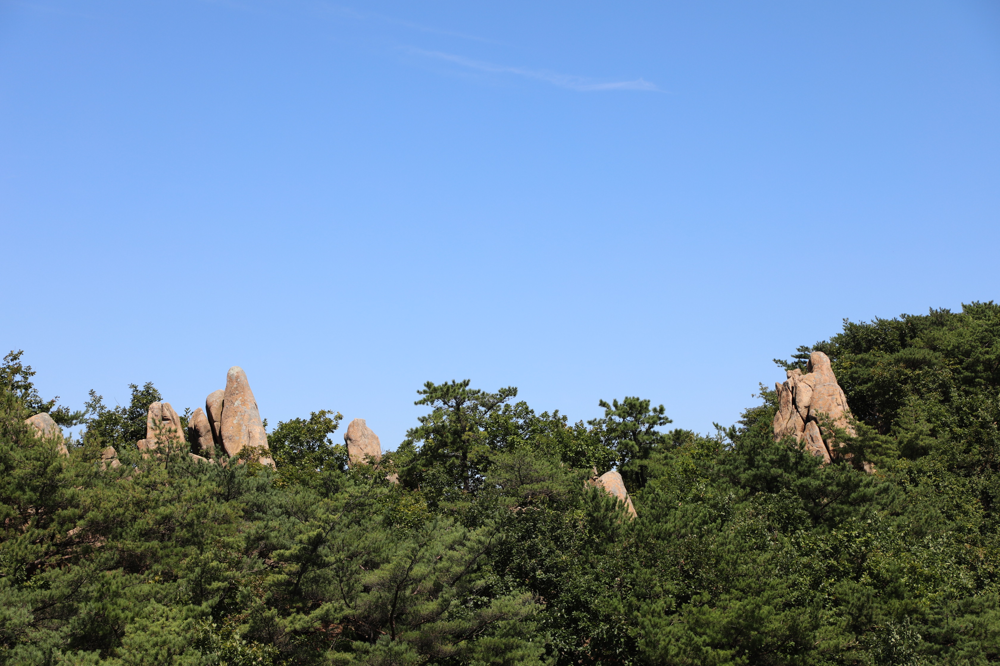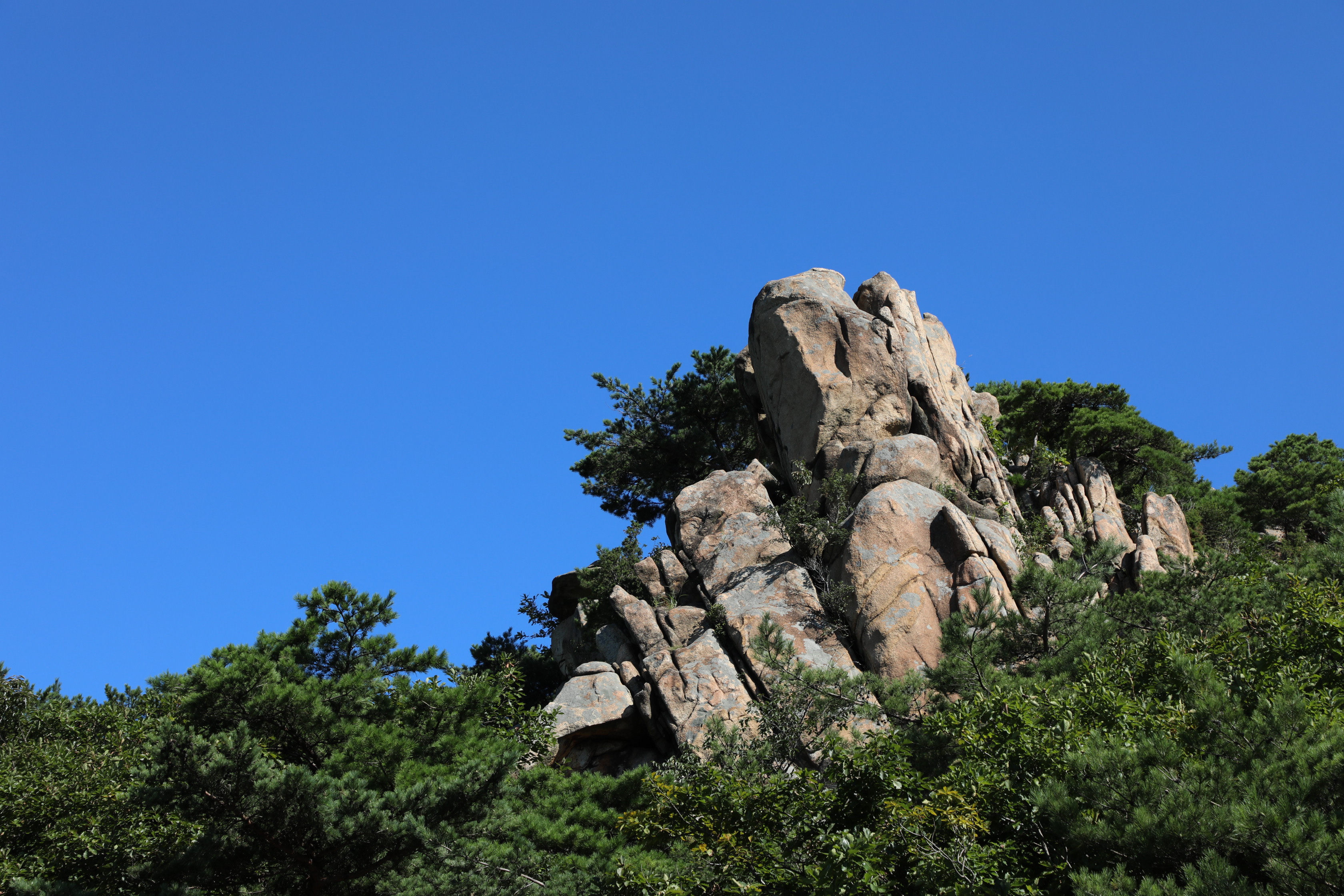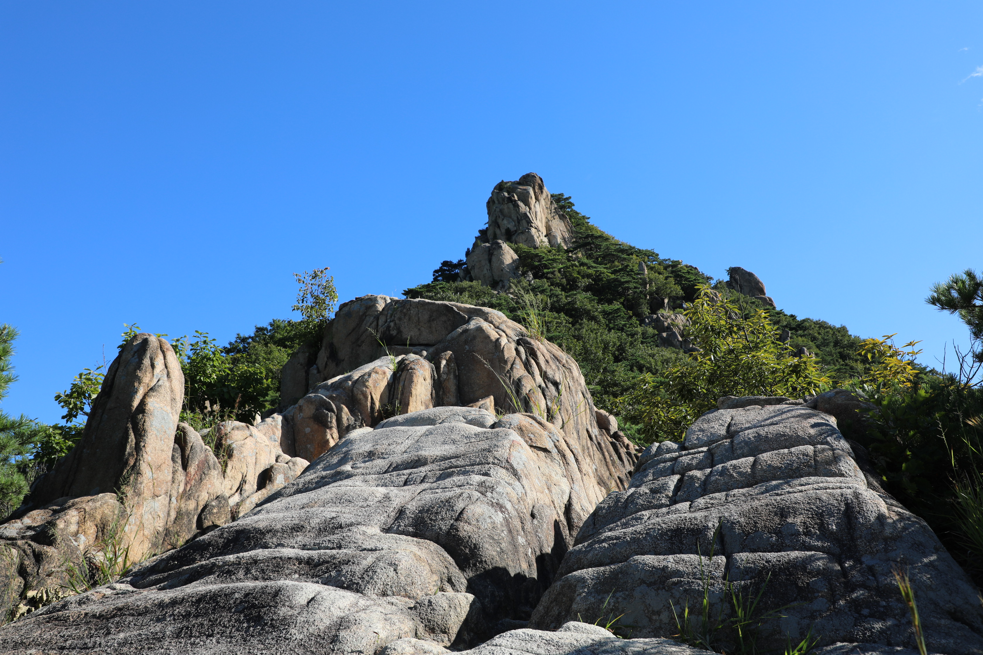 푸른 산에 불꽃처럼 일어선 바위가 멋지다.