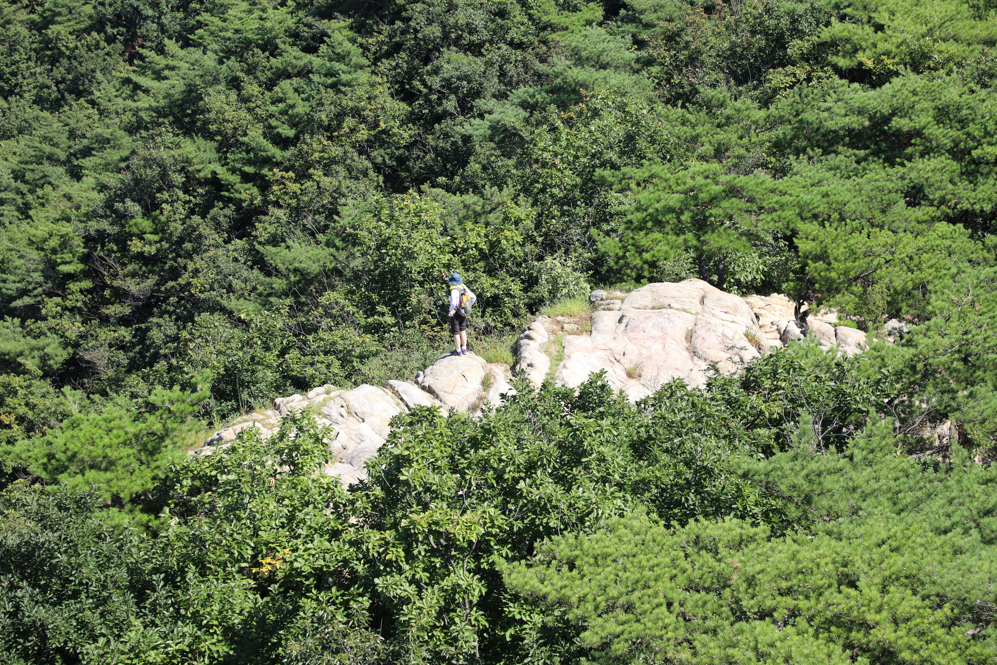 숲 사이로 조금 드러난 바위에서 주변을 조망하는 등산객