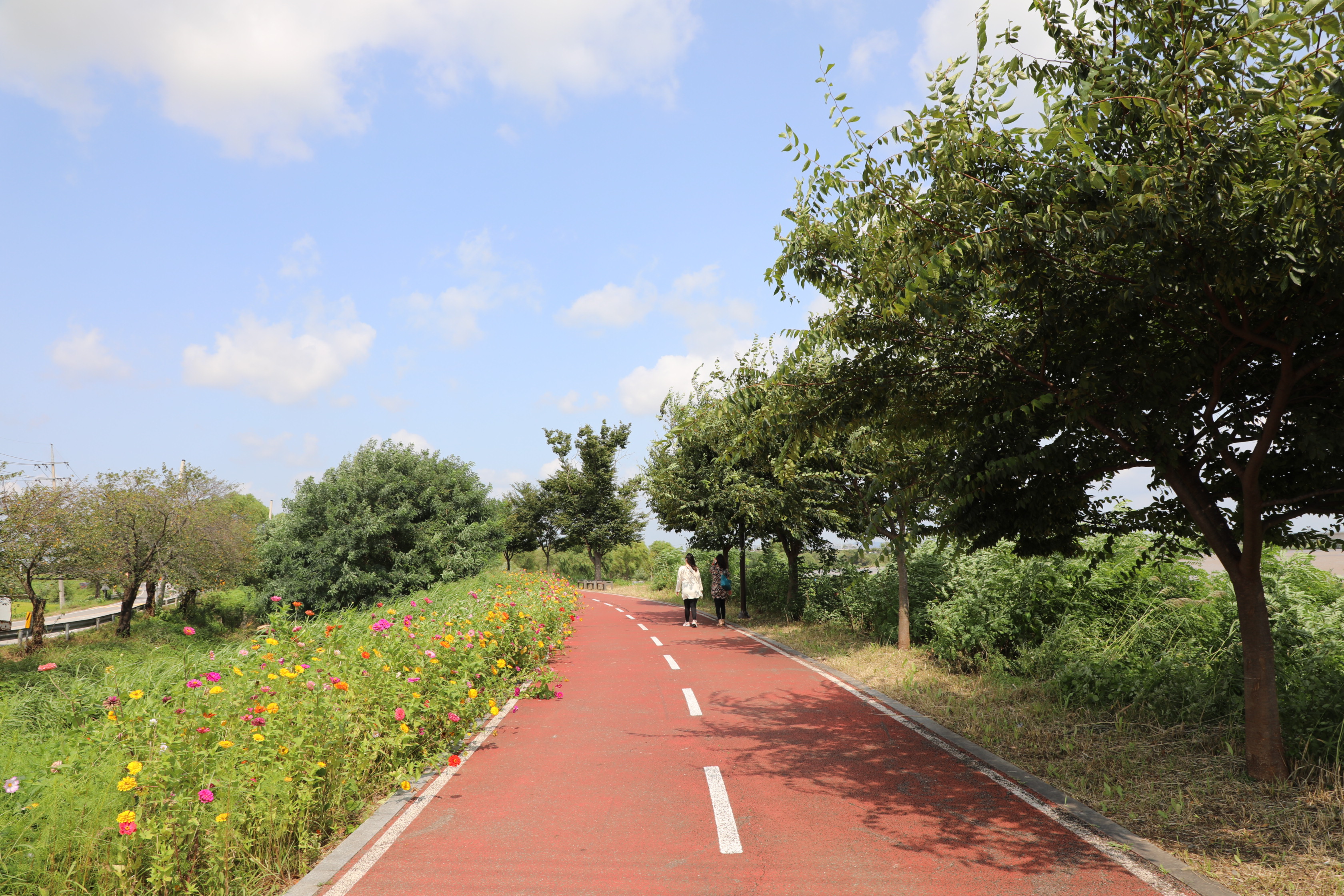 오성강변 제방뚝을 따라 걸을 땐 붉은색 아스팔트 길 옆으로 여러 종류의 백일홍이 맞아준다.