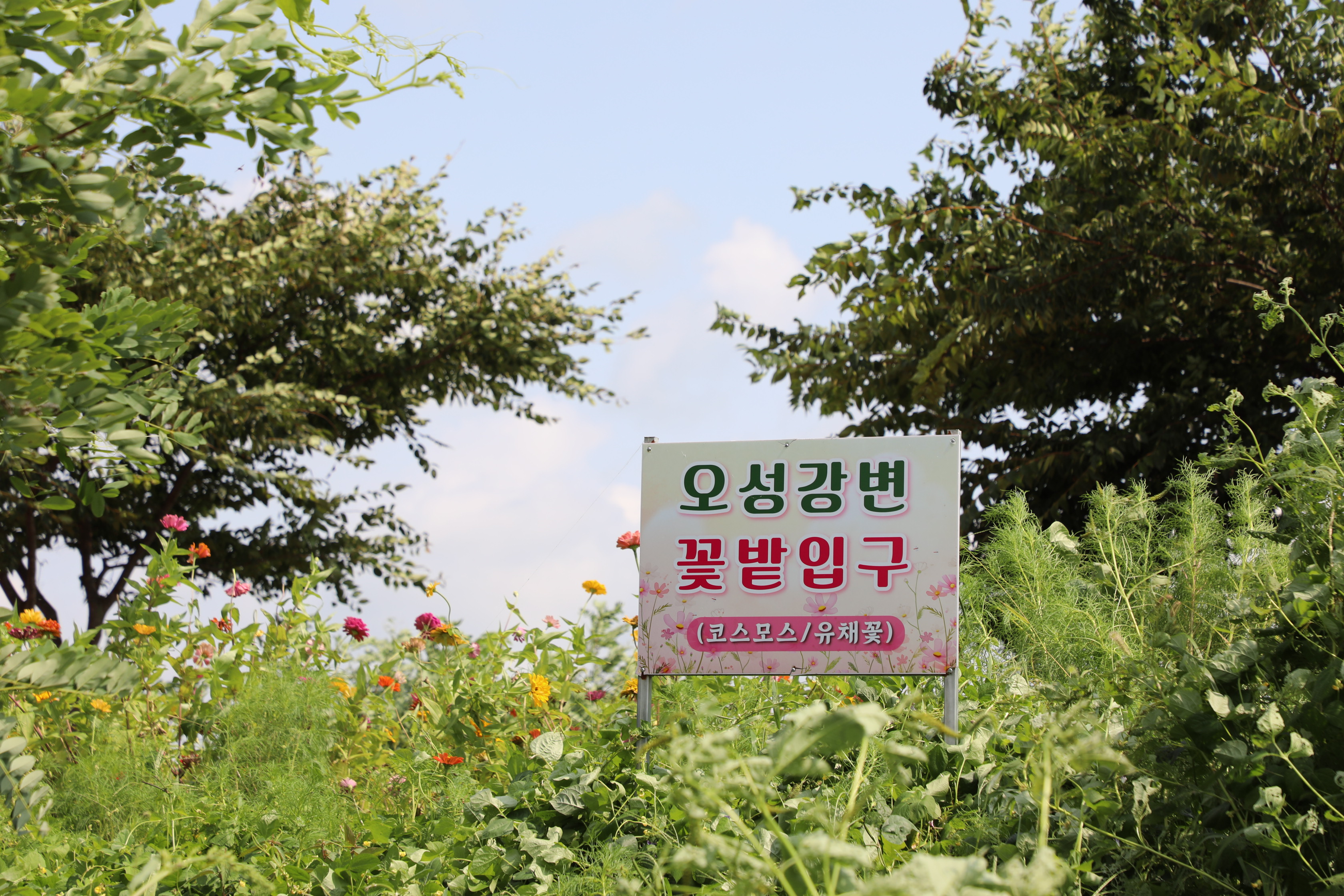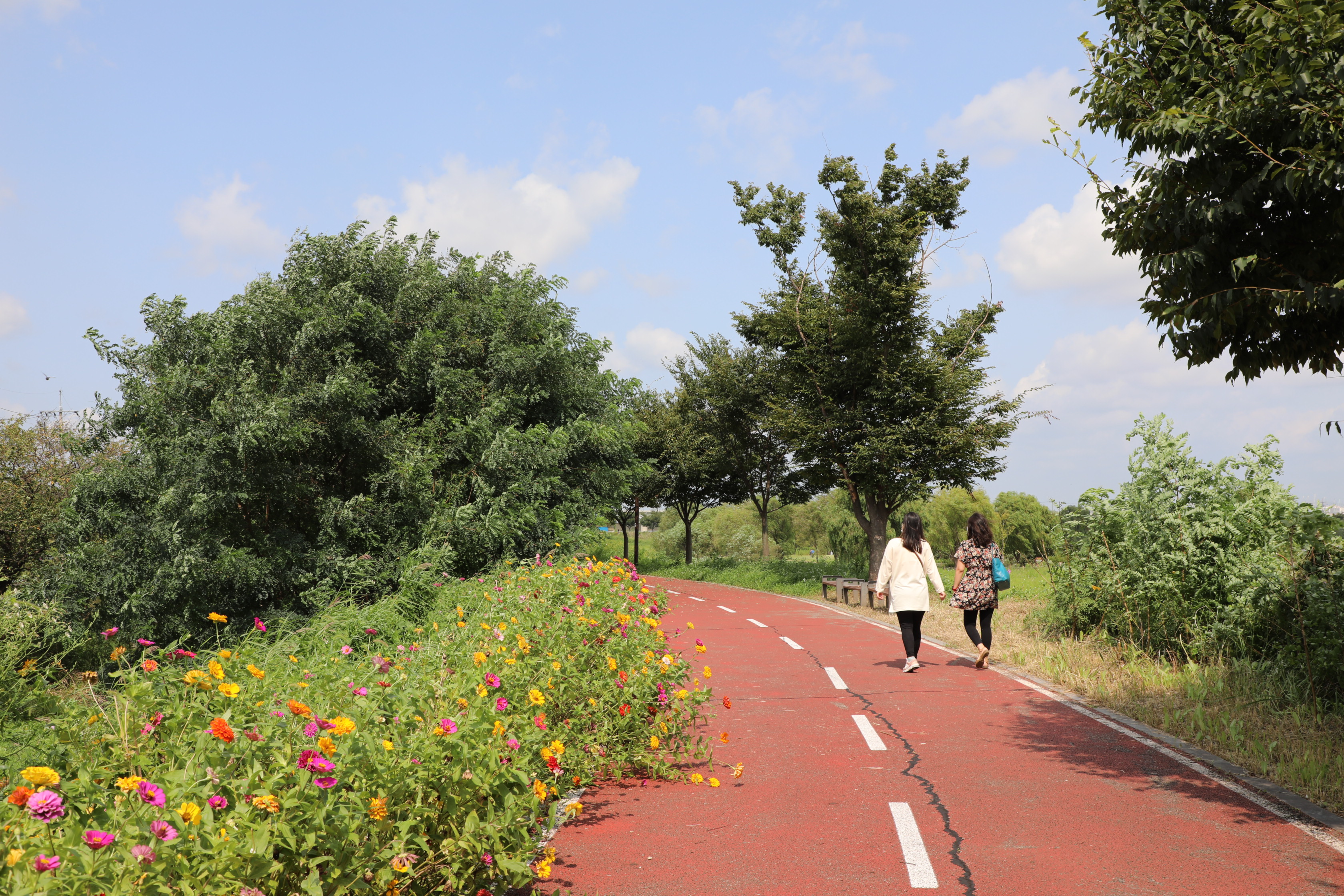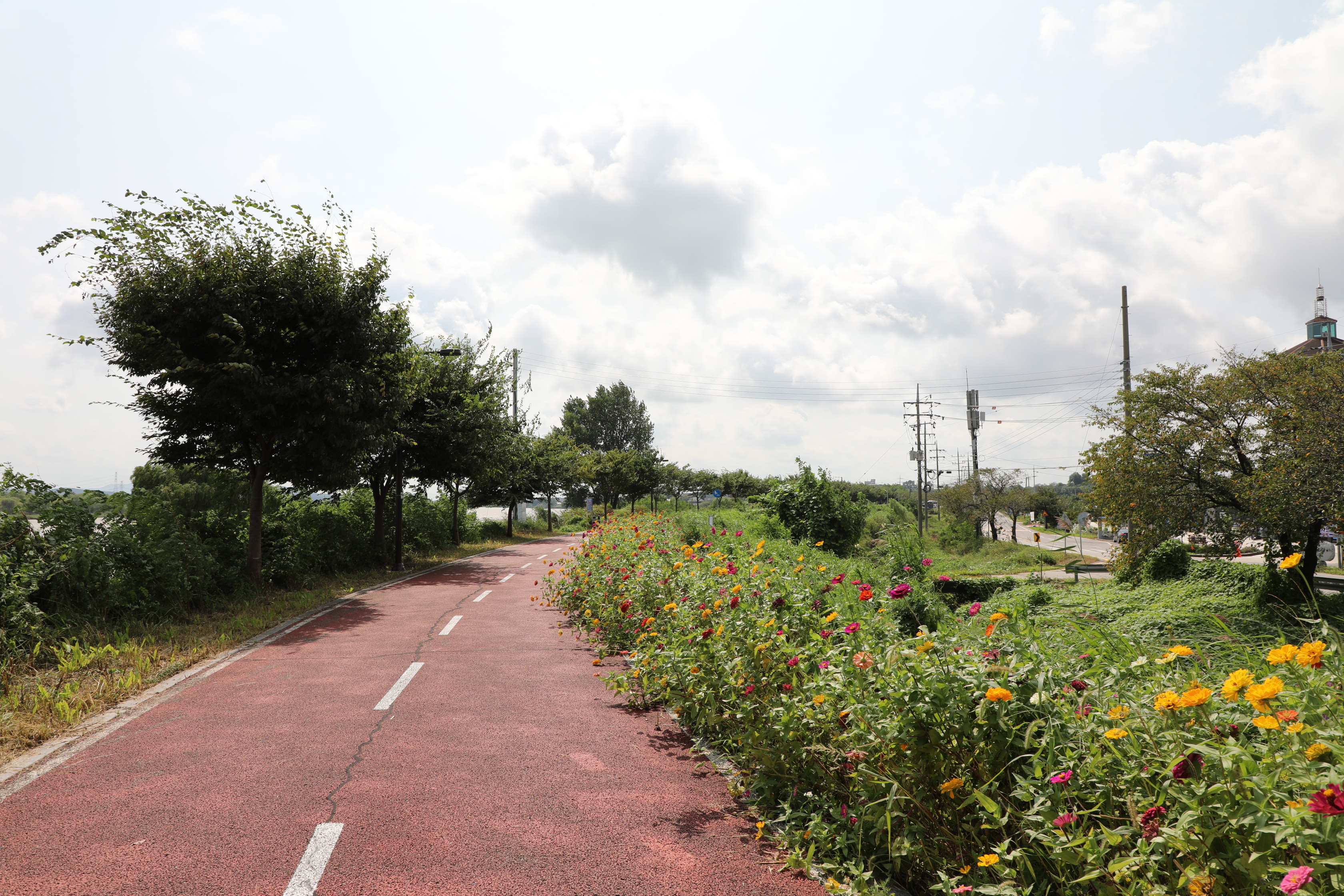 오성강변 제방뚝을 따라 걸을 땐 붉은색 아스팔트 길 옆으로 여러 종류의 백일홍이 맞아준다.