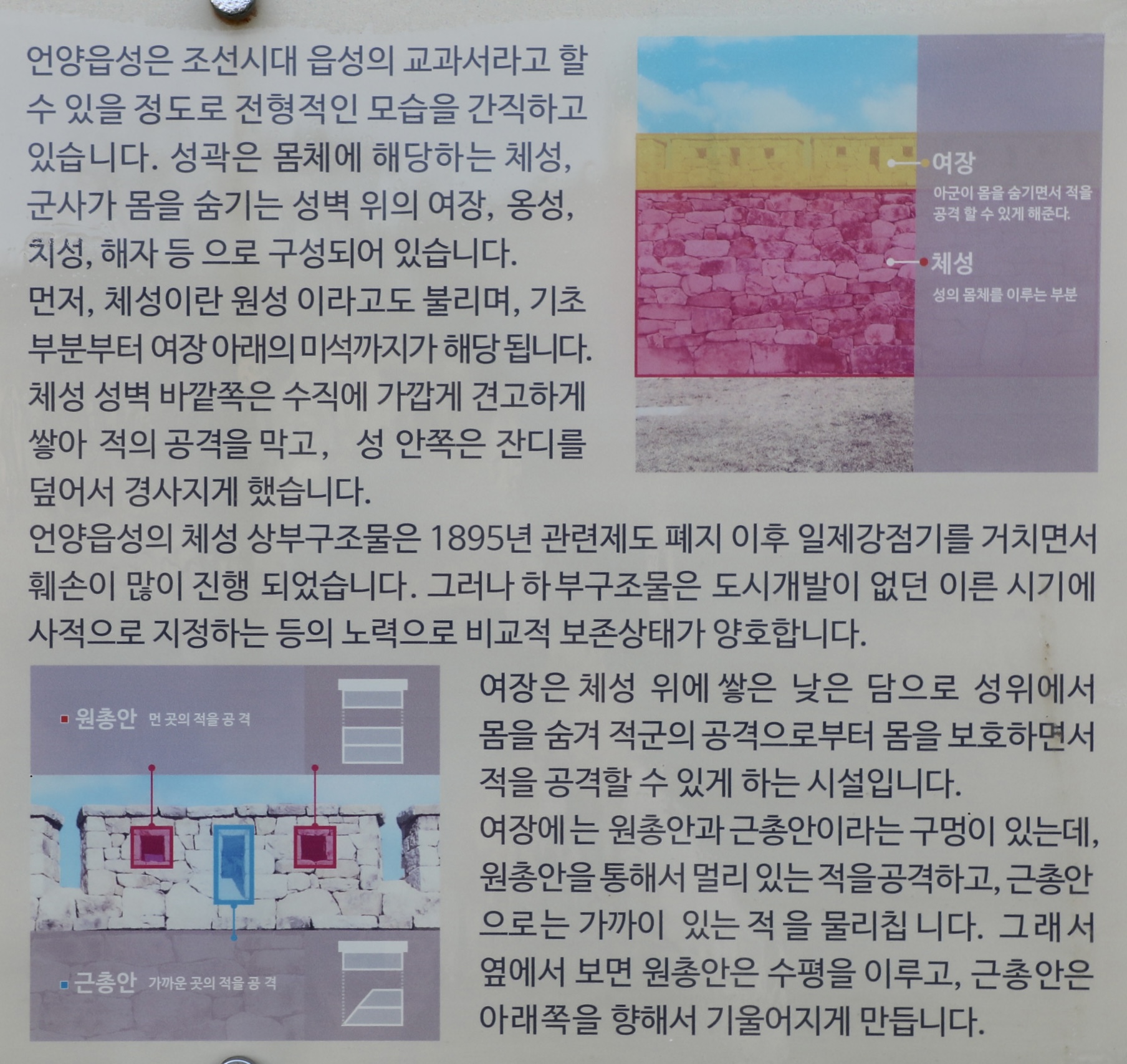 체성과 여장은 다음 안내문을 참고하고, 옹성은 성문밖에 반원형 또는 ㄷ자 모양으로 쌓은 성벽이다.