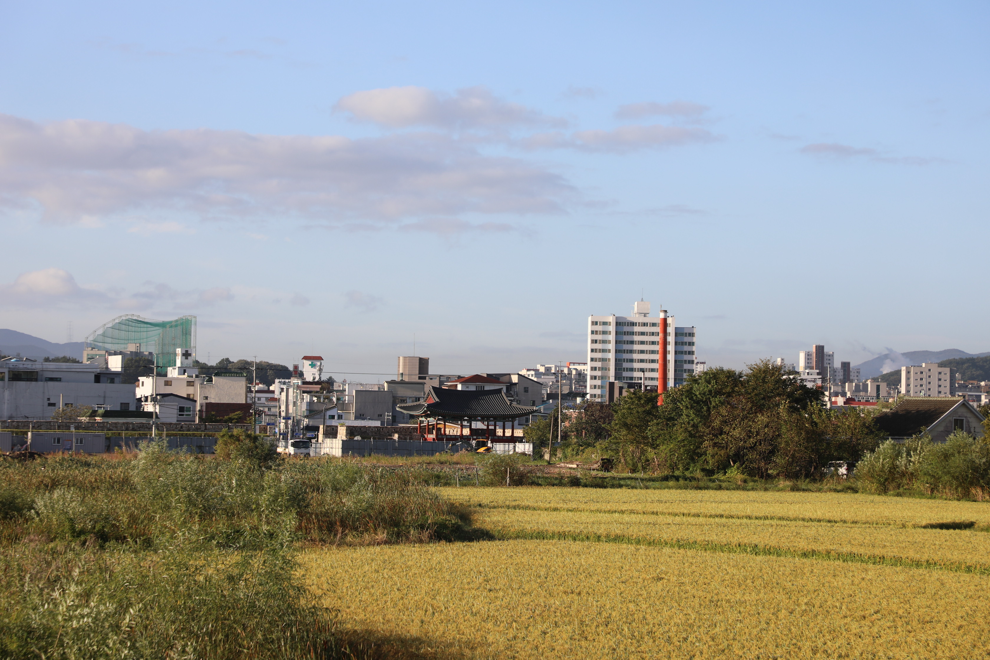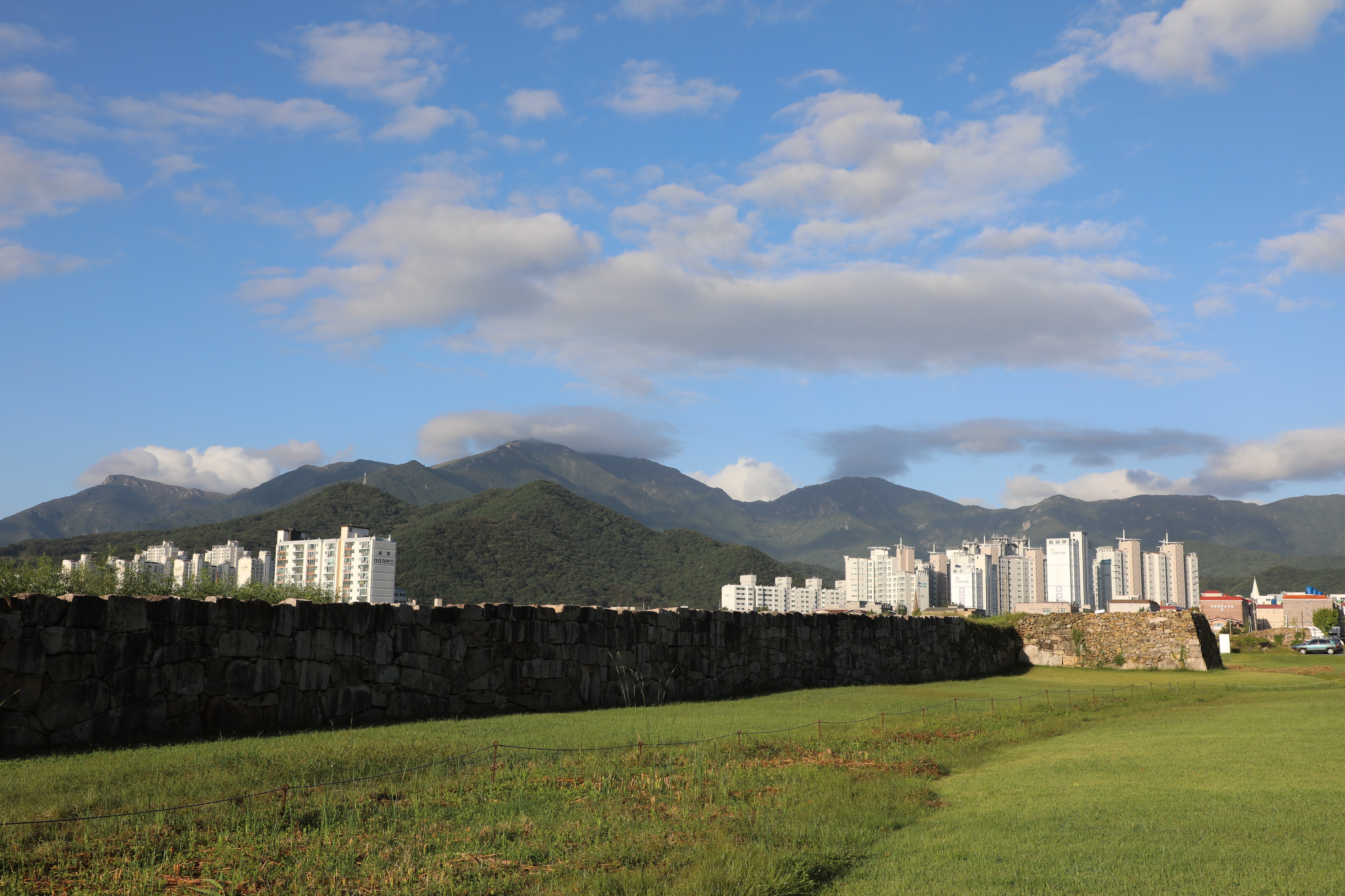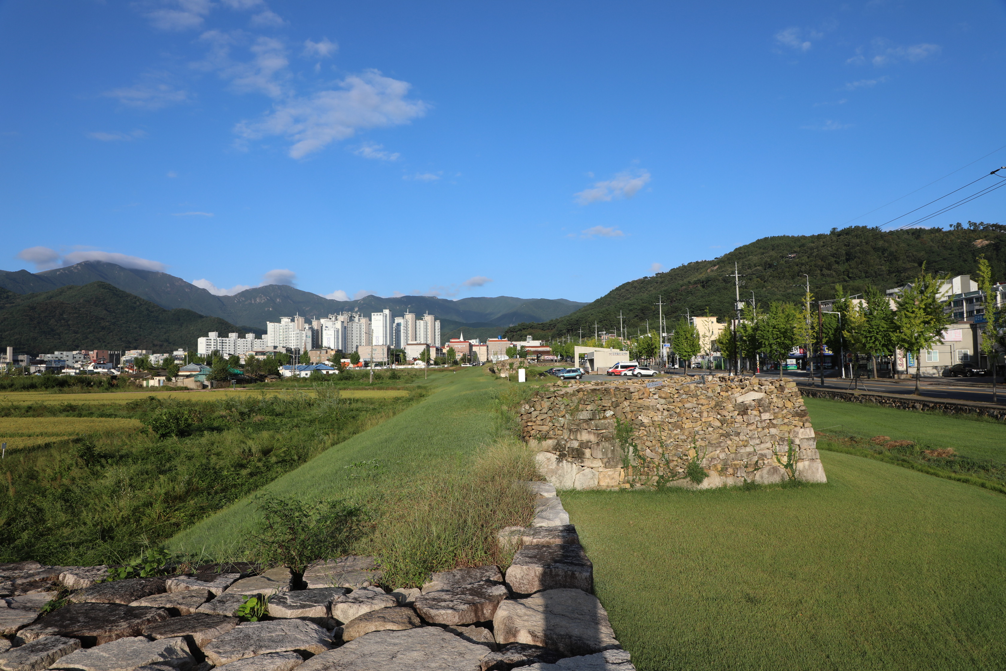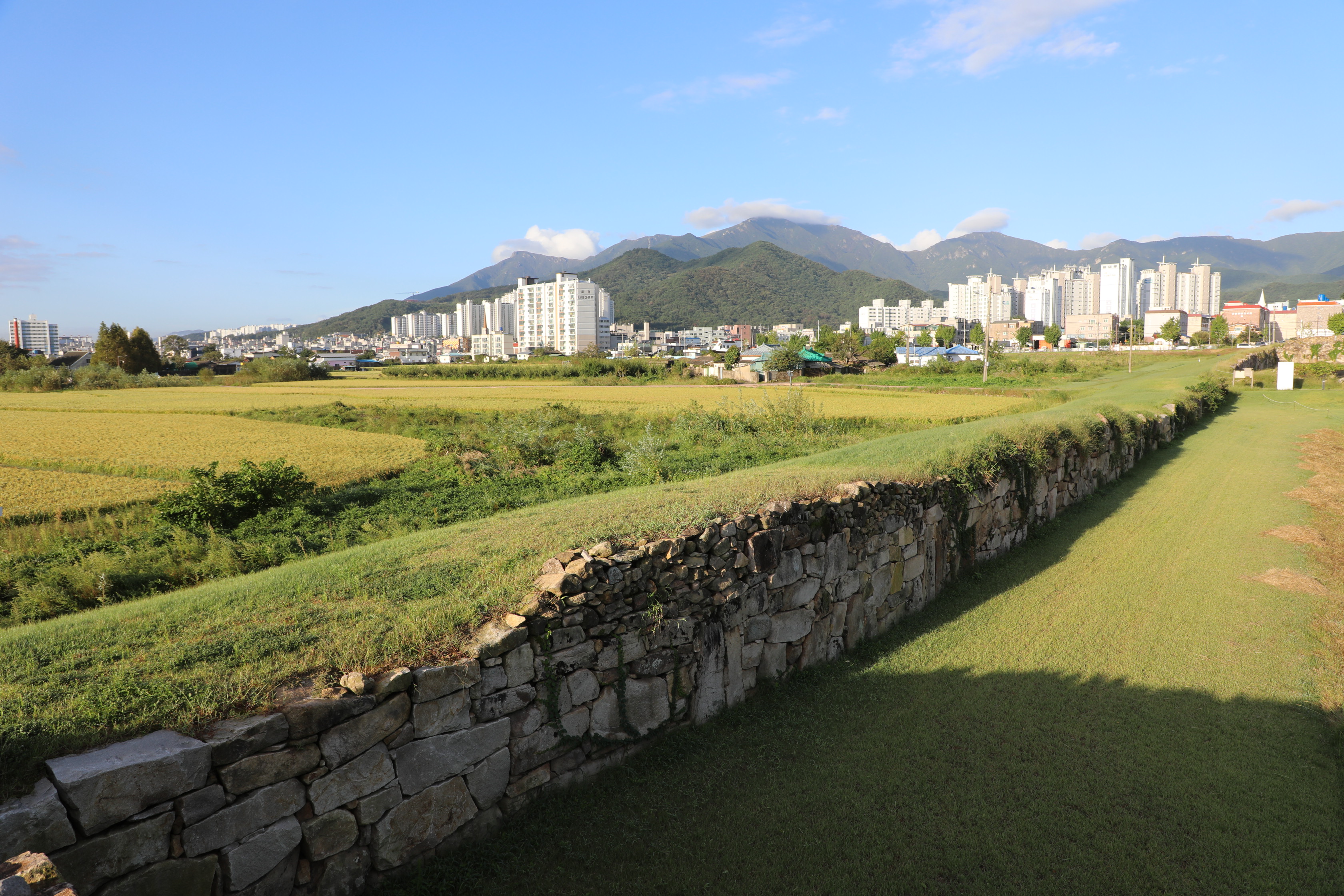 성 안쪽엔 농경지가 있고, 멀리 남문인 영화루가 보인다.