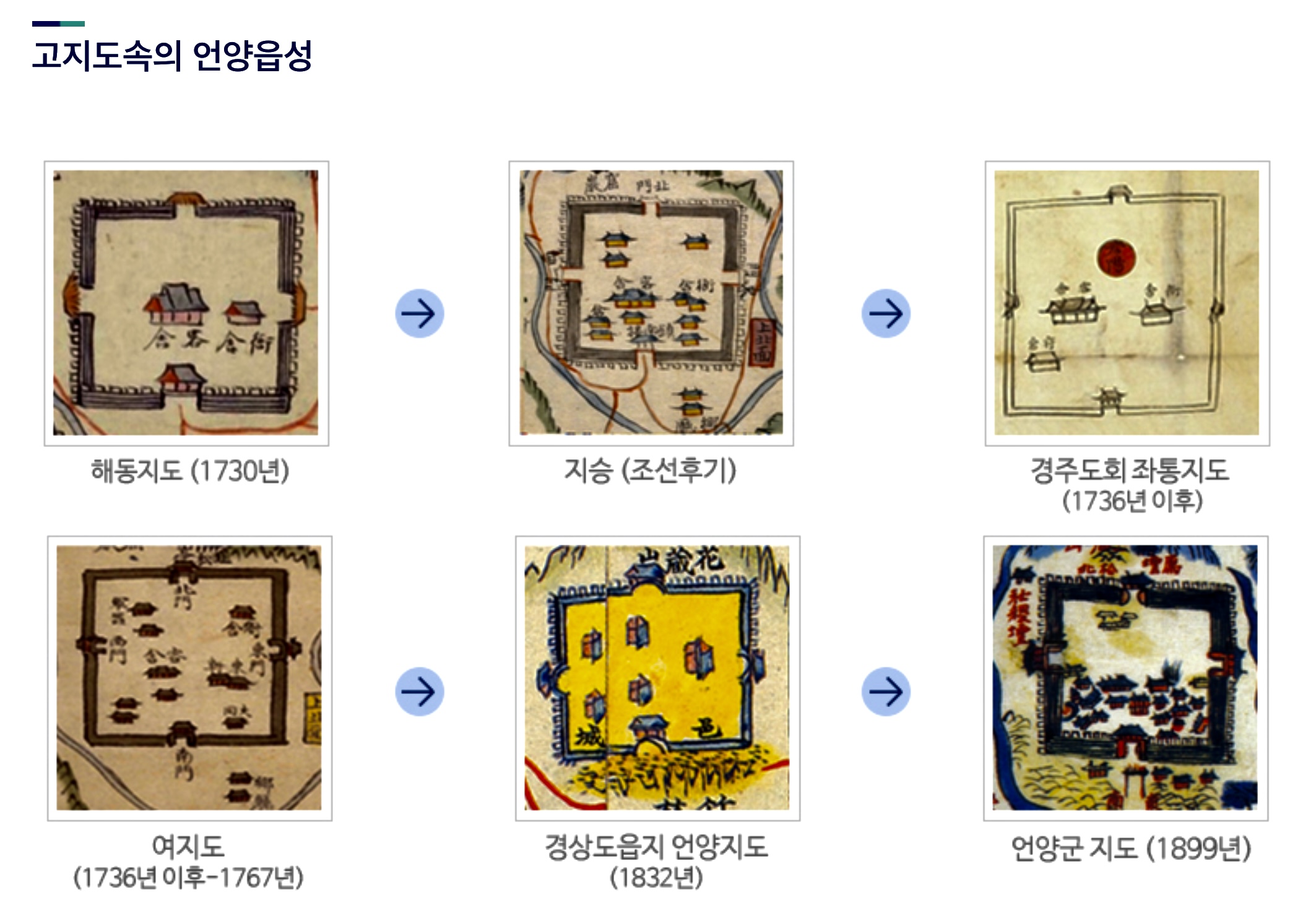 「언양군지도」에는 북문 인근의 취락지구, 남문 인근의 관아 건물들, 4대문, 읍성의 윤곽 및 여장 등성 내시설이 표현되어