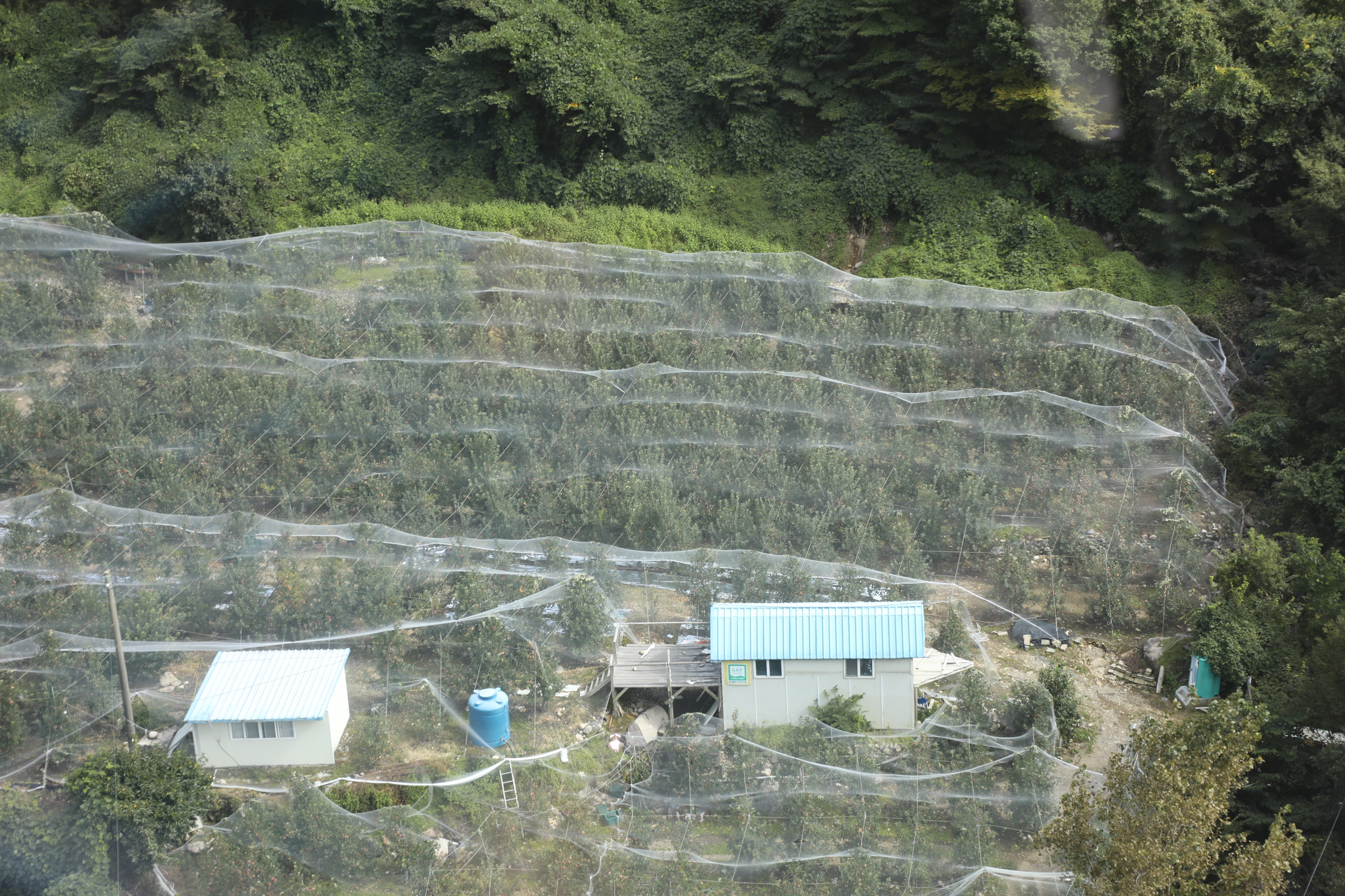 사과를 새가 쪼아 먹는 조류 피해를 방지하기 위해 그물망을 설치했다.
