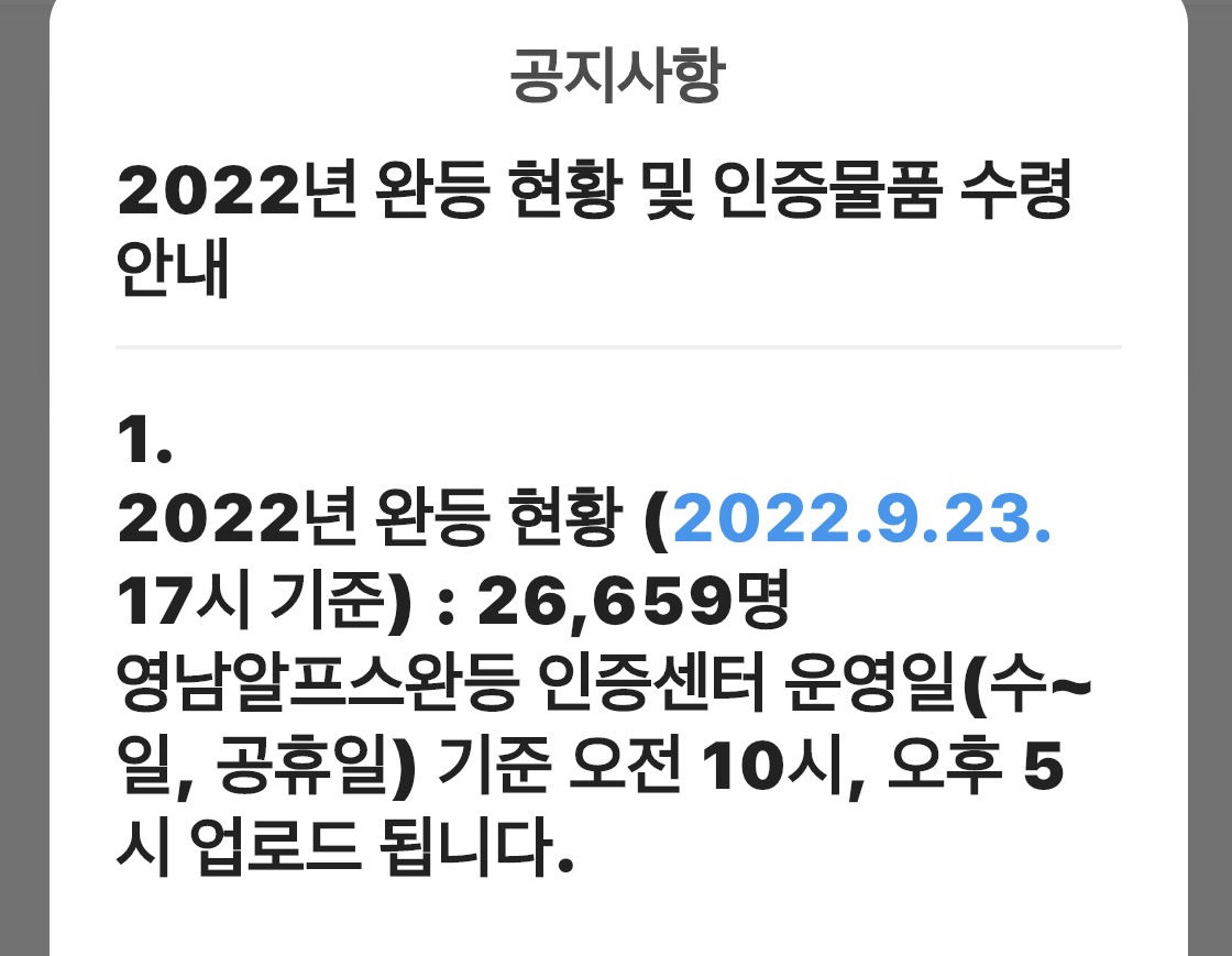 '22.10.9. 17시 기준 완등자는 28,844명으로 20여 일 만에 2,300명 가까이 숫자가 올라갔다.