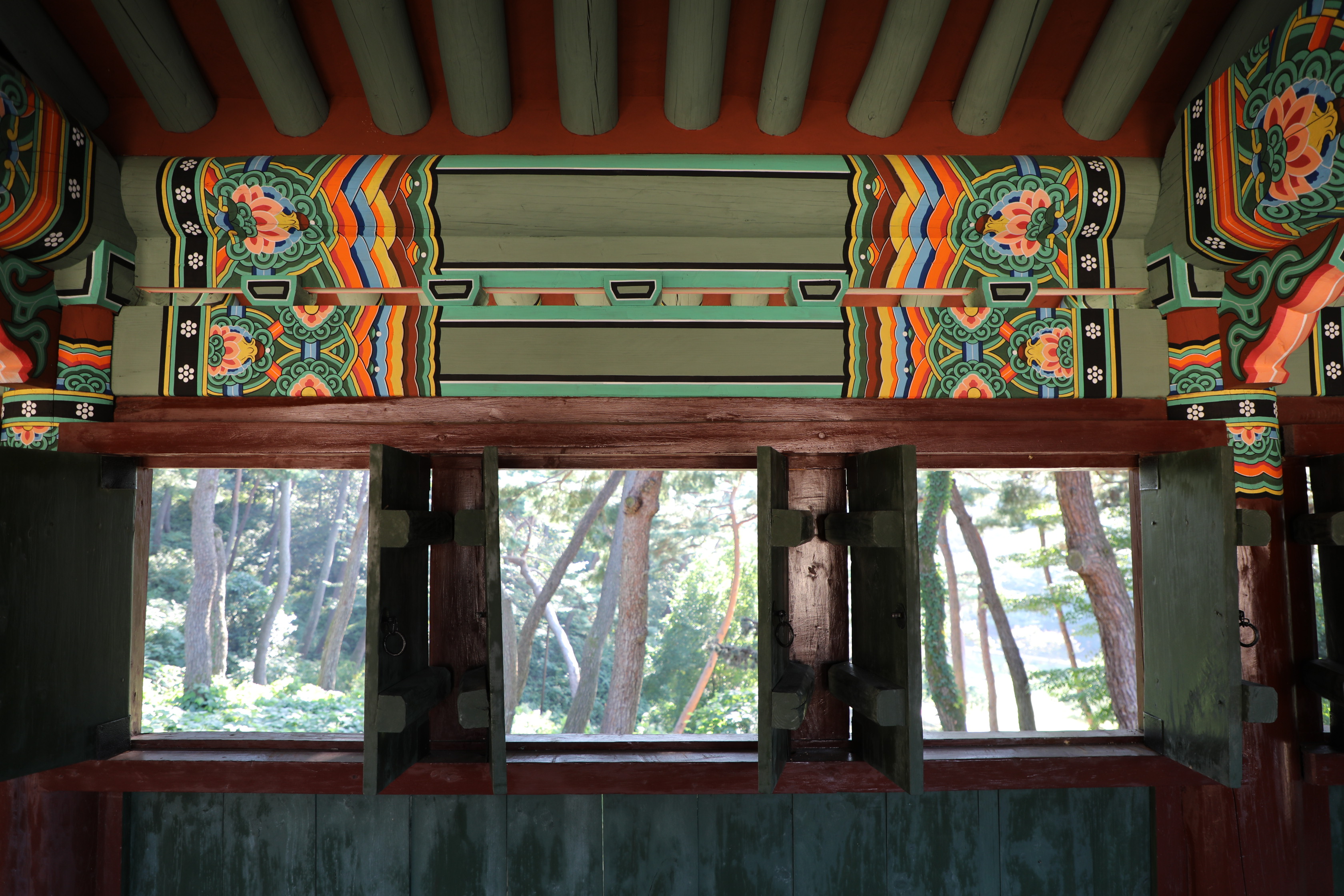 등양루의 창문을 토해 보는 성 안 소나무 숲