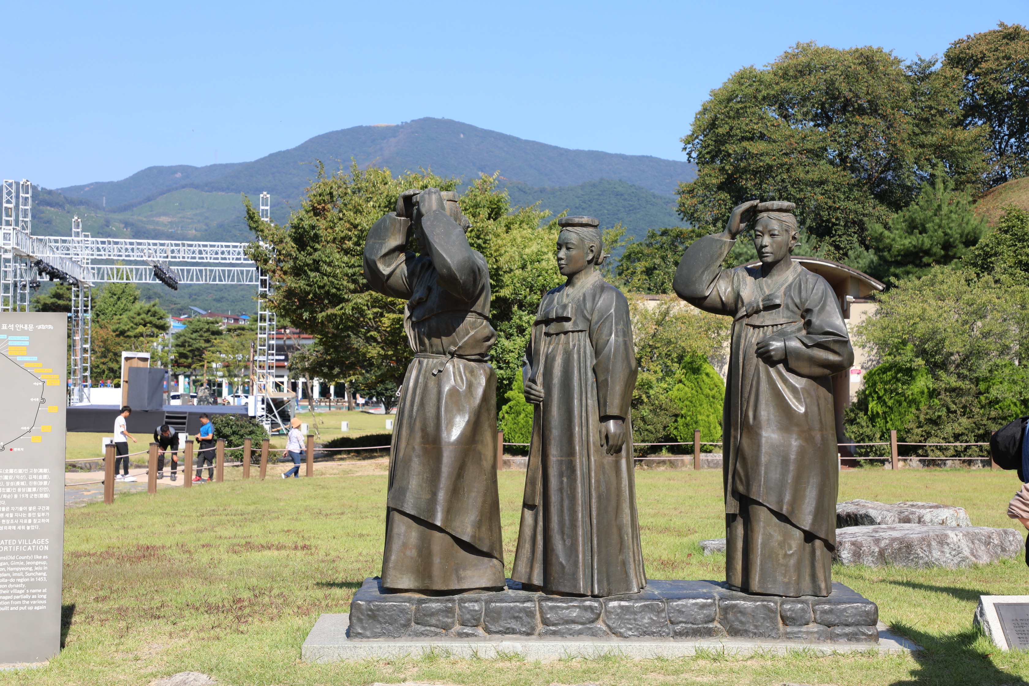 고창읍성 앞 공원에 여성들이 돌을 머리에 얹고 답성 놀이하는 조형물을 세웠다.