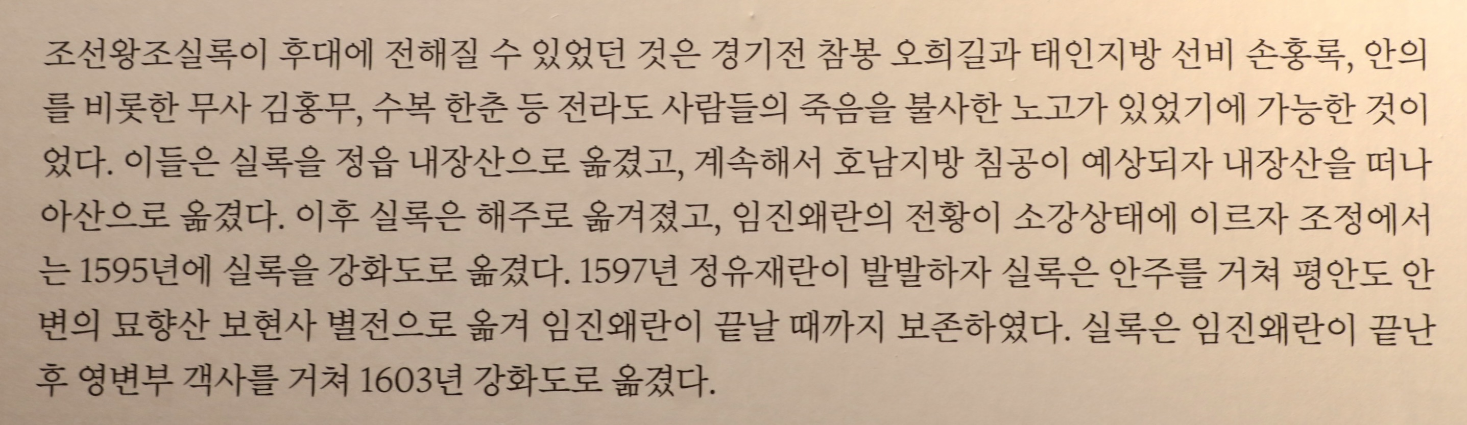 실록의 편찬은 역사의 기록이면서 최고 통치자와 위정자들에 대한 견제와 감시였다. (안내문)